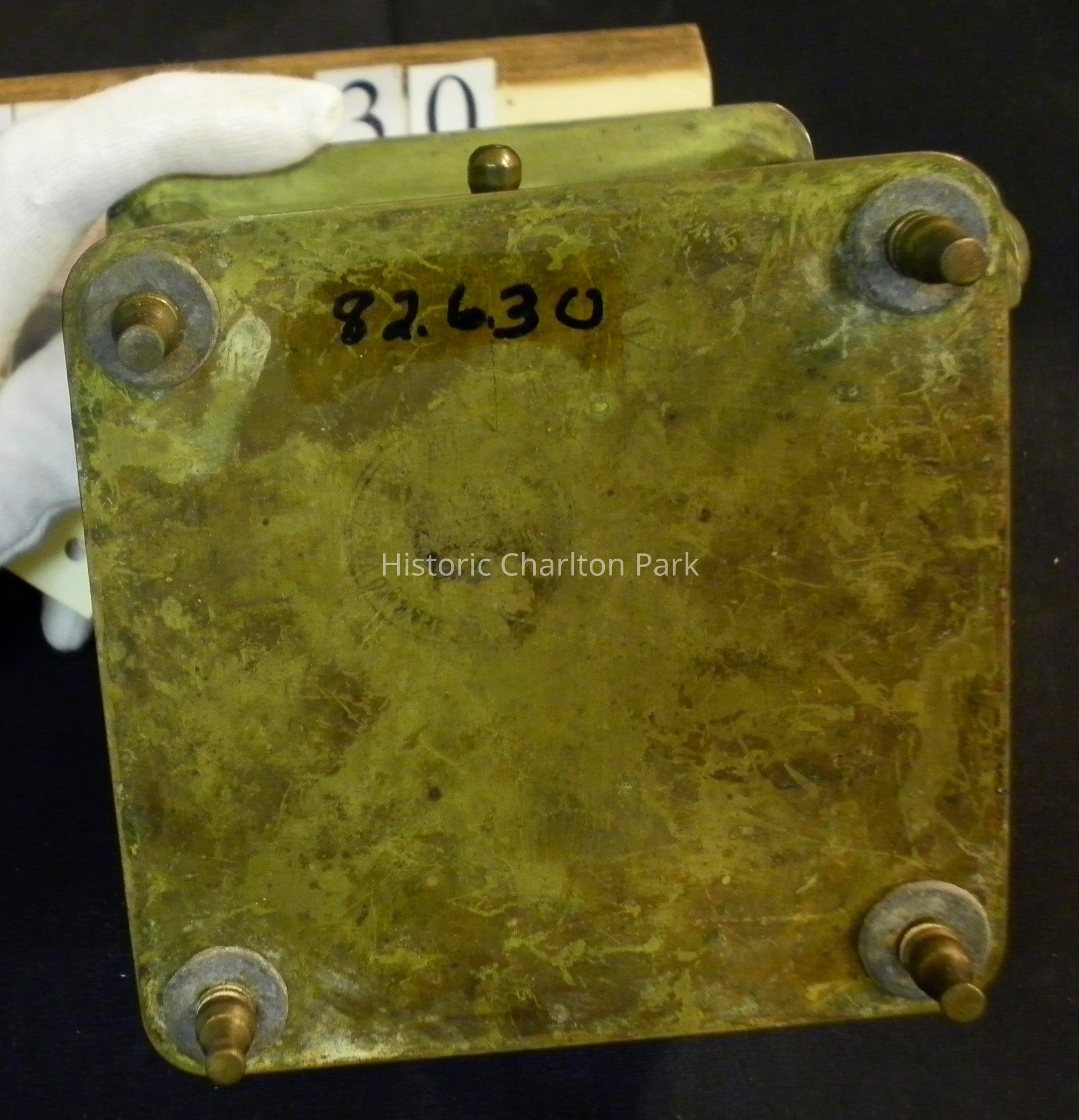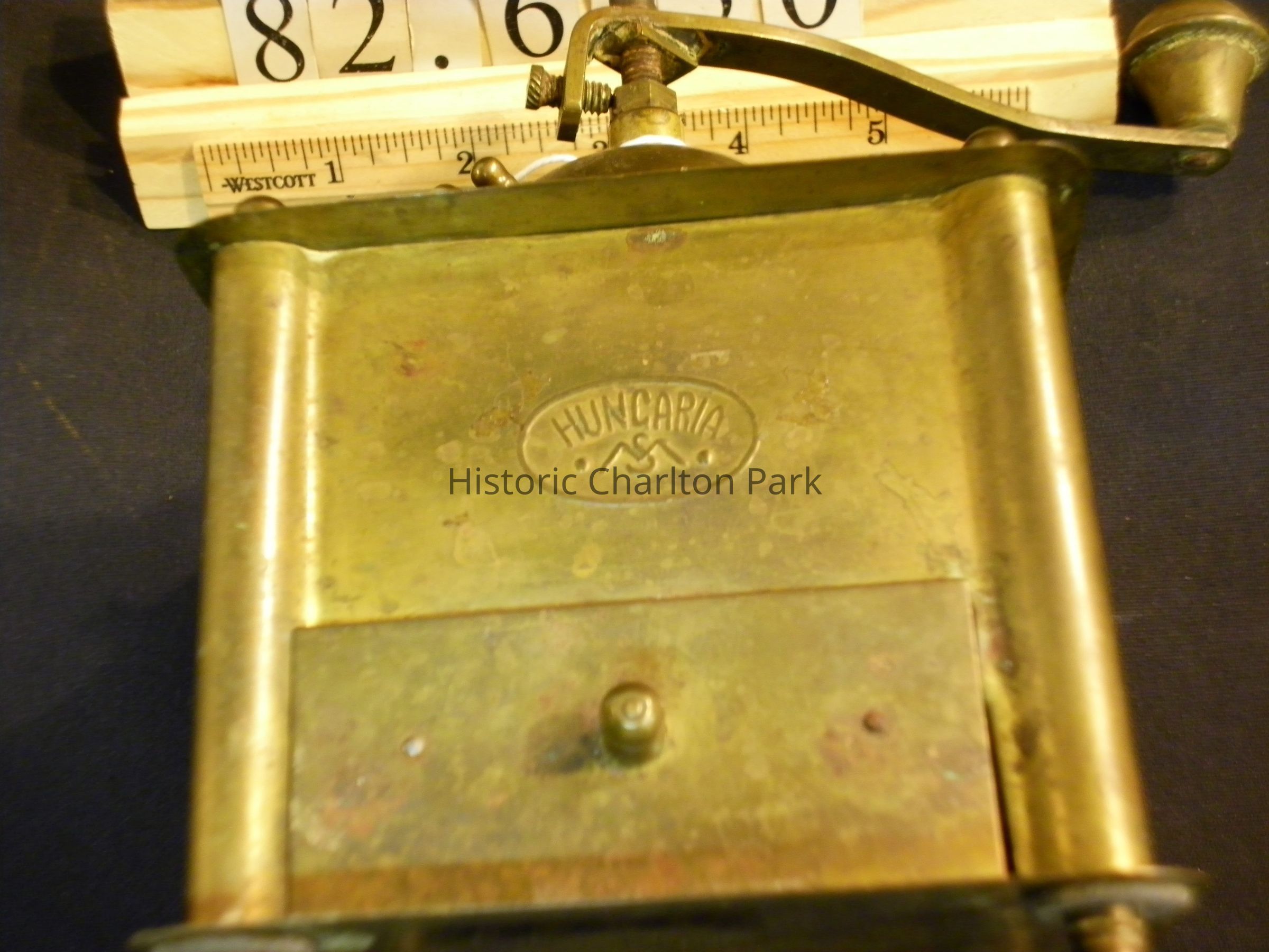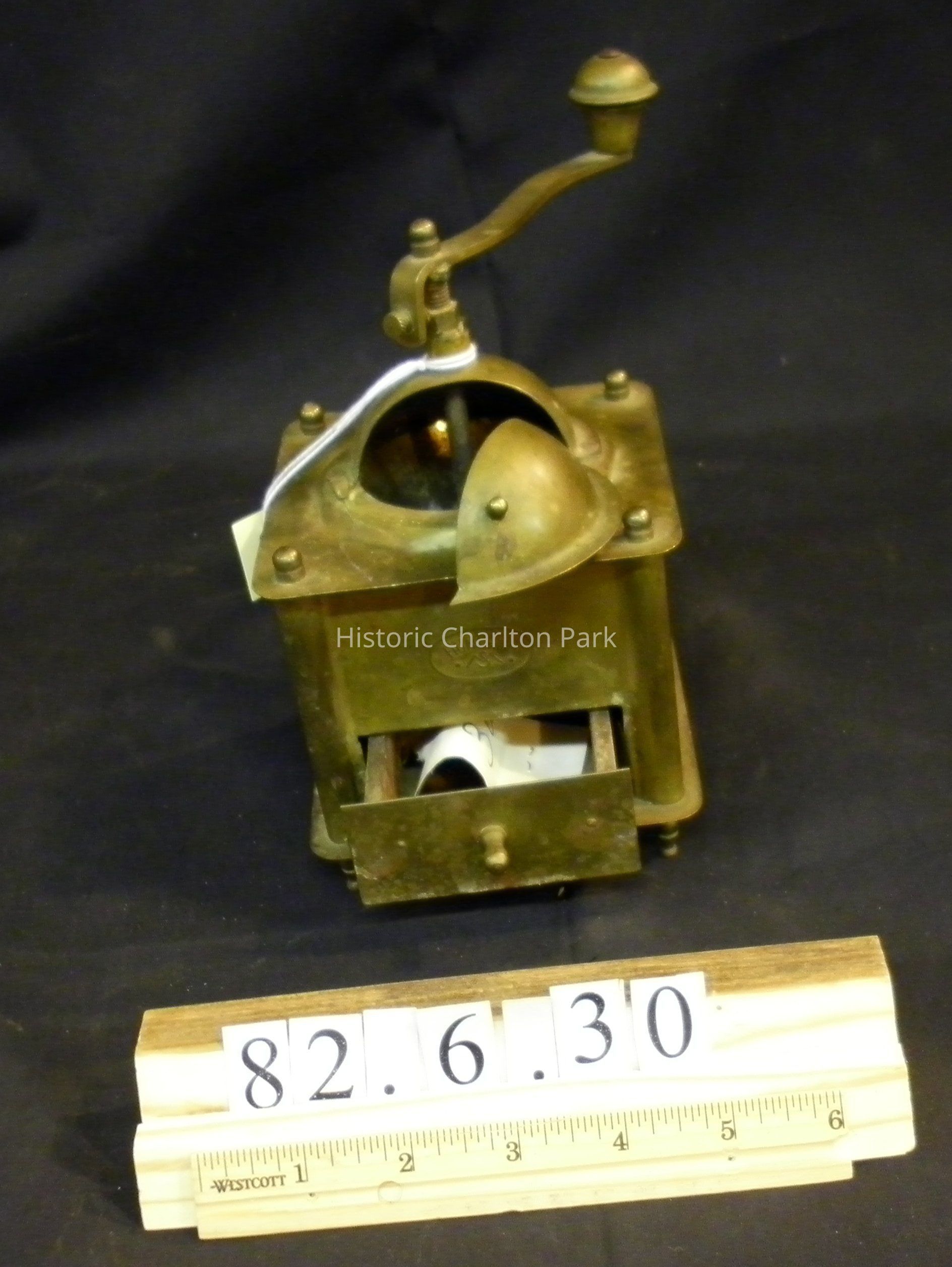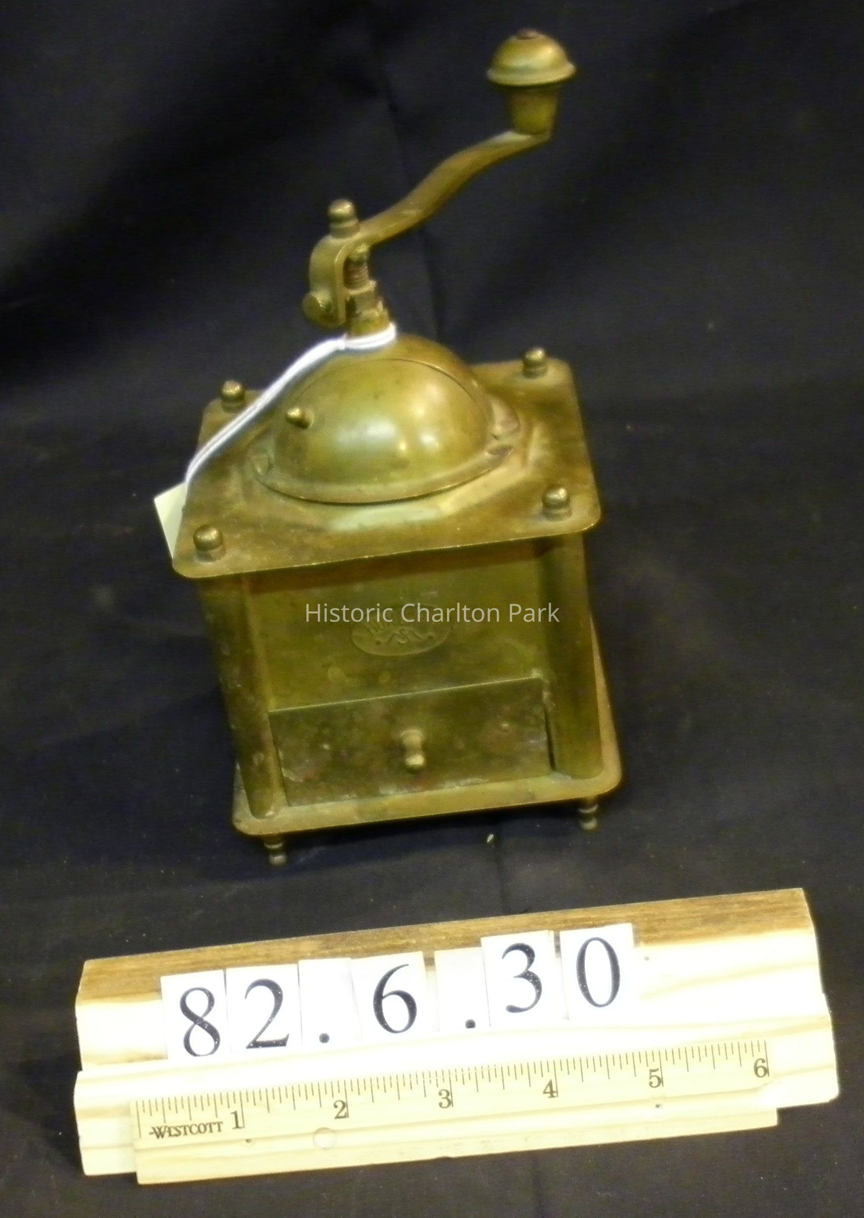 Brass box, hopper and handle. Stamped on front: oval with design and "HUNGARIA". Wooden drawer inside, fronted with brass. Stamp on bottom, probably manufacturer's stamp, but cannot read. Four small feet. Hinged opeing to put beans in. Dimensions 7 1/2" x 4 1/2".Acquisition