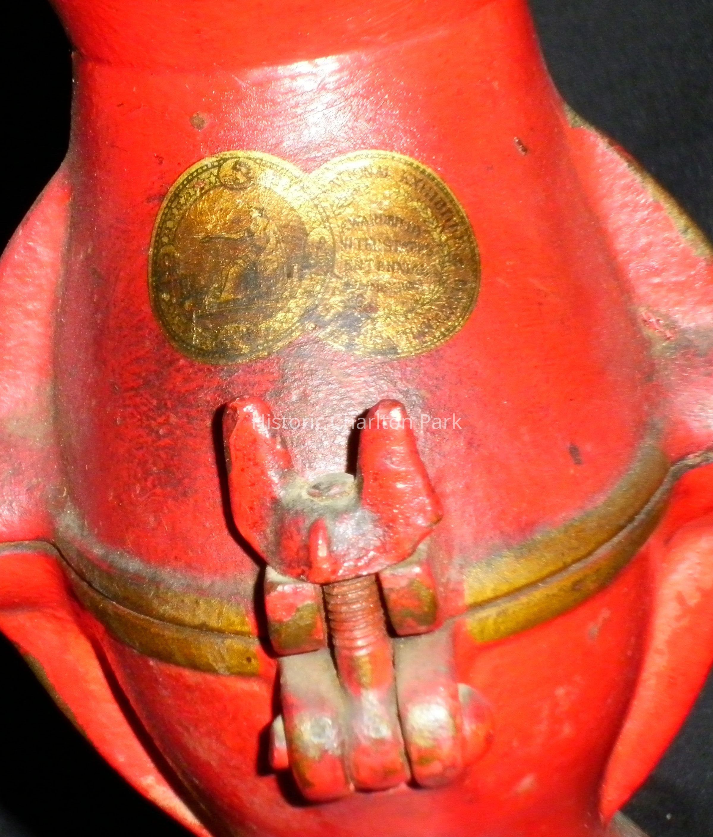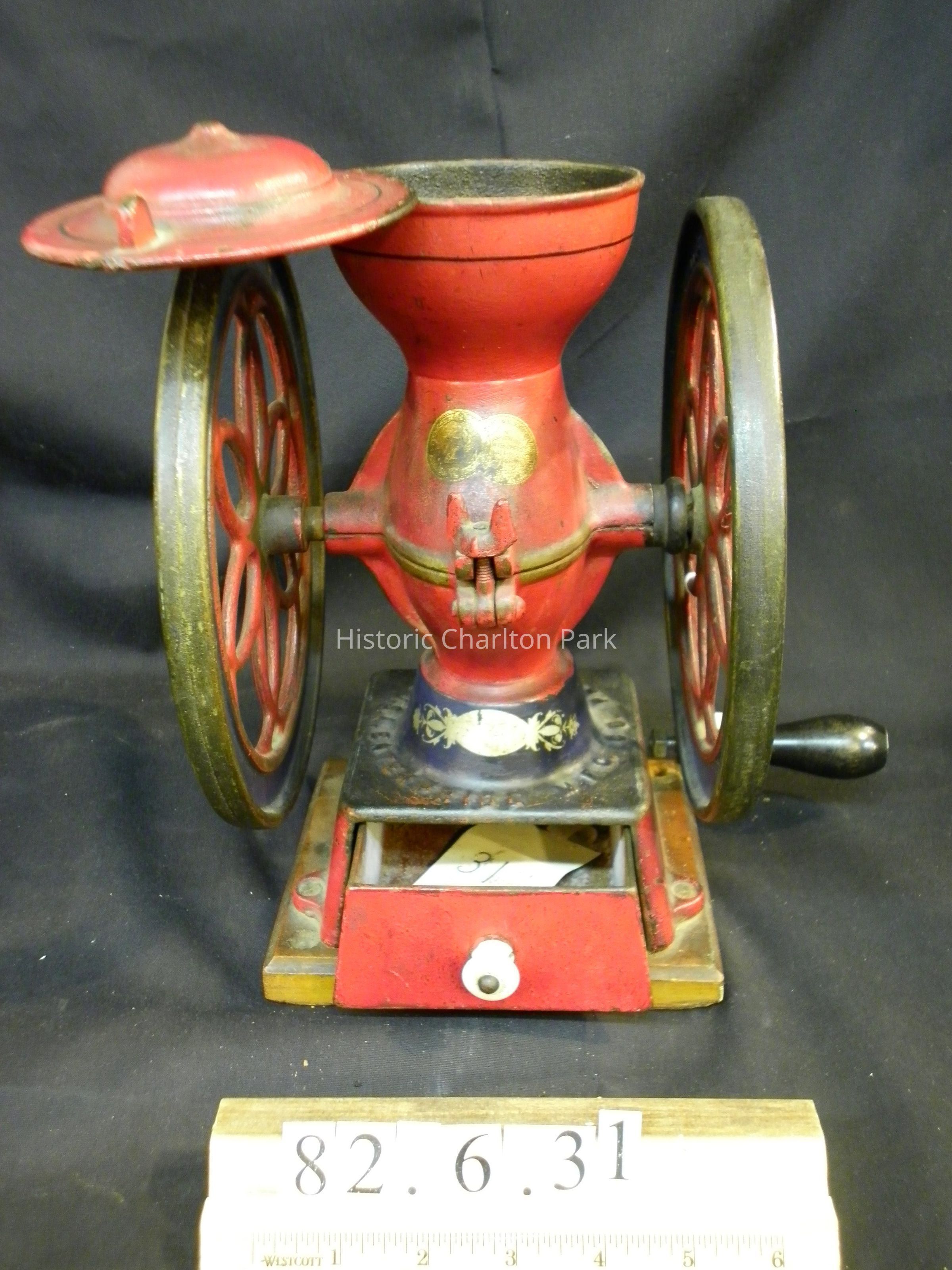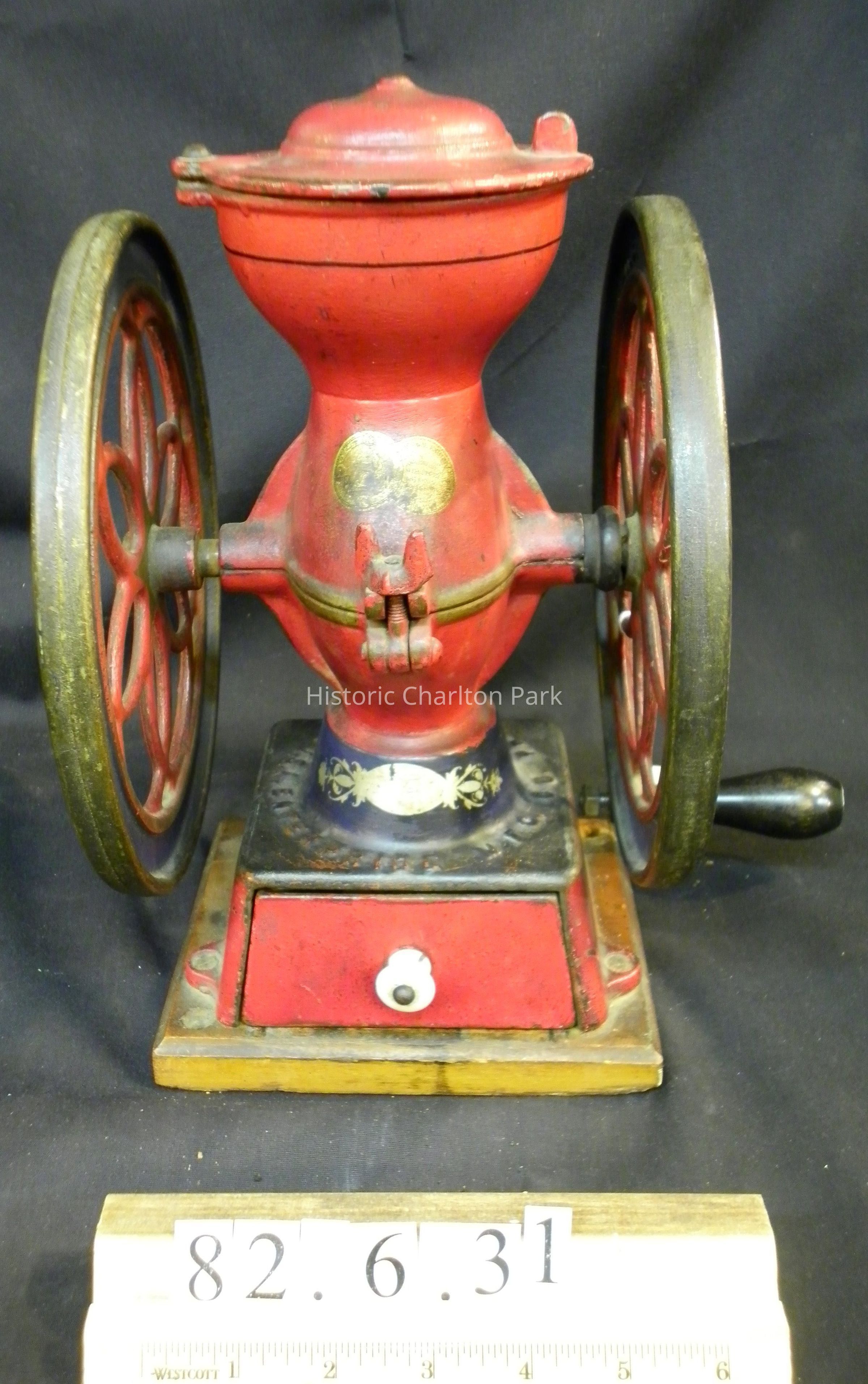 Enterprise No. 2 red cast iron coffee mill. The wheels on both sides are each 8 3/4" diameter. Inside wheel is the number #2007, and the number #2006 on the drive wheel with the handle. The front of mill has seal of two gold coins; the left has a seated female in Grecian apparel. The right coin states "National Exhibit" across the top. Center of right coin states "Award --------- United States Patent Pending" and a date in Roman Numerals - date not clear - perhaps 1877. There is a porcelain handle on the drawer.