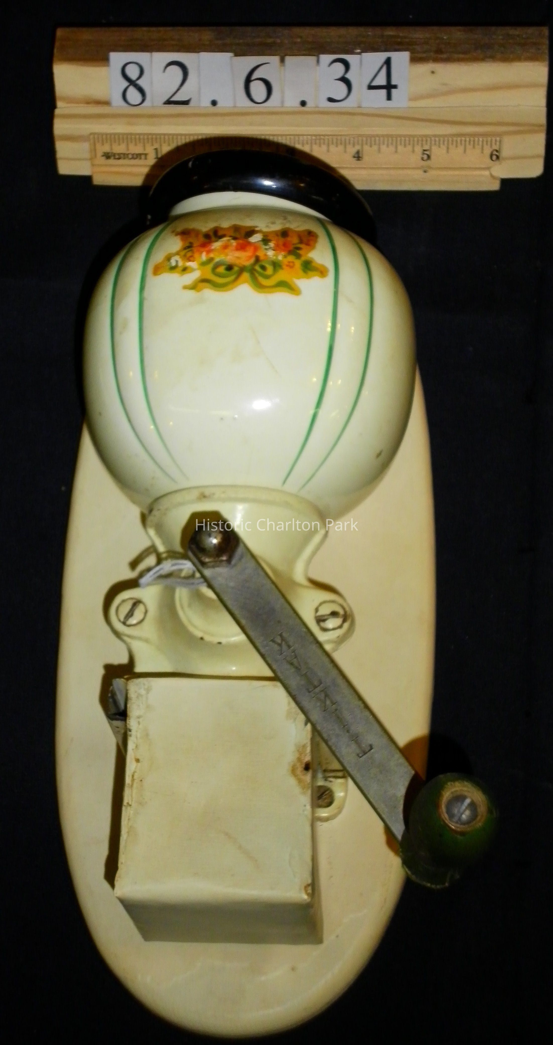 Wall mounted coffee mill, cream color. China ceramic hopper with a decal of pink roses and green ribbon. Metal gear box with a metal cup, and calibration wheel behind the grinder. It has a round black wooden lid and "TIKTAK" is engraved on the handle.