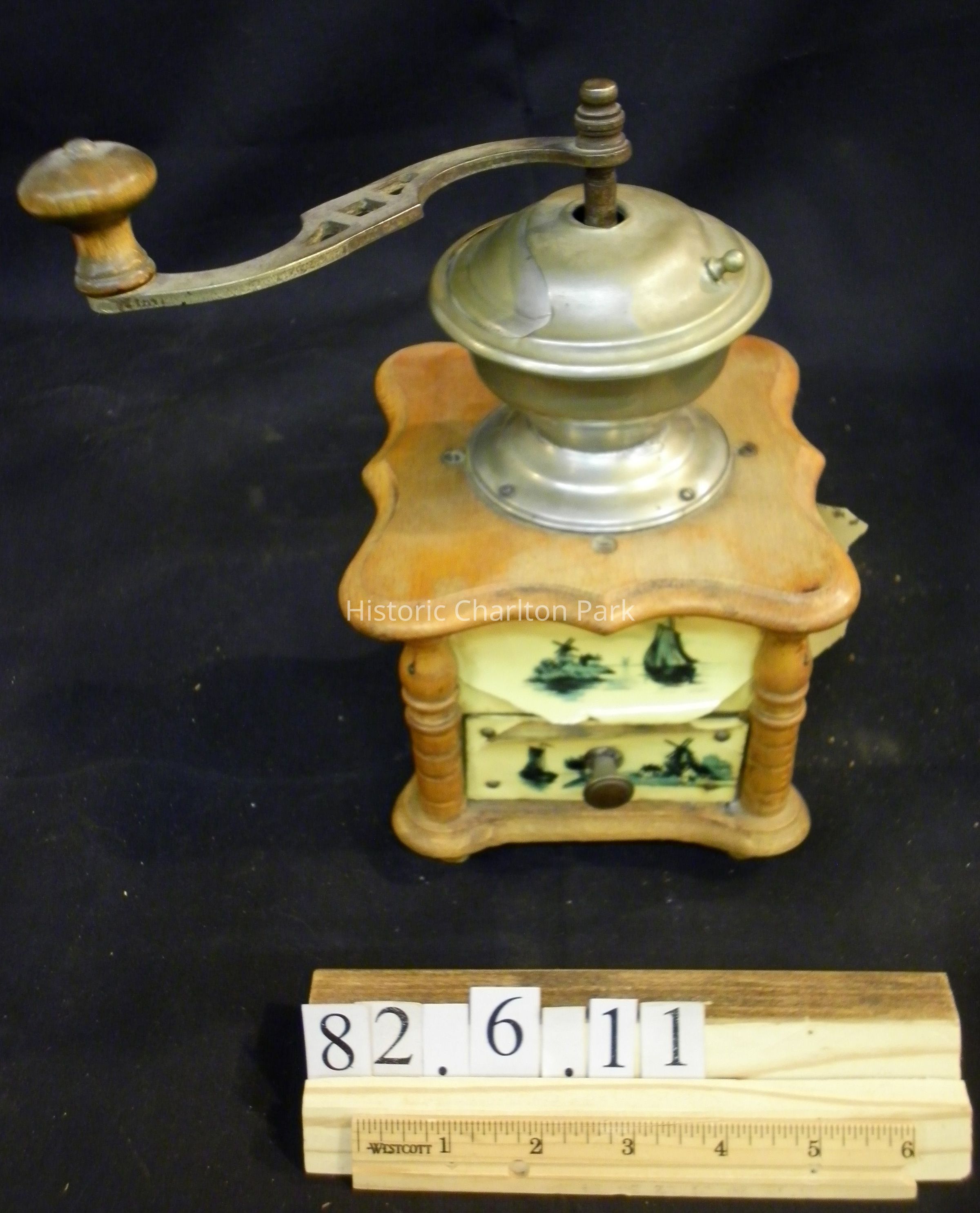 Wood and celluloid coffee grinder covered with paper with blue Dutch-type art on each panel. The paper is peeling off on 2 sides. The drawer in front has a metal knob. The handle on the end of the crank is wood and the hopper is metal.