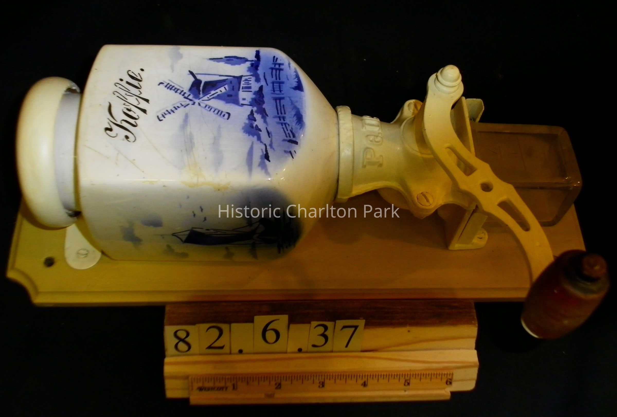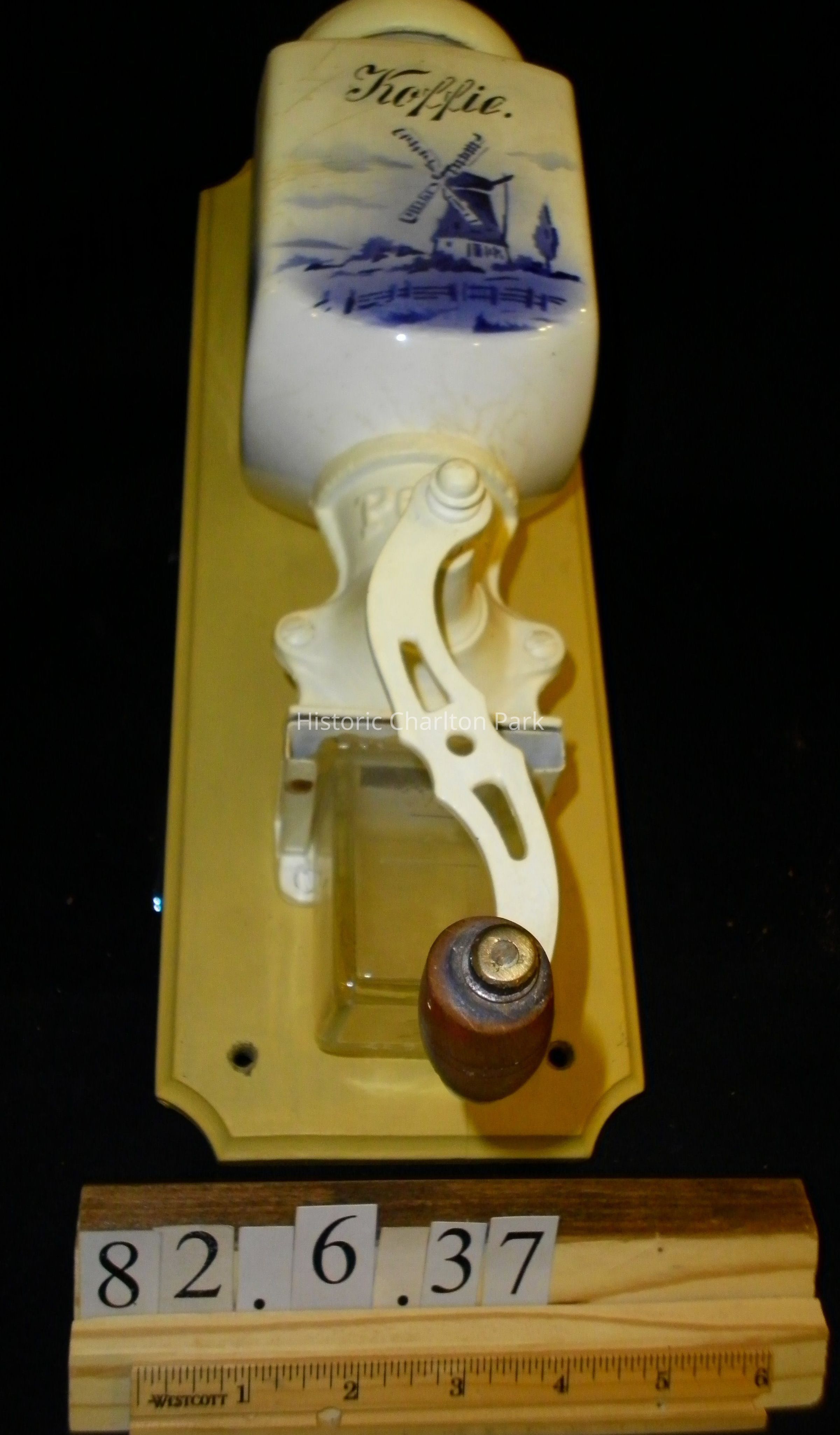 Wall mounted coffee mill with a china hopper and blue Dutch-type designs on each side. States "Koffie" on front. The wood and metal are painted a cream color. The mill has a wooden lid, metal gear box, and a rectangular glass container held beneath gear box. Wooden knob on handle. The text embossed on the mill is, "Pe De".