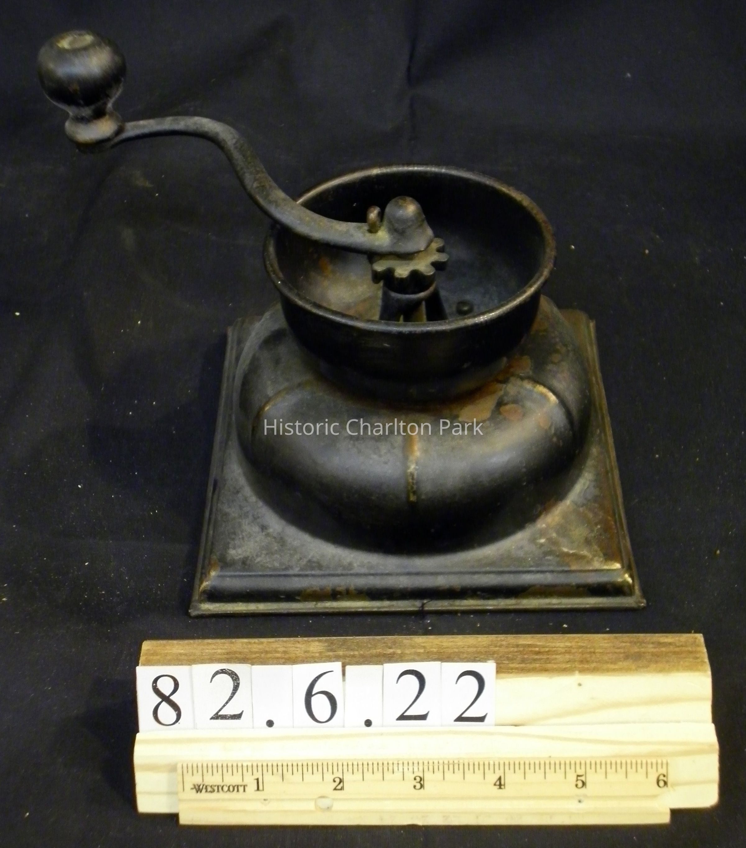 Black cast iron coffee mill made out of a sheet of metal. There is an interior cup and a round hopper.
