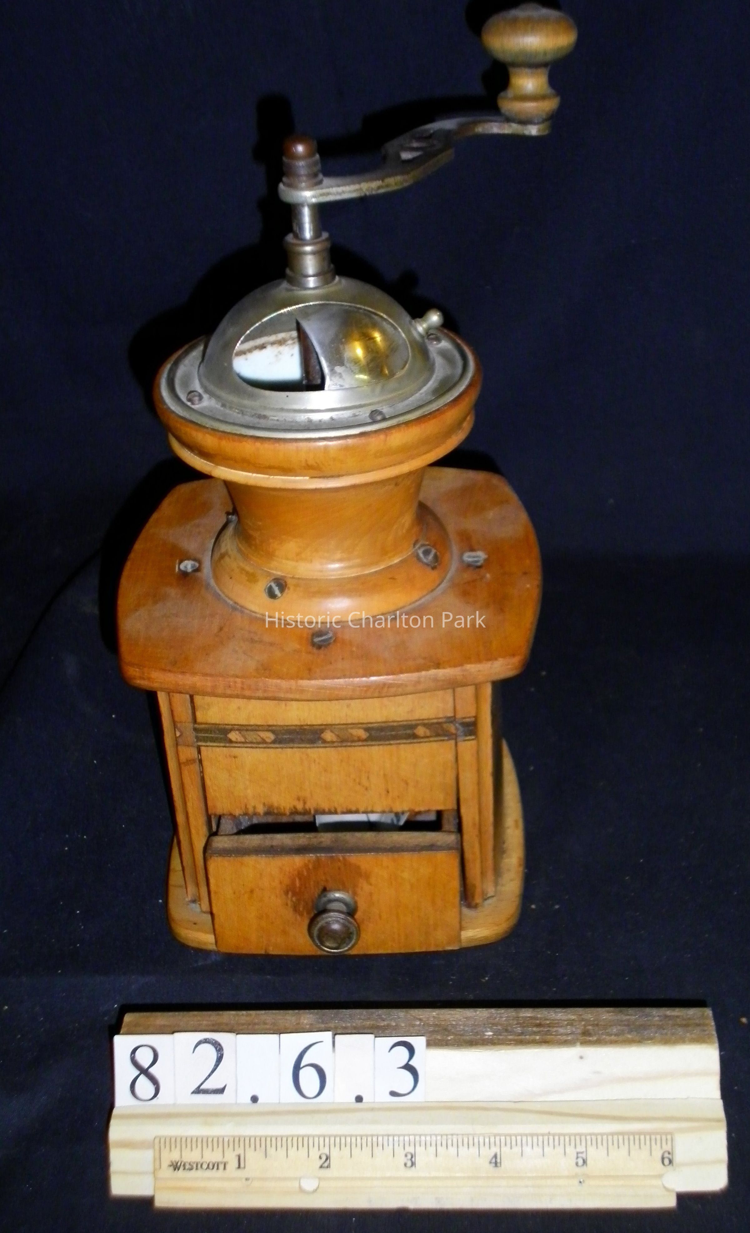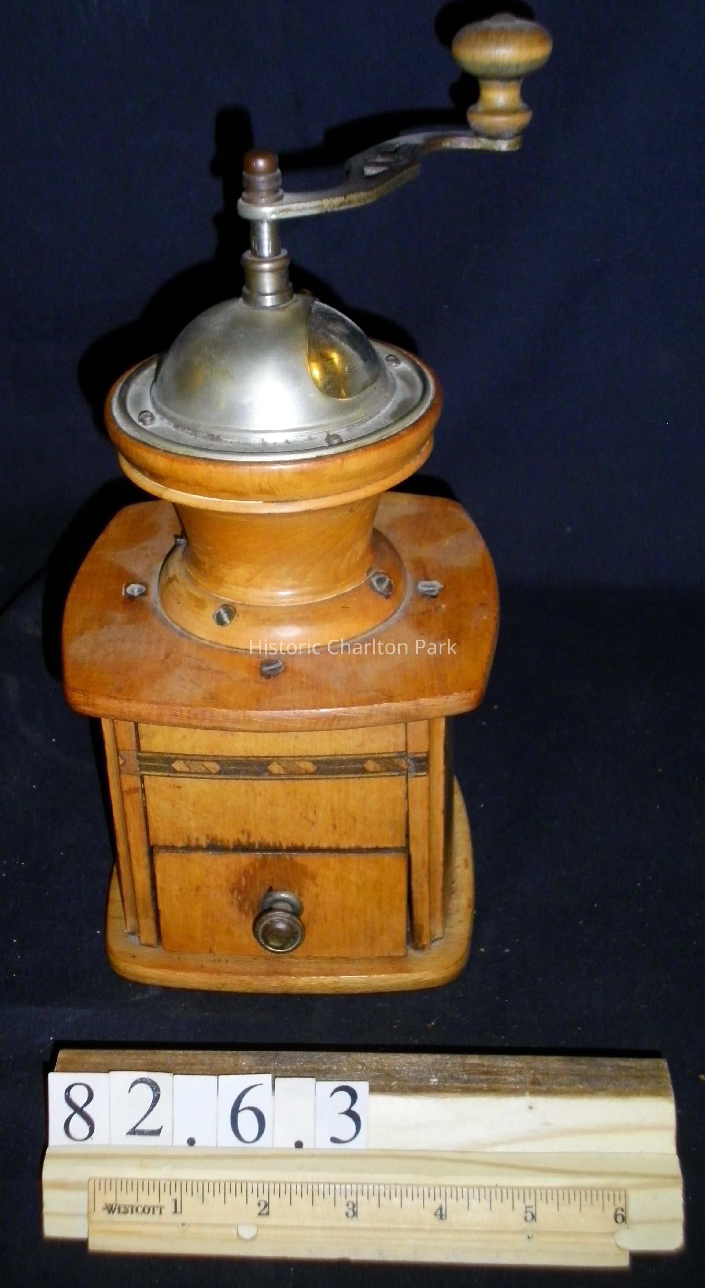 Coffee grinder with wooden mill and hopper, and a metal cap. There is decorative inlay and a drawer on the front. Handle has text on top: GARANTIE BERNHARD & CO. 11" high x 6" wide x 5 1/3" wide.