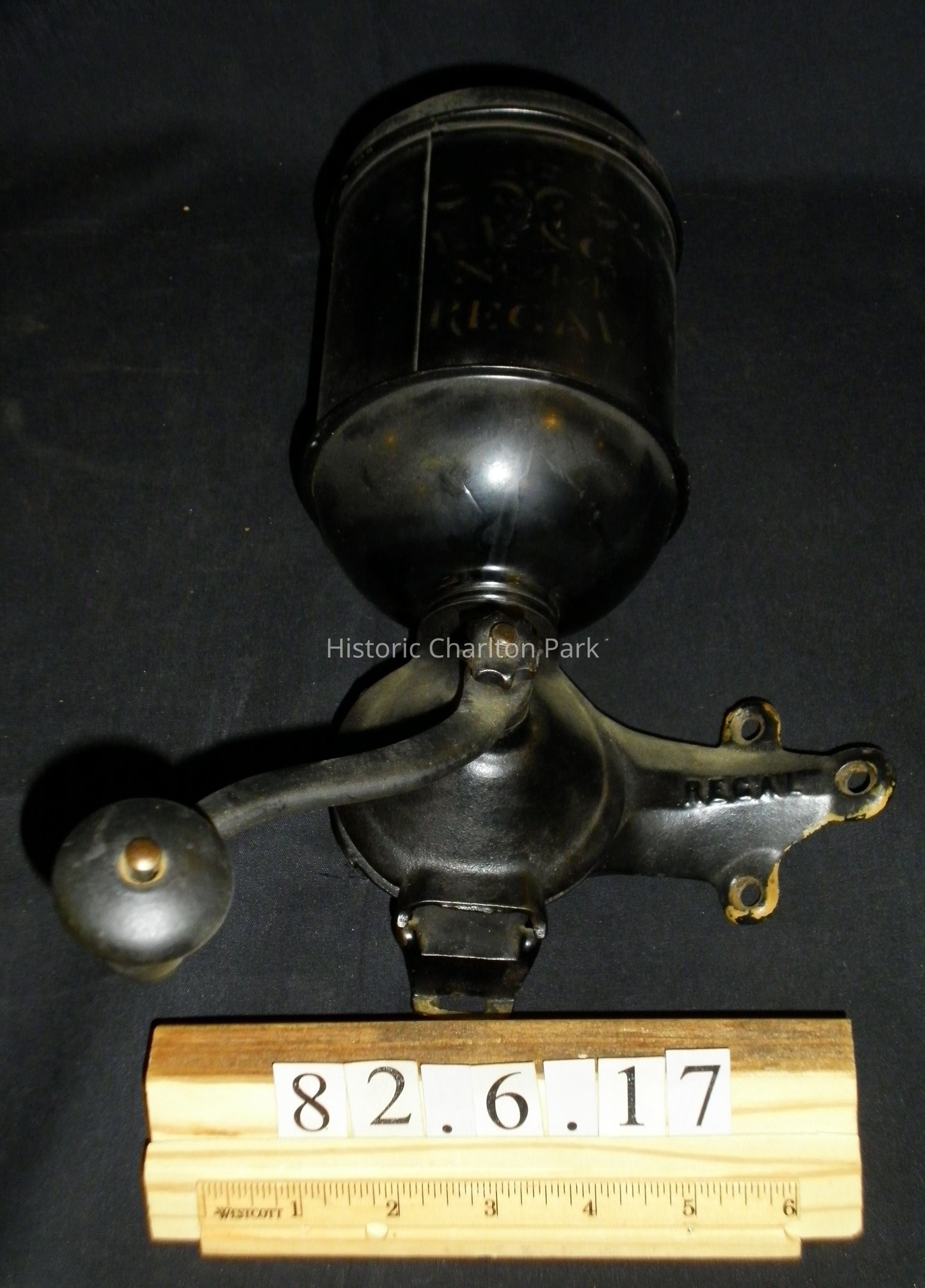 Black cast iron coffee mill, including a round tin. This large hopper would have attached to a wall. It is difficult to see in the image, but the bracket on the right hand side is not straight and would have allowed for the grinder to attach to the wall without the hopper rubbing. The text on hopper base is difficult to read, "L.F. & CO. NO. 44 REGAL".