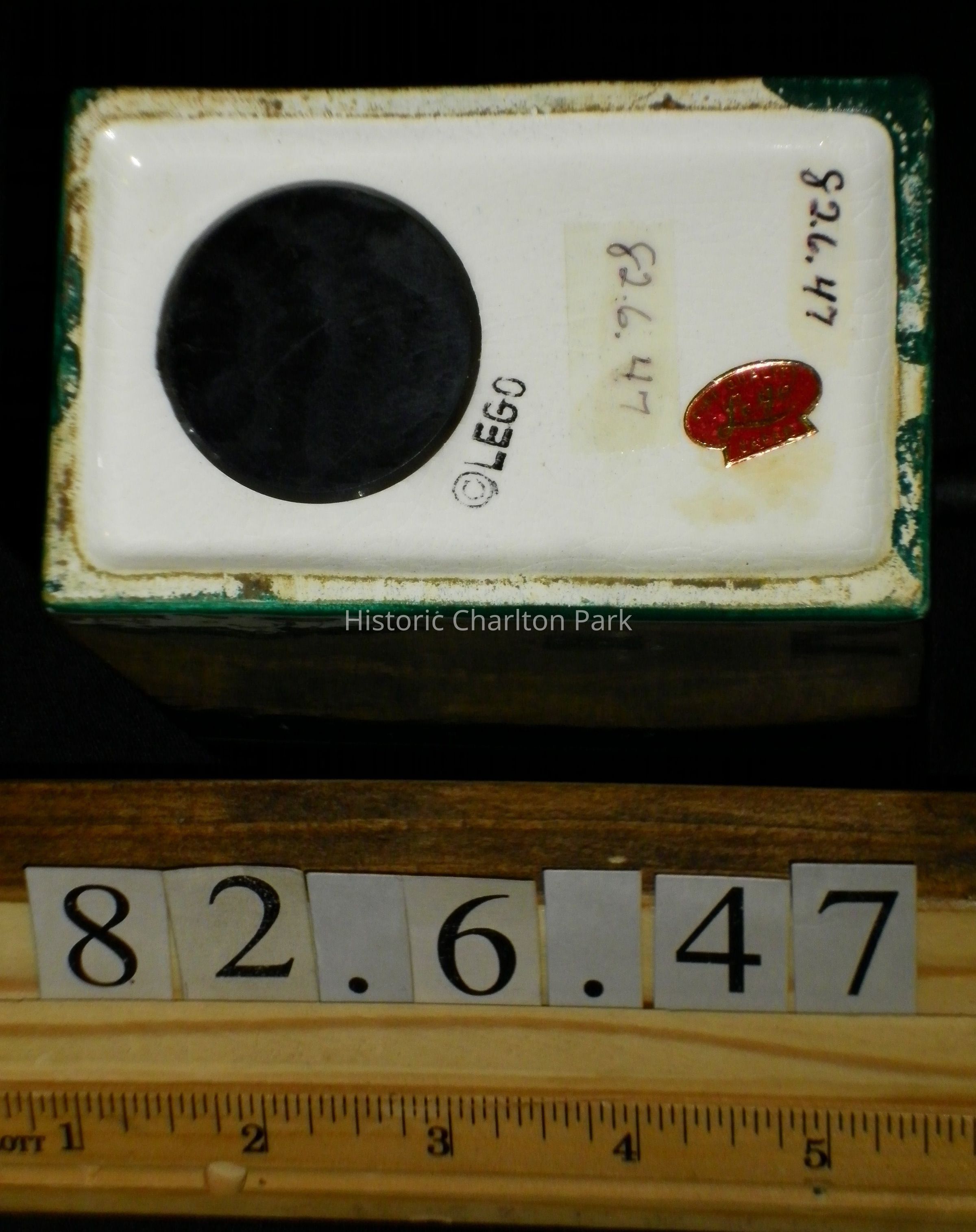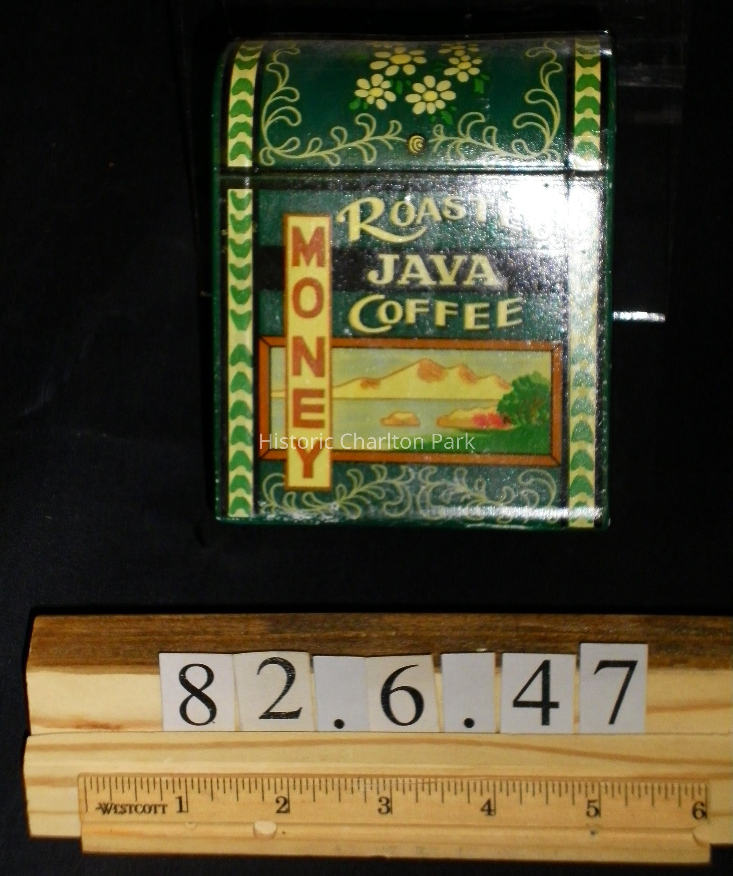 Dark green ceramic box with embossed details, and white letters and design. Slot at top for money. Round hole in base to remove coins, cover missing. The text on front says "MONEY" "ROASTED JAVA COFFEE". On base is stamped "LEGO" along with a red sticker that states" Fine Quality Lego Japan"