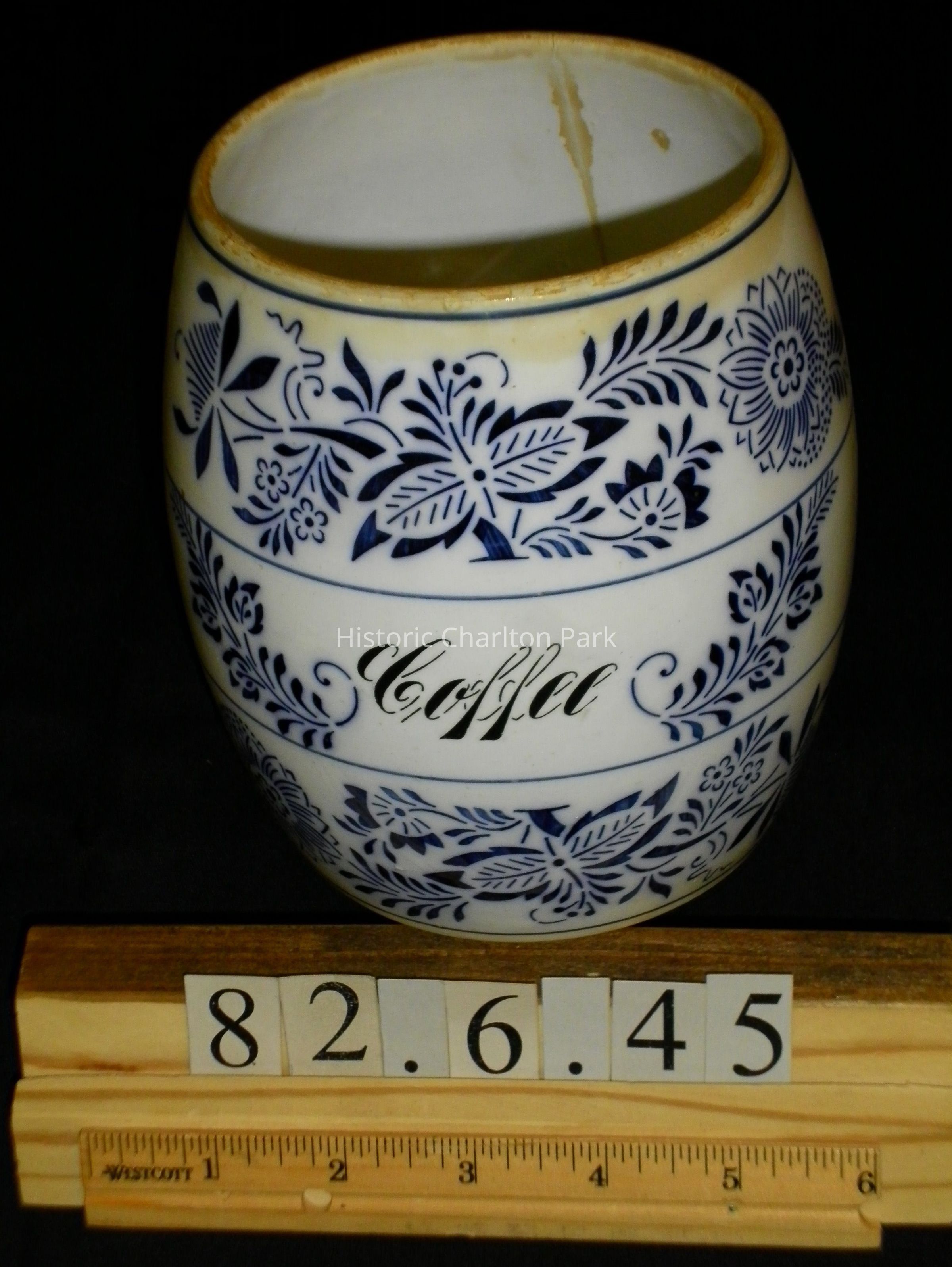 Ceramic cannister with a blue floral design on white background, "Coffee" is written in script on the front. Barrell design.