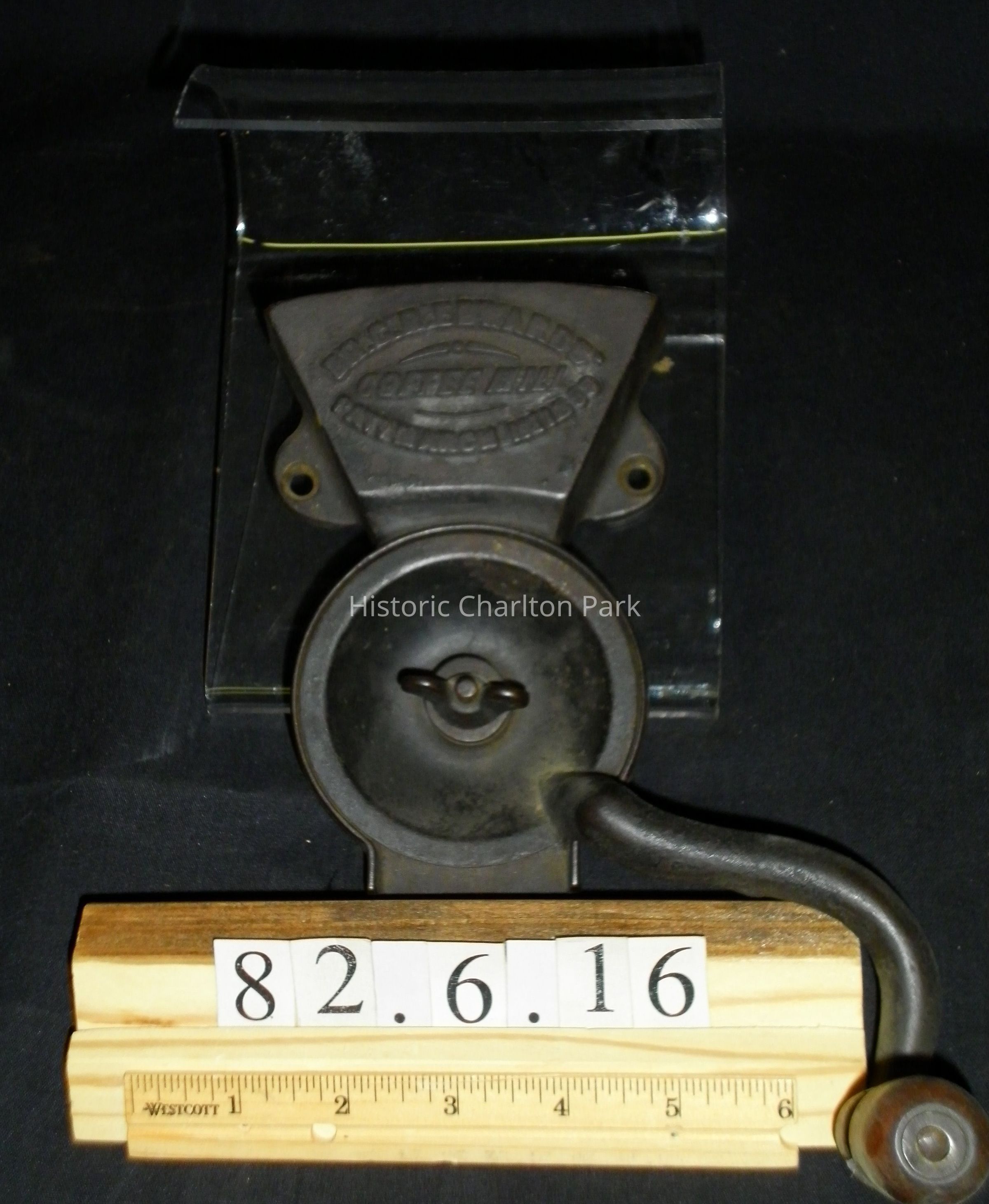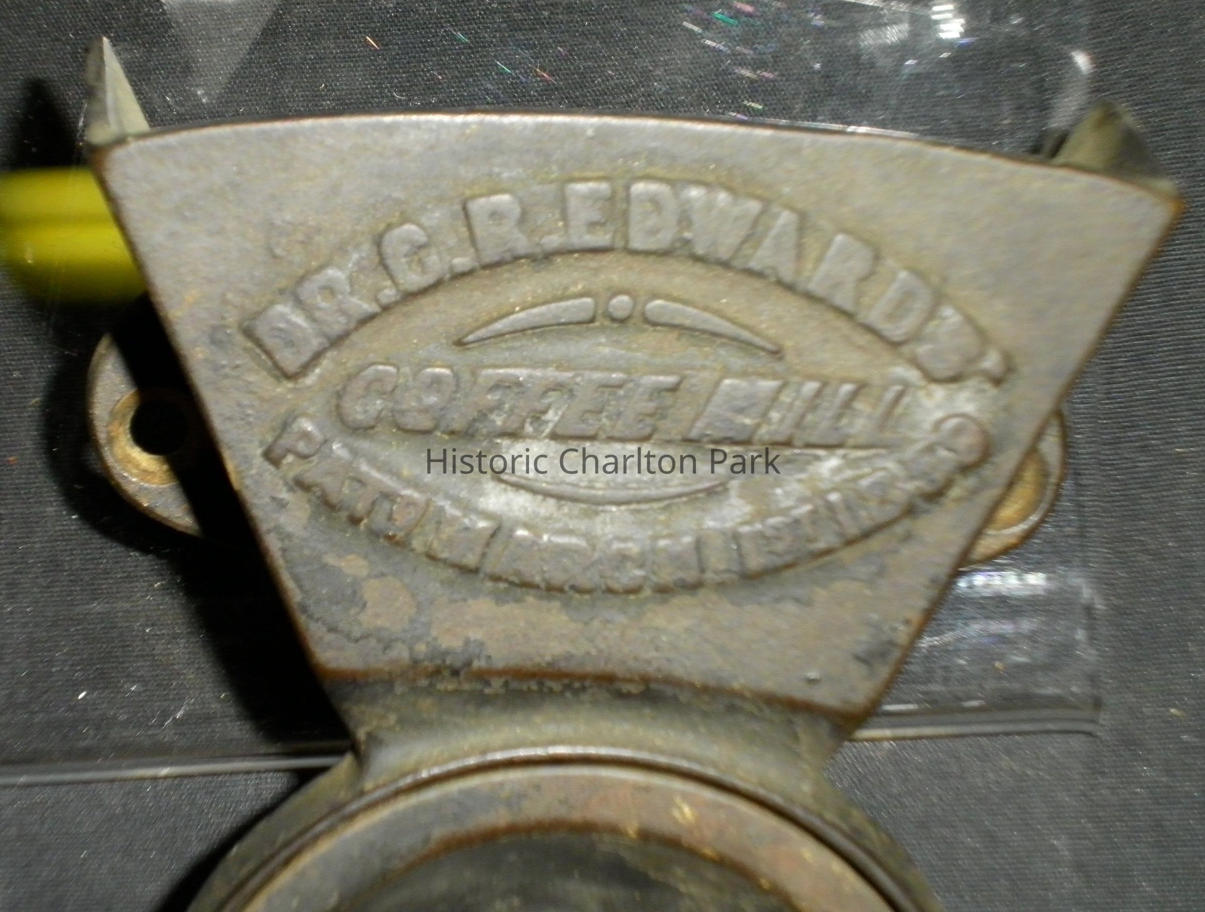 Black cast iron coffee mill. Could have mounted to a wall or the side of a wagon. Embossed on front of hopper with the words, "DR. C.R. EDWARDS' COFFEE MILL PAT. MARCH 1st 1859. Likely made in Niagara City, NY.
