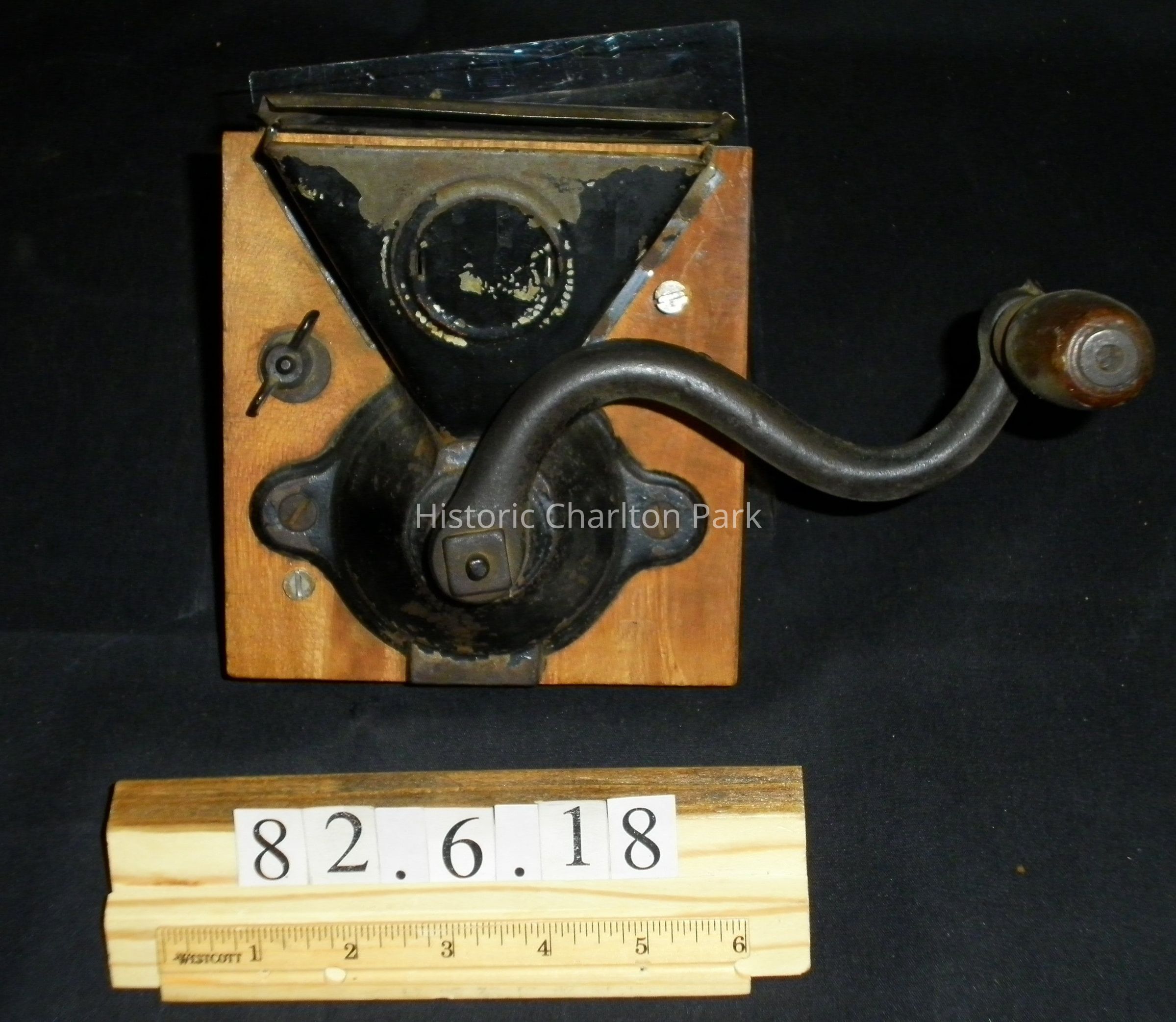 Black cast iron coffee mill that would have been wall mounted. Currently hung on a piece of wood. Top flips up on hopper and it adjusts from the back. The crank has a wooden handle. No manufacturer information evident.