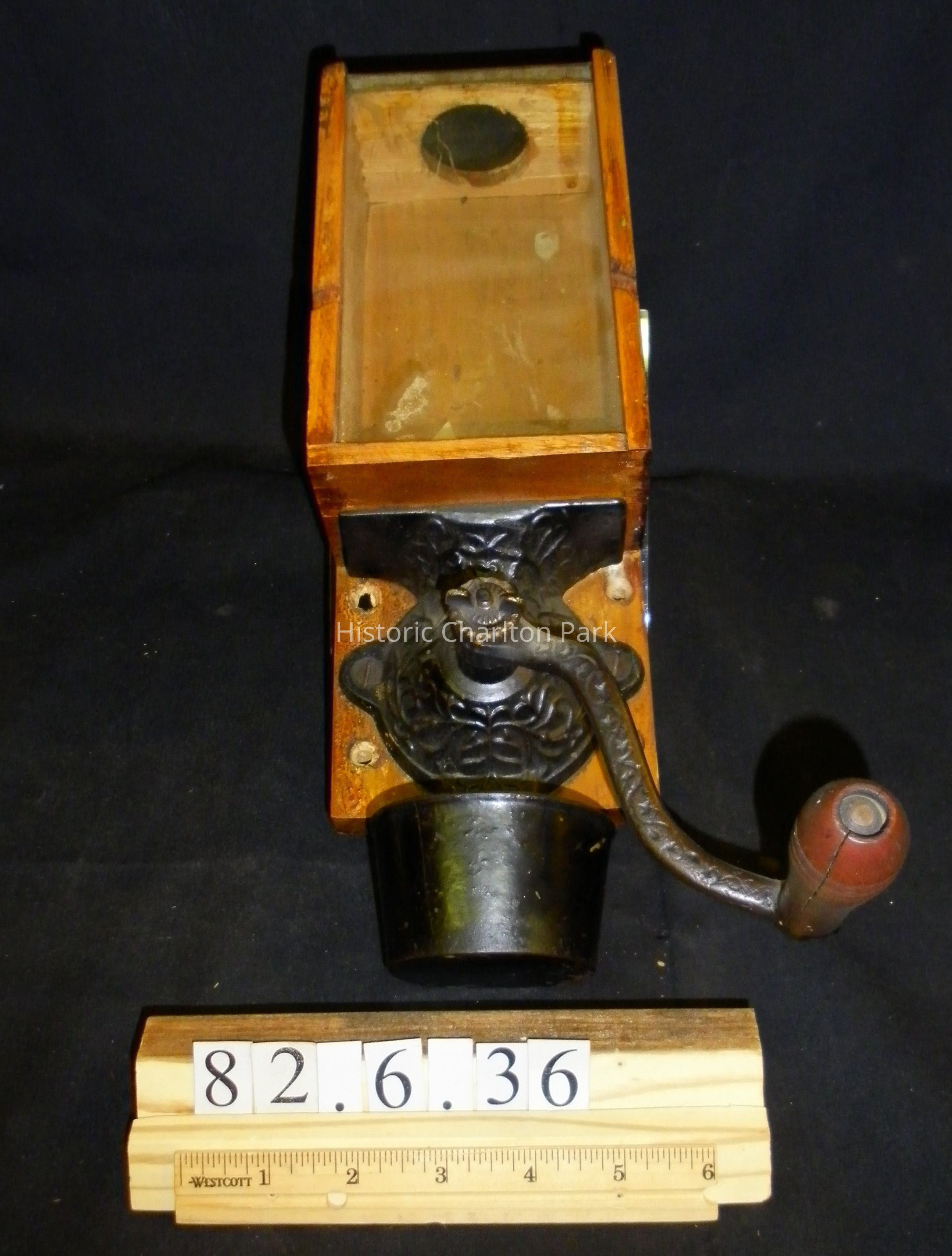 Wall mounted coffee mill, called the Arcade X-Ray, 14" long, including round metal cup at bottom. The wooden hopper is dovetailed. There is a glass plate where the beans were held with a metal band on top. The round embossed metal lid on top of hopper slides and is 2" in diameter. The gear box is embossed cast iron with a crank, and a round black metal catcher cup attached below gear box by a metal bracket on back.