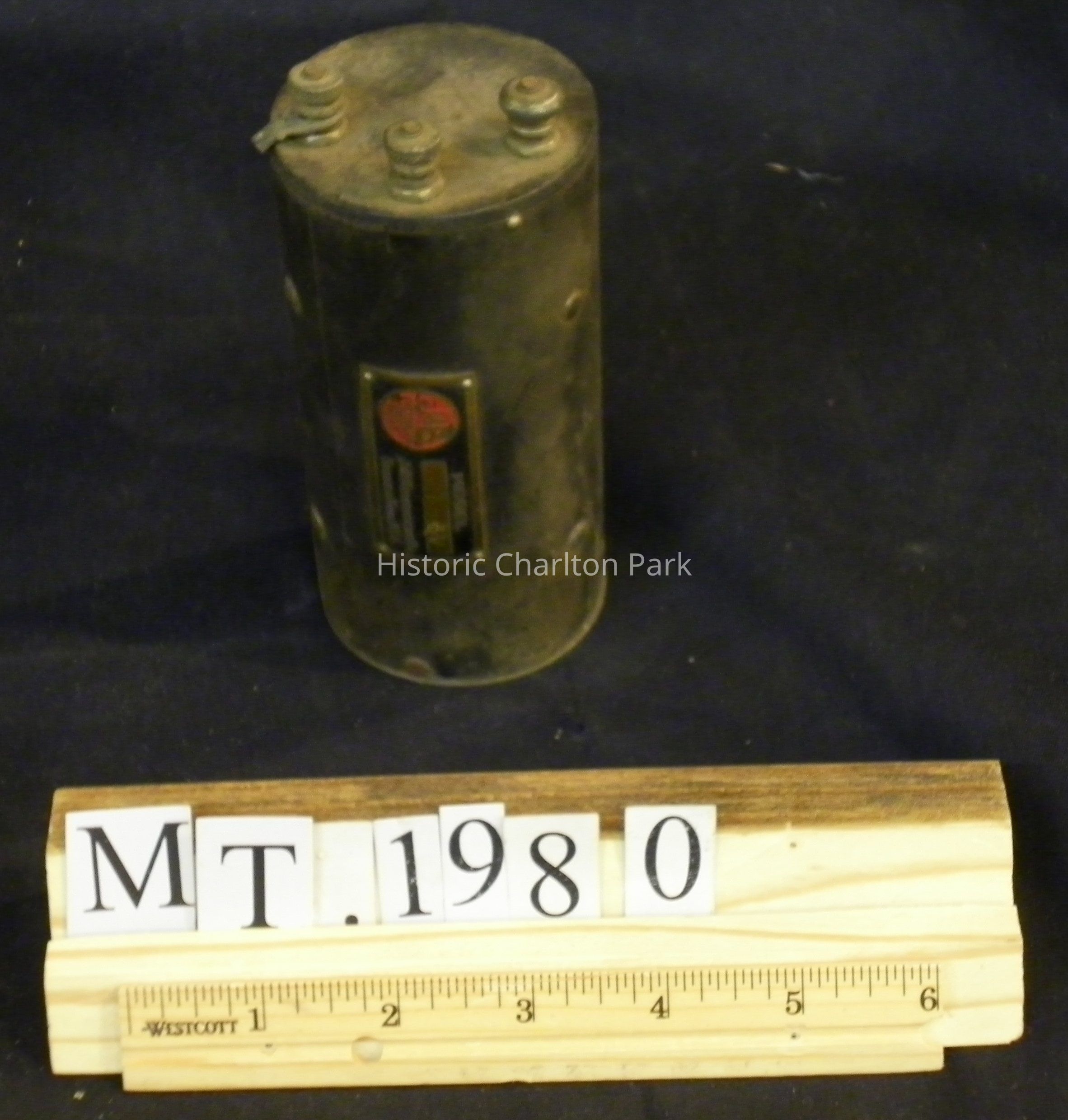 Old car coil, cylindrical in shape with three screws on top. Made by J & B Manufacturing Co. in Pittsfield, Massachusetts. Model # C1-6V. Manufacturing information recorded on a small plaque on object's side.Dimensions
