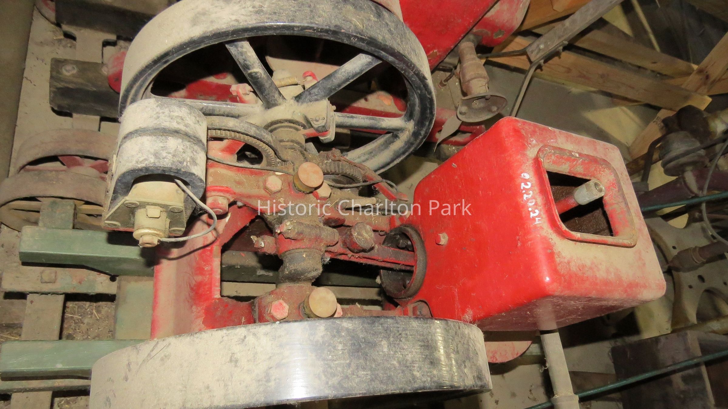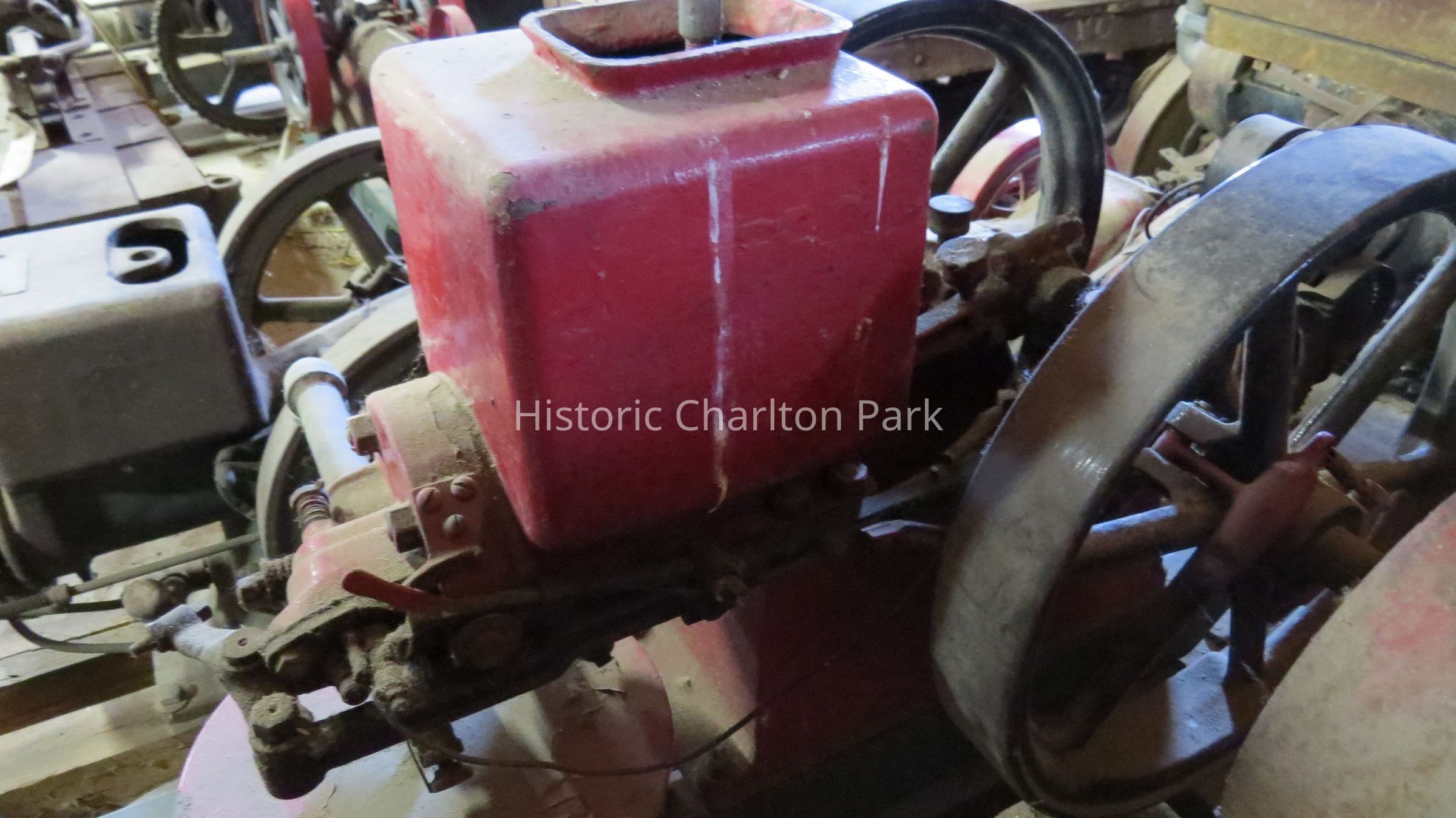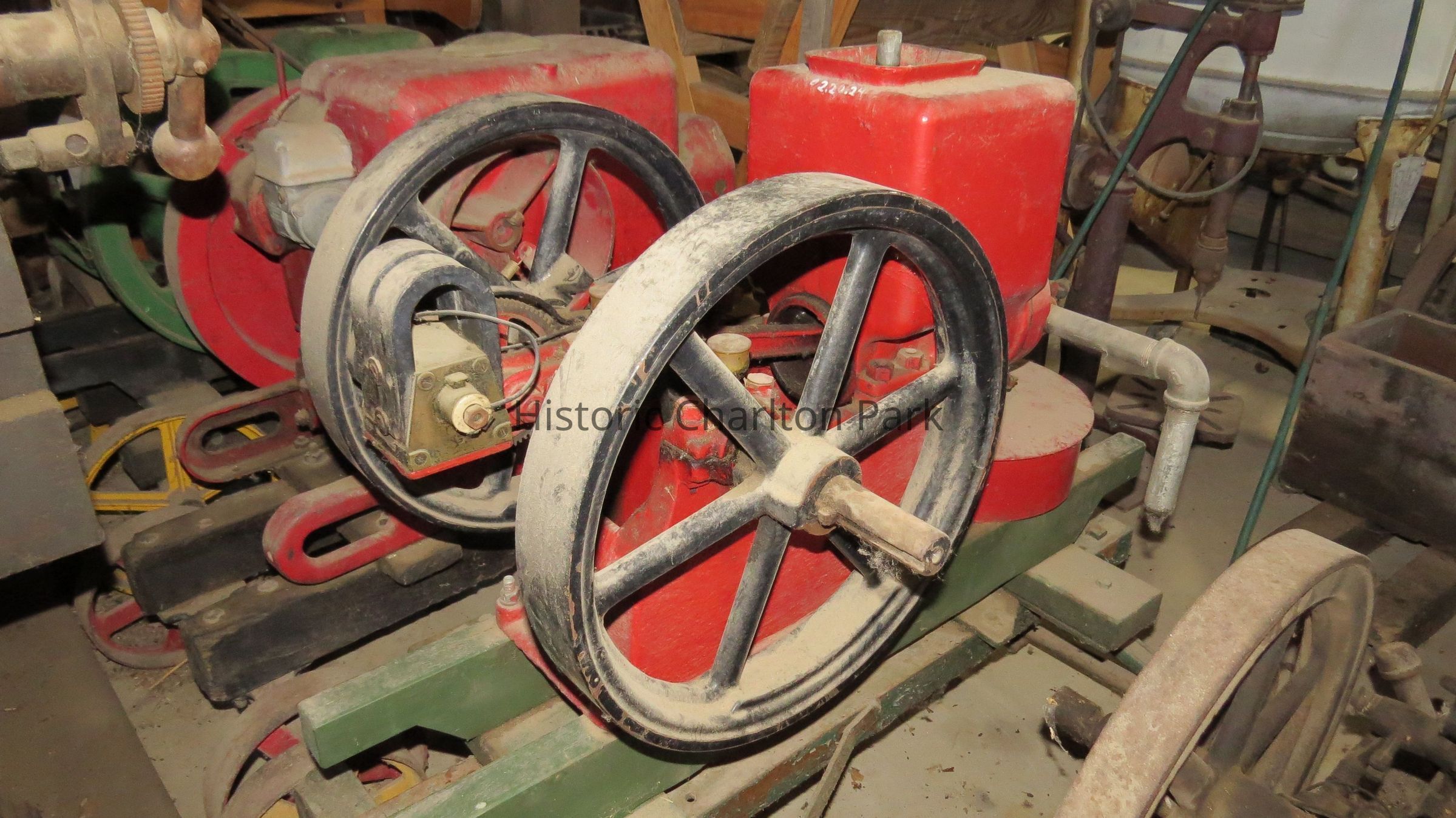 Small gas engine painted red and black, mounted on a small four-wheeled cart. Manufacturer unknown.
