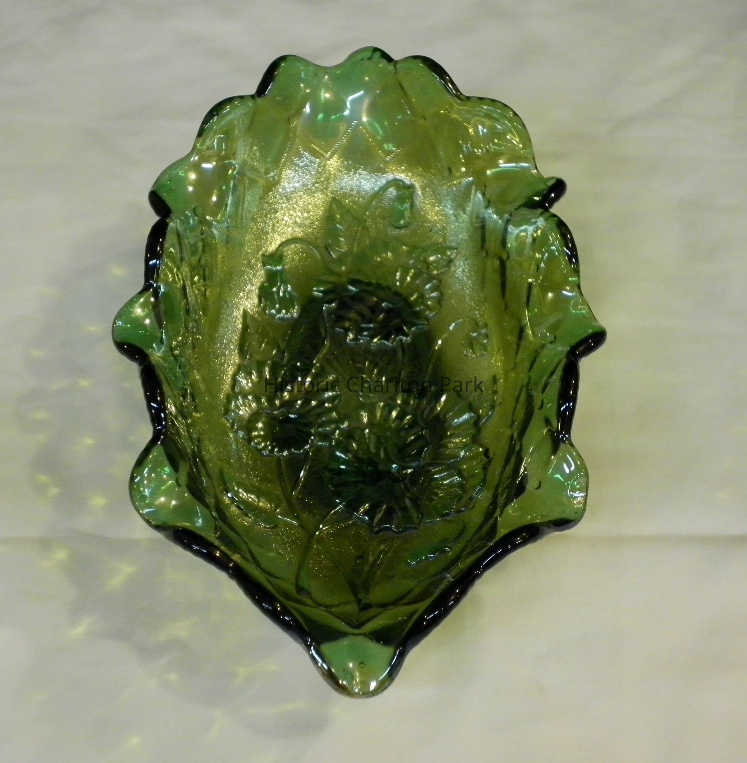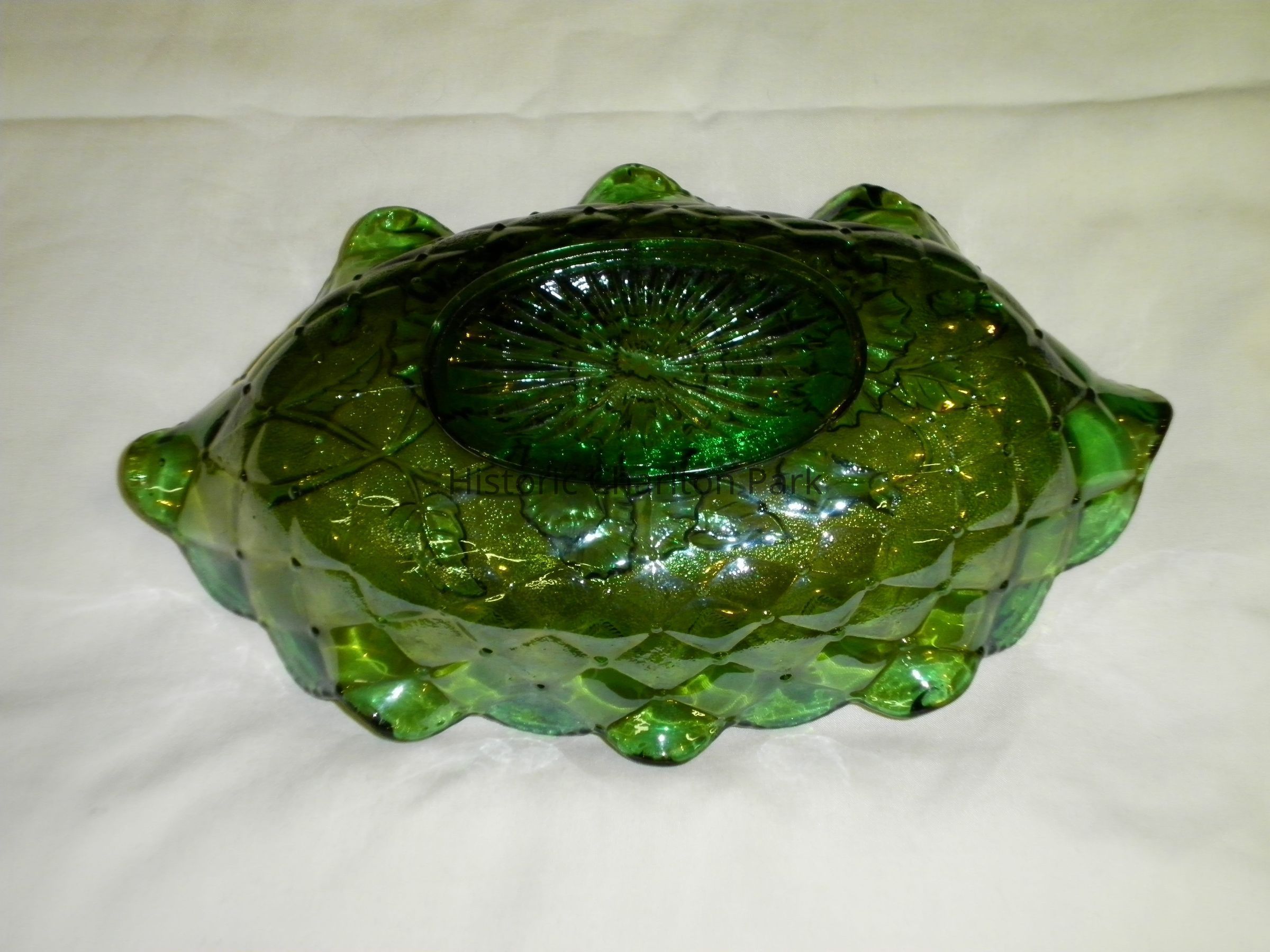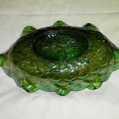 Green carnival glass relish dish with "Pansy" interior and "Quilted Diamond" exterior. Made by the Imperial Glass Company. Production on this pattern began in 1910, the interior on the bottom is the only place one can still see the iridescence.Acquisition