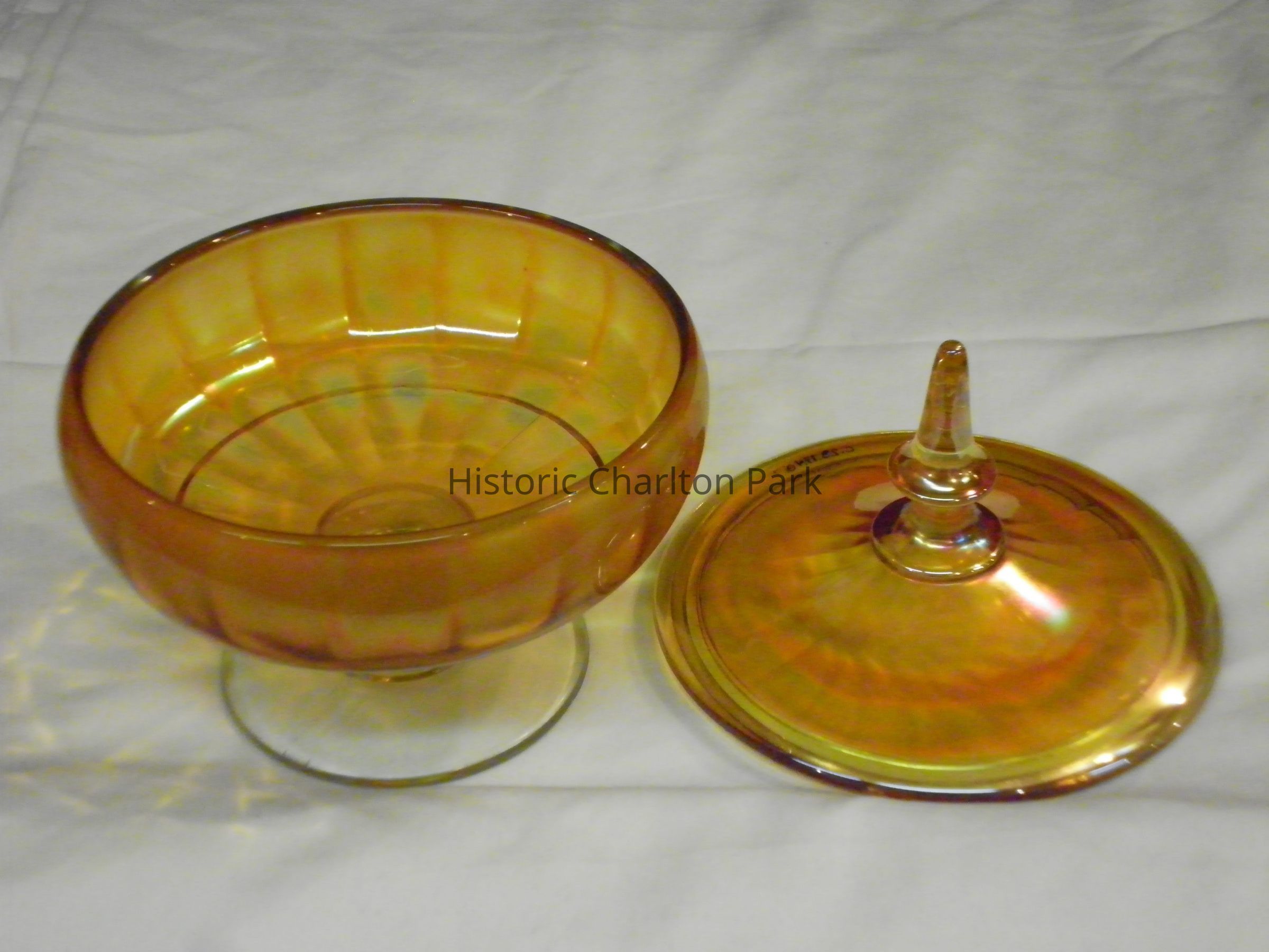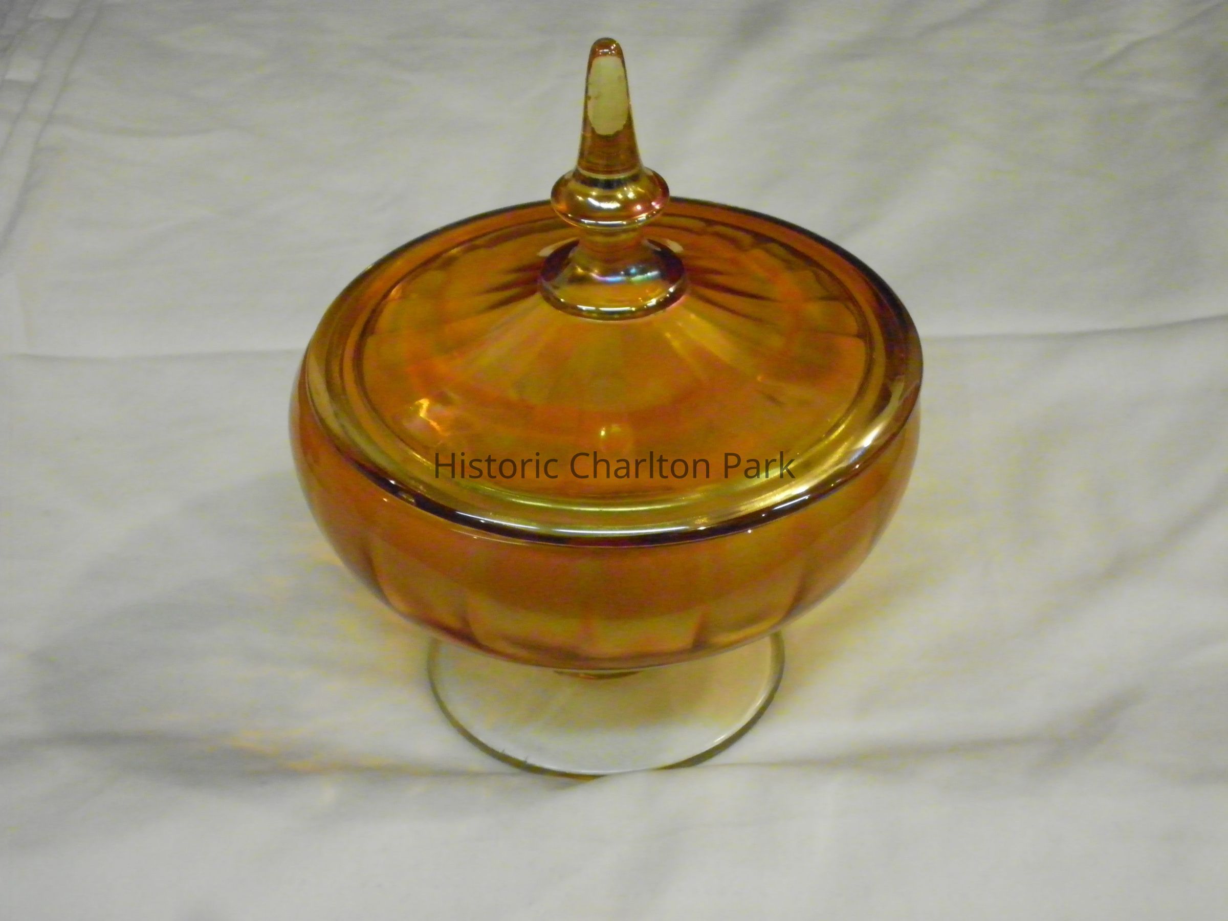 Marigold carnival glass covered candy dish. This pattern is not easy to determine and could be made by a variety of producers. This is generally referred to as "stretch glass", which is a cheaper glass with little to no pattern. The only specific photos found did not identify the maker.Acquisition