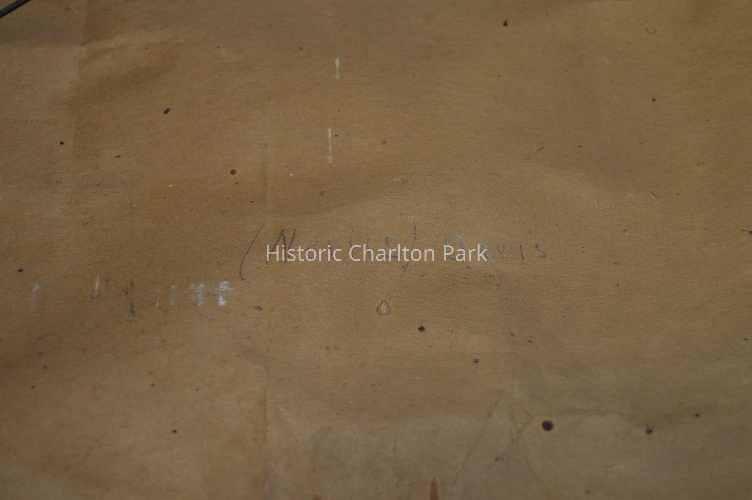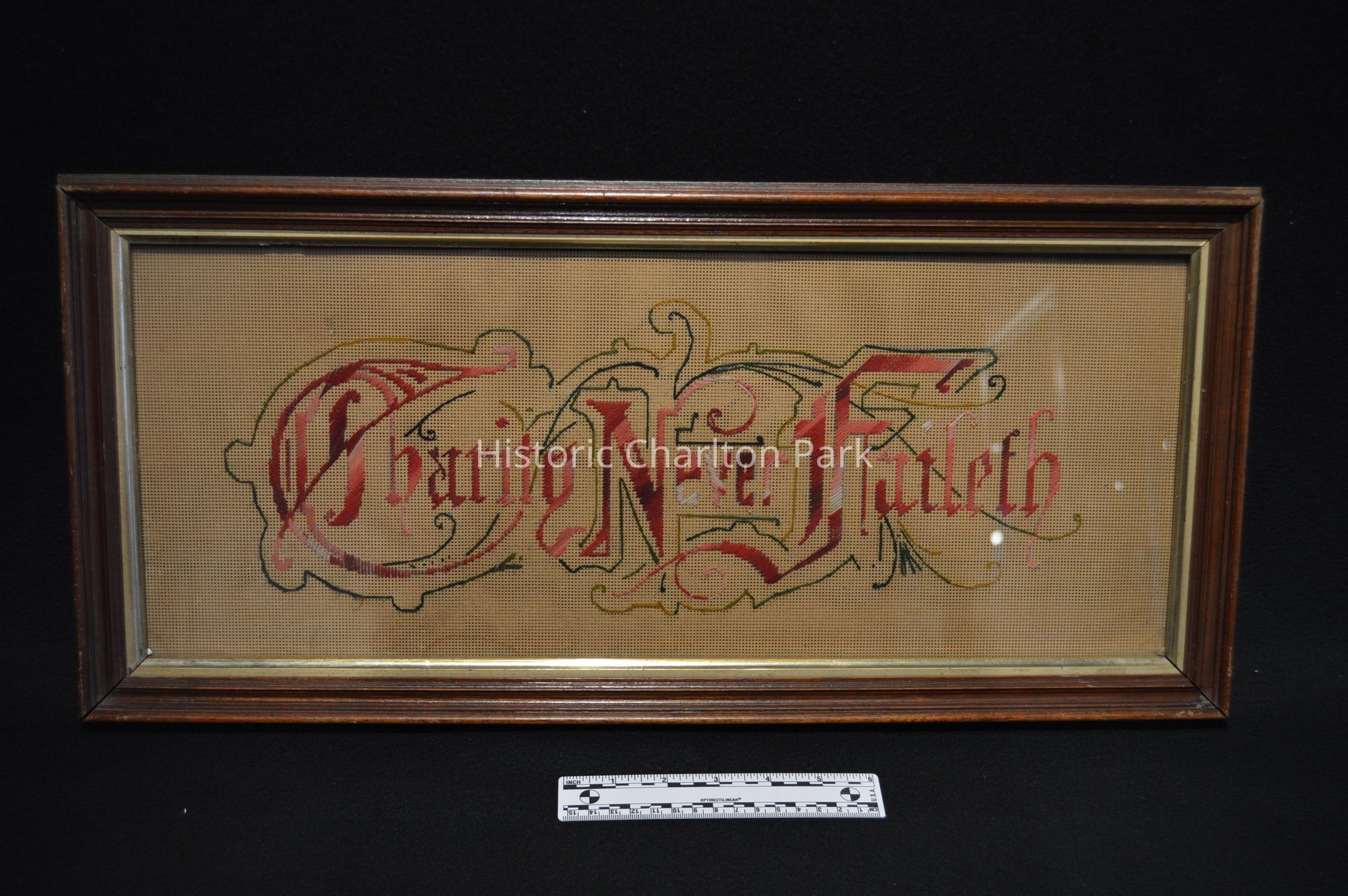 Victorian era motto sampler with the text "Charity Never Faileth." The text is embroidered in shades of red and white, with green outline. There is some water damage at the bottom. The paper covering on the back has the name "(Norris) Davis" in pencil.