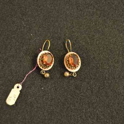 Gold hanging earrings with orange stones and small ornamental gold beads hanging from the bottom.