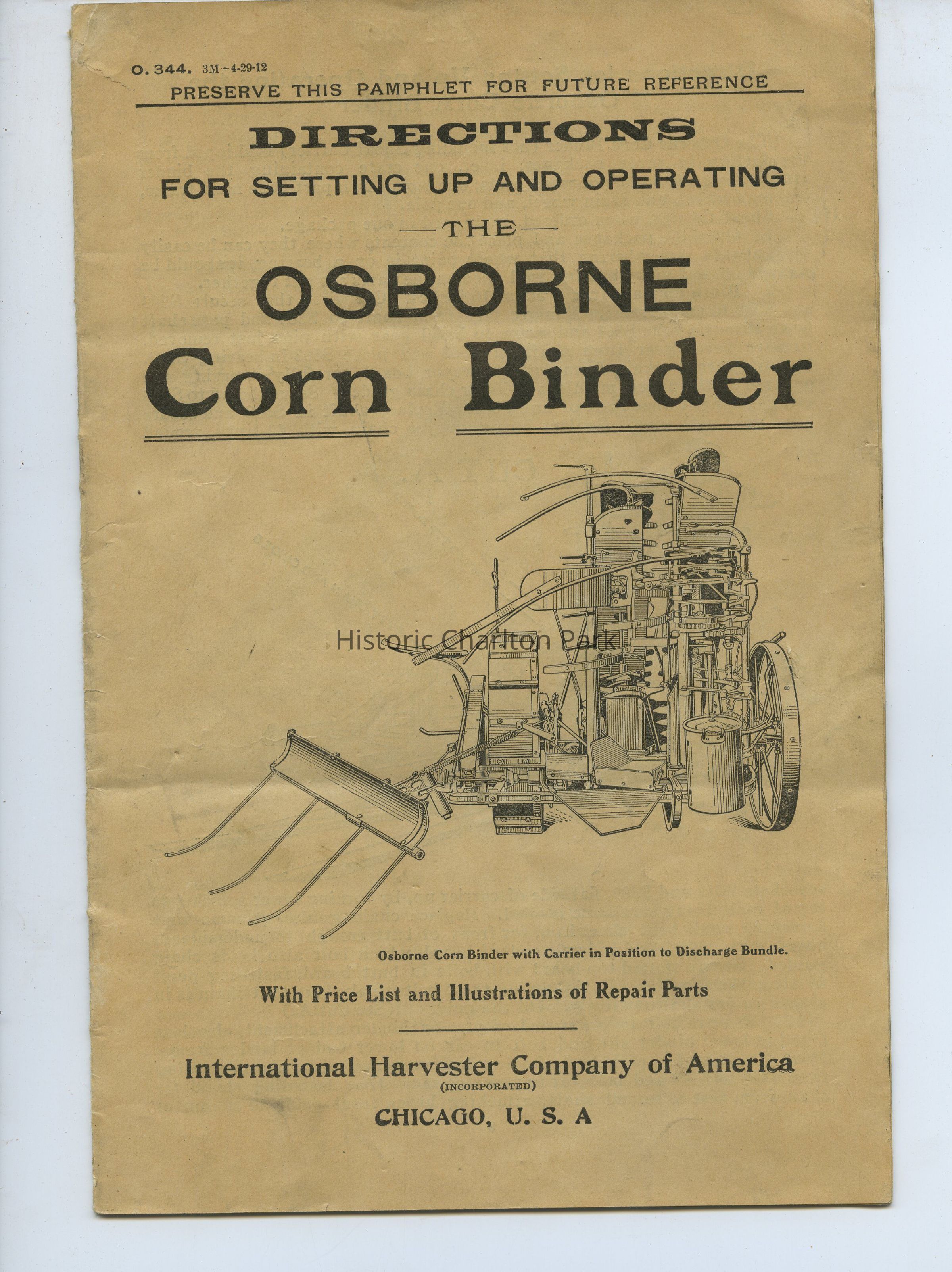 Directions For Setting Up and Operating the Osborne Corn Binder. With Price List and Illustrations of Repair Parts. Physical Description: paper cover and binding. 6" x 9"