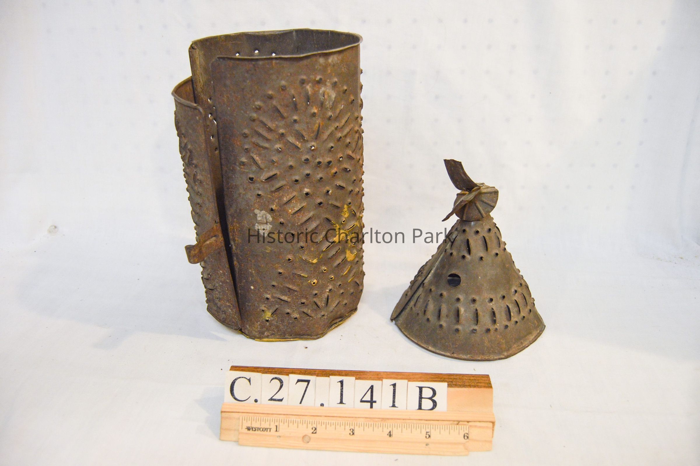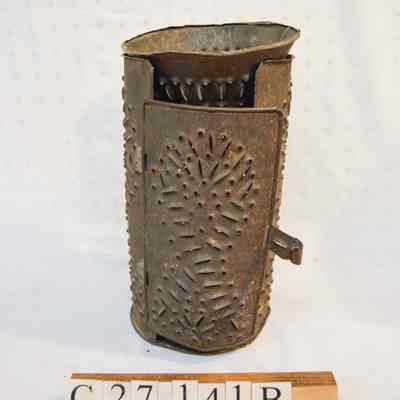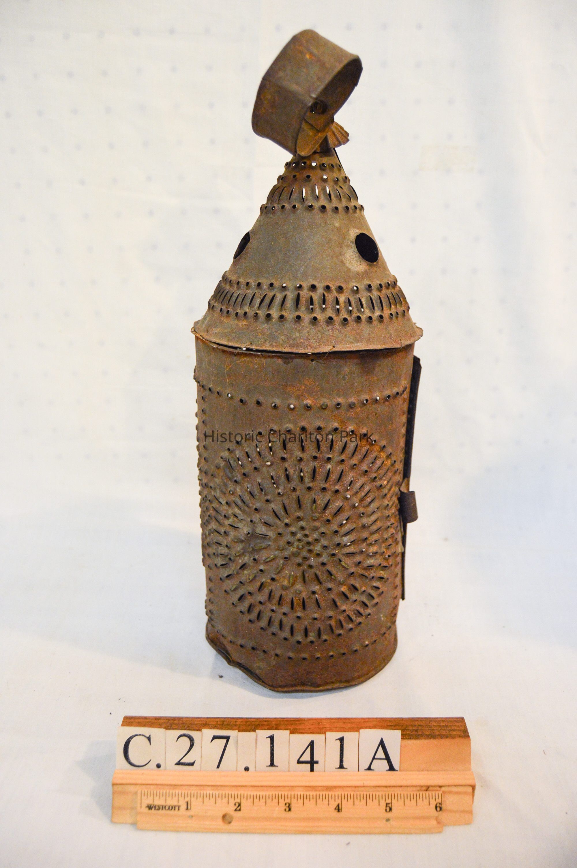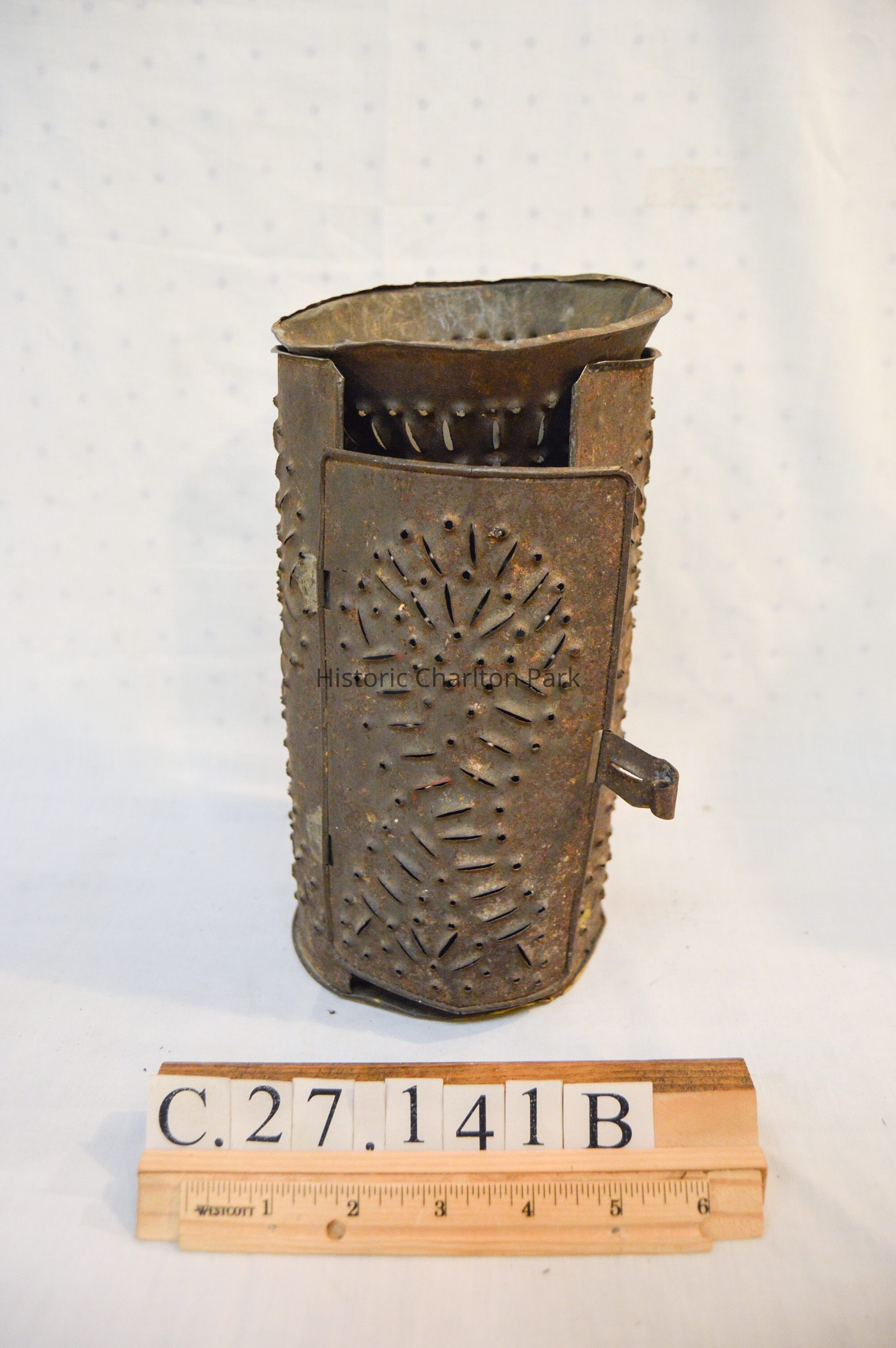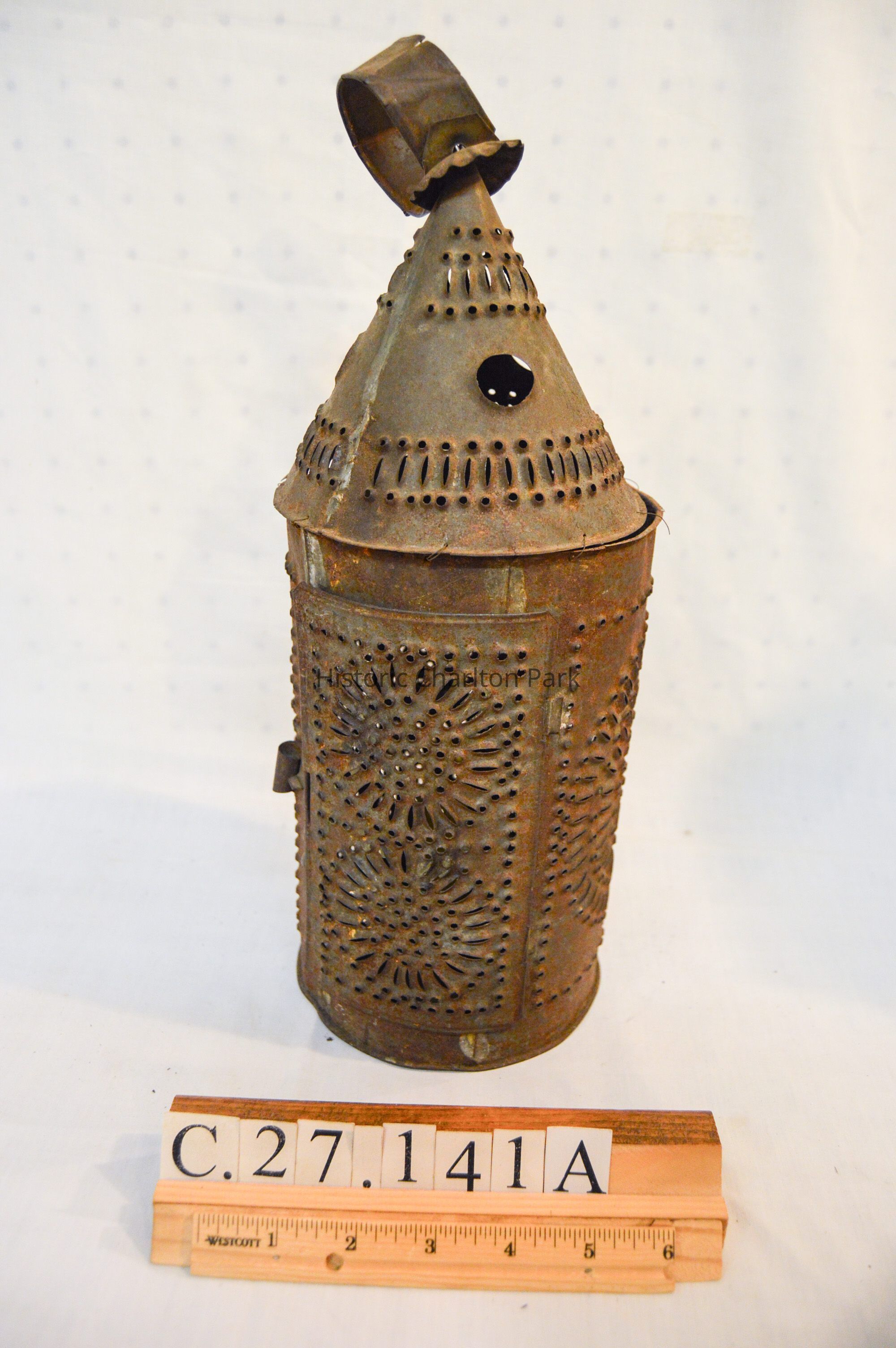 B: The lantern is cylindrical and made of metal. The sides have holes poked out from the inside that serve as decorative ventilation. The holes have an elaborate pattern. The panel on the front of the lantern is slightly offset and doesn't line up with the top and bottom of the body. It swings open on two hinges and clasps shut. There is a cylindrical candle holder on the inside of the lantern. The top of the lantern has a conical shape, and does not line up with the top of the body. It is stored upside down on top of the lantern. The top has vents along the top and bottom and circular holes around the middle. The handle is missing or broken off.Dimensions