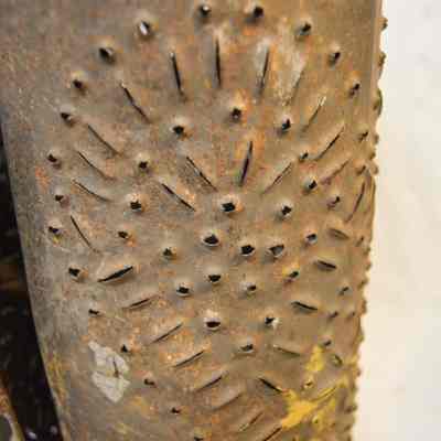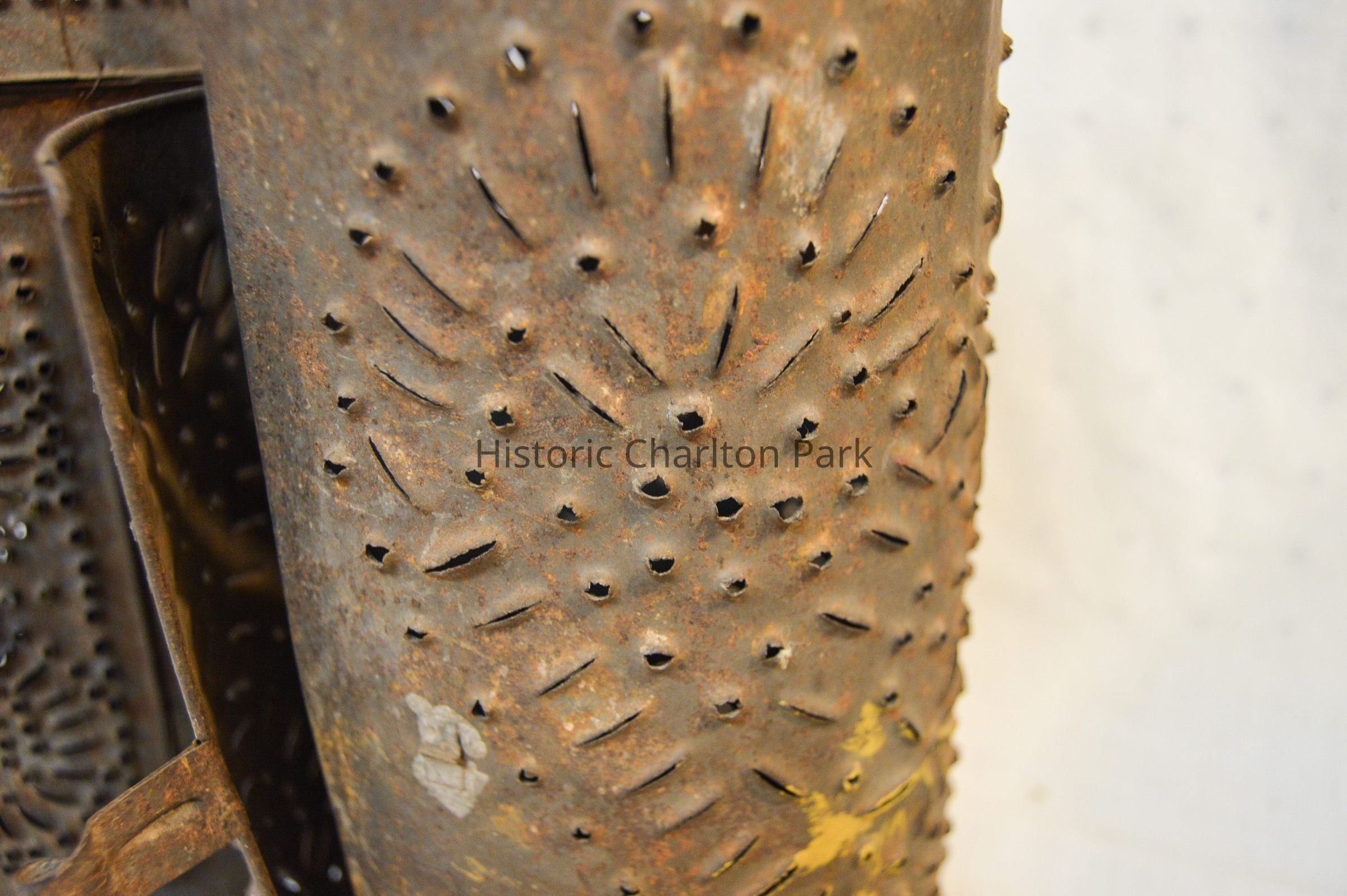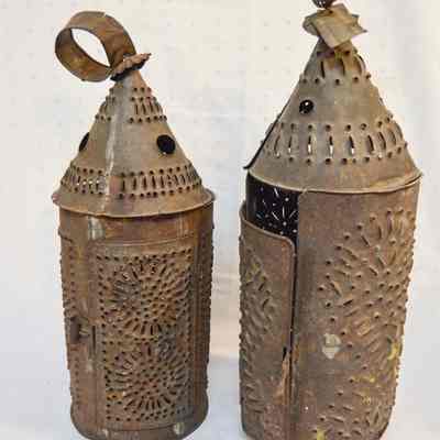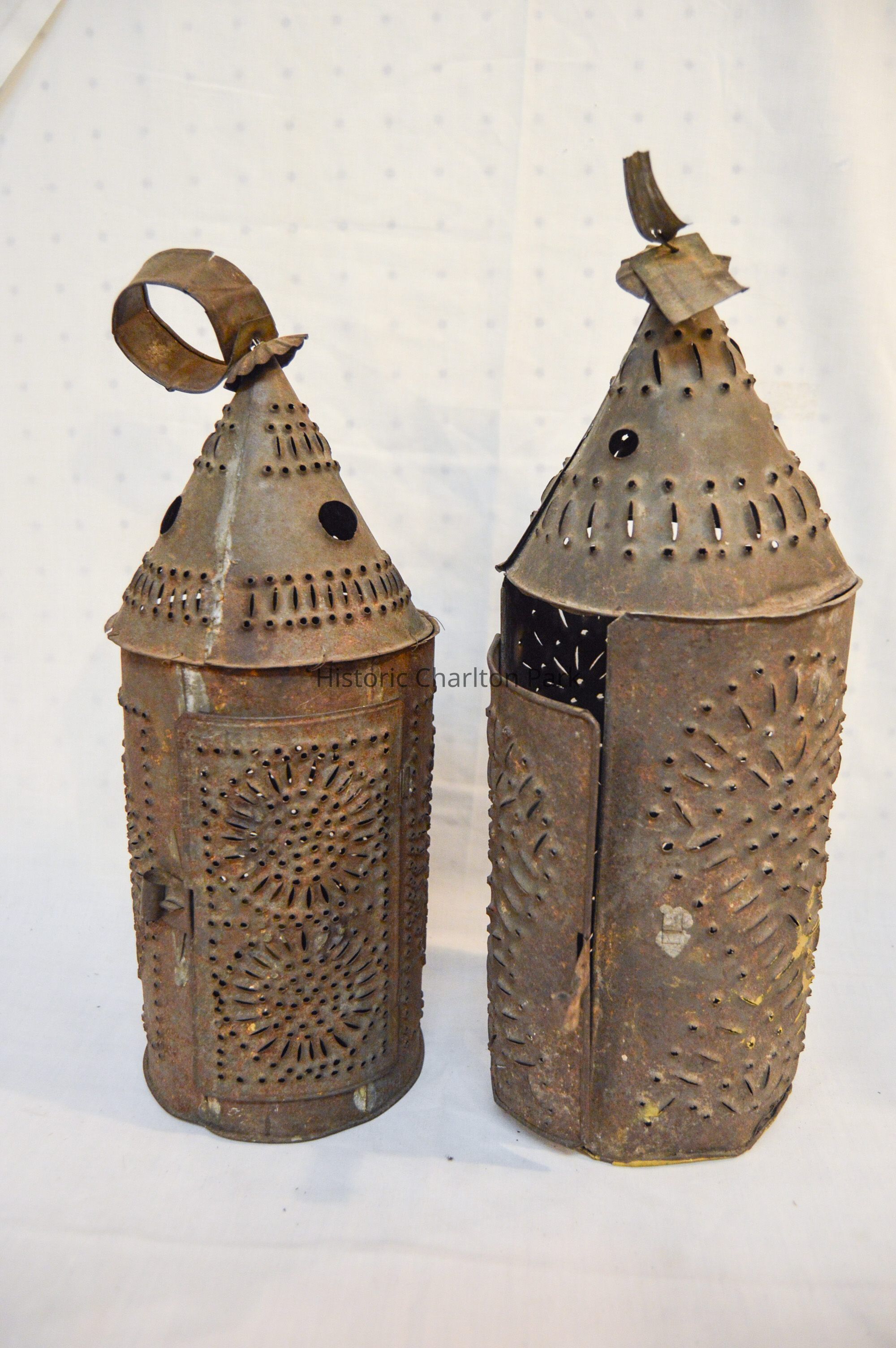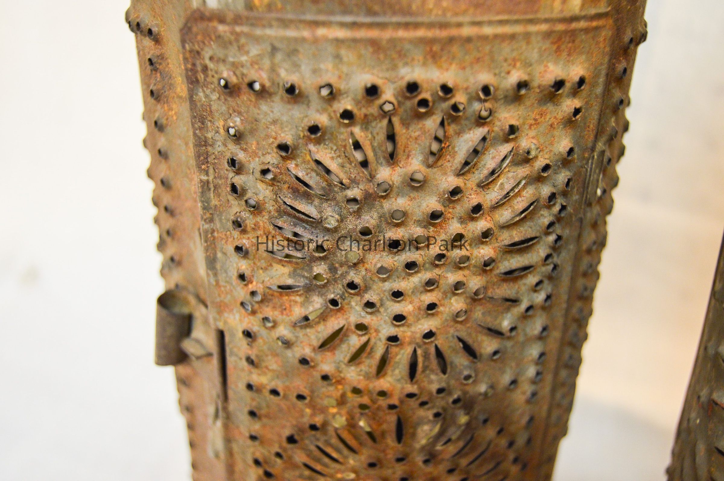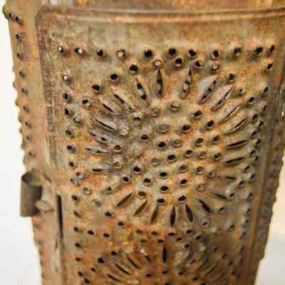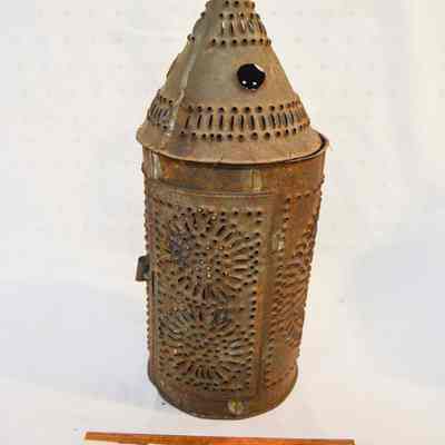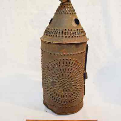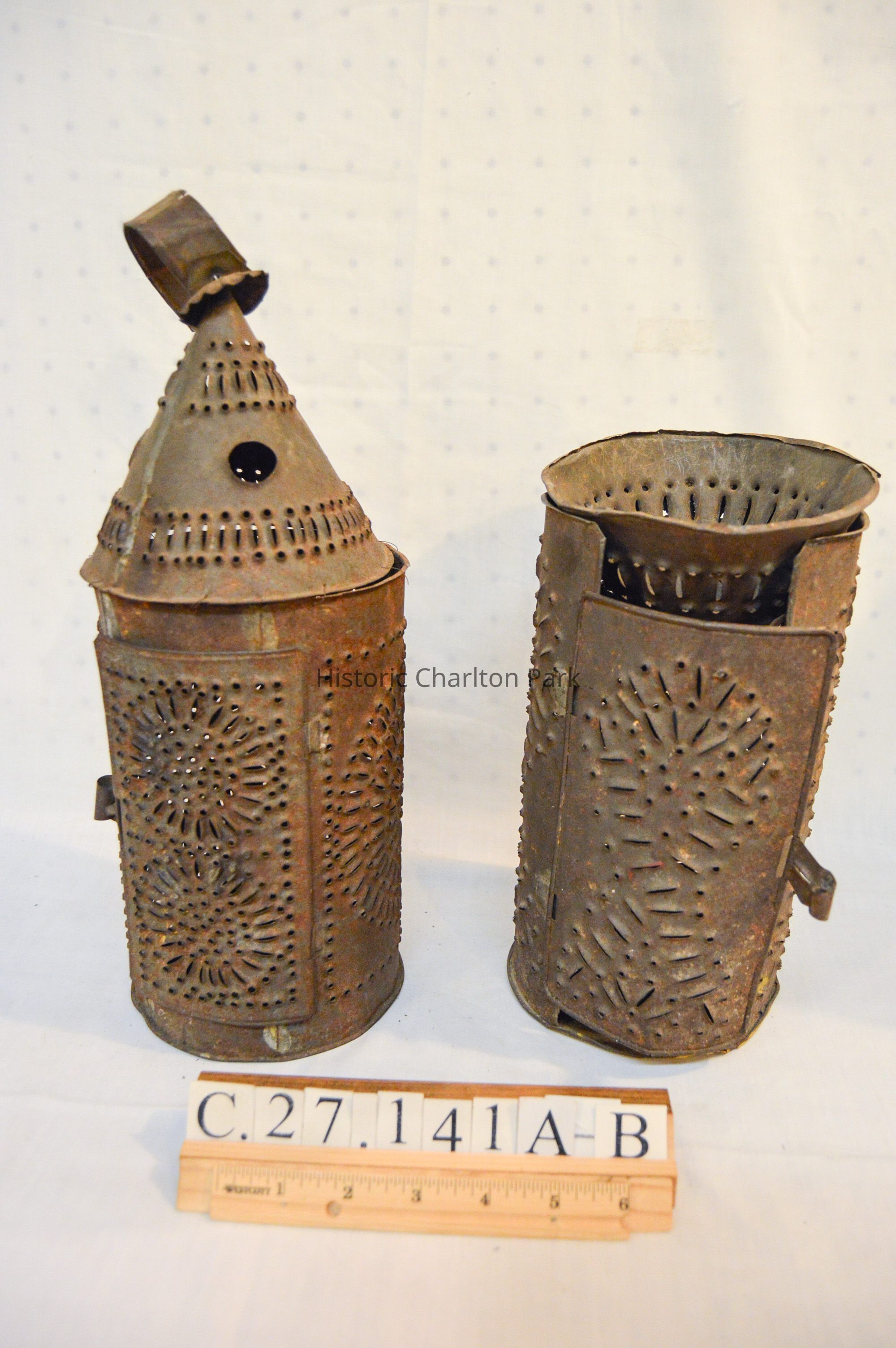 B: The lantern is cylindrical and made of metal. The sides have holes poked out from the inside that serve as decorative ventilation. The holes have an elaborate pattern. The panel on the front of the lantern is slightly offset and doesn't line up with the top and bottom of the body. It swings open on two hinges and clasps shut. There is a cylindrical candle holder on the inside of the lantern. The top of the lantern has a conical shape, and does not line up with the top of the body. It is stored upside down on top of the lantern. The top has vents along the top and bottom and circular holes around the middle. The handle is missing or broken off.Dimensions