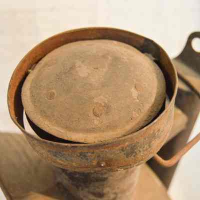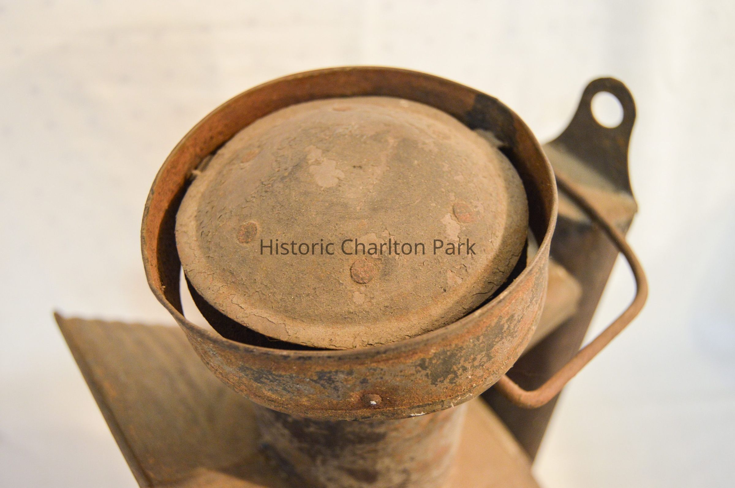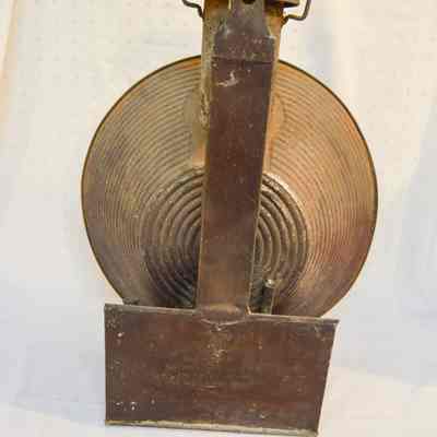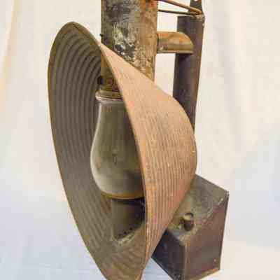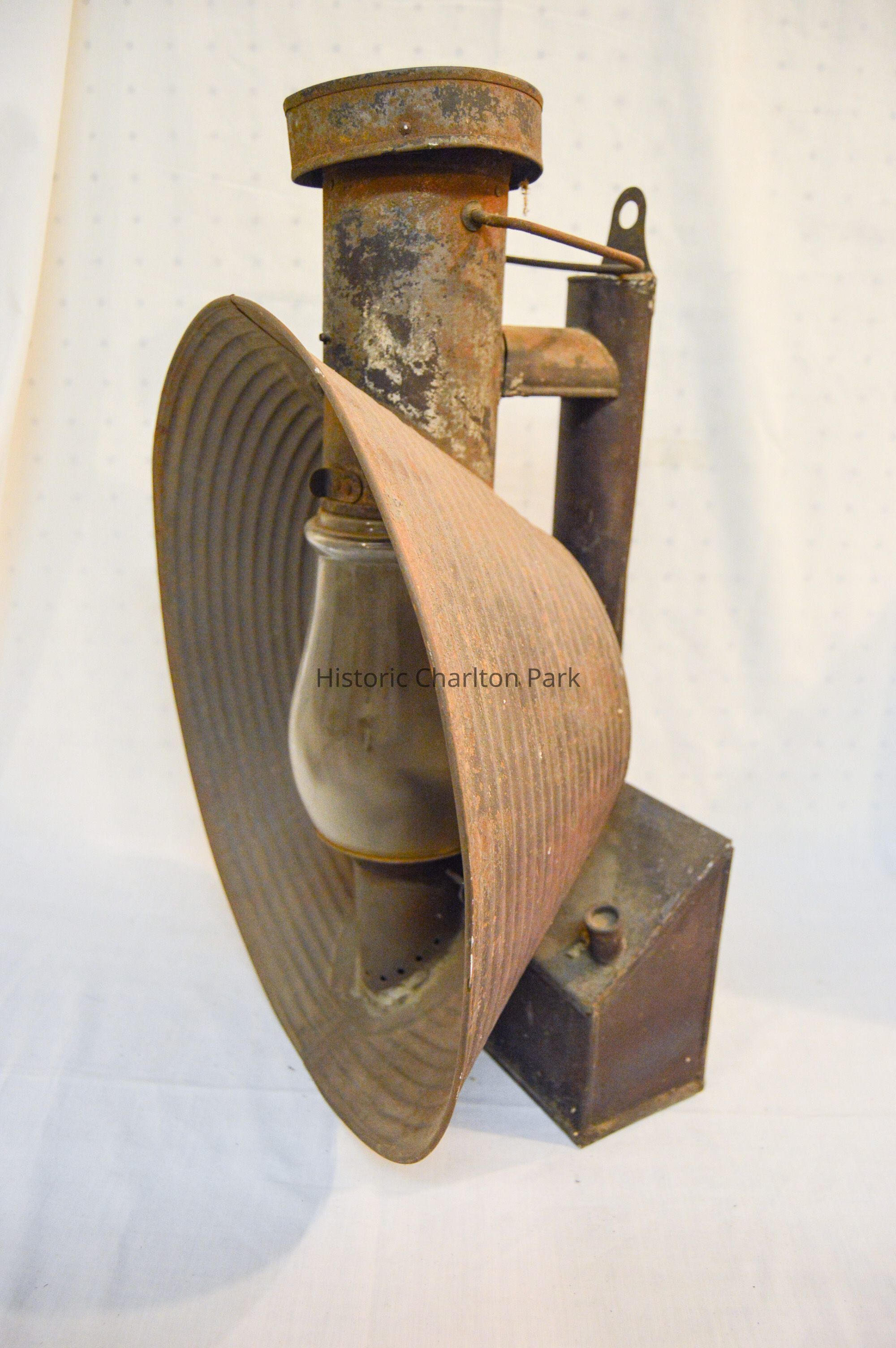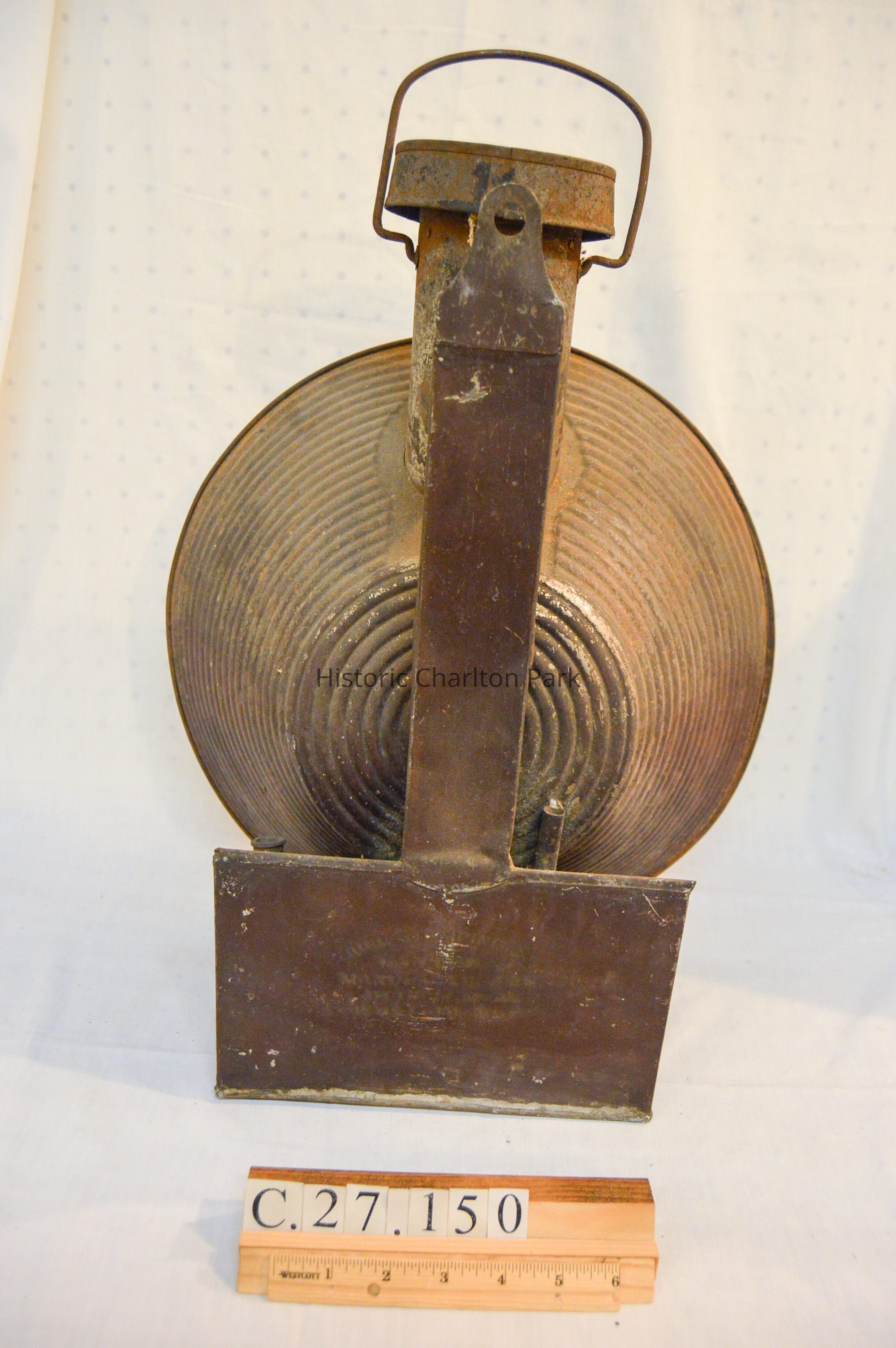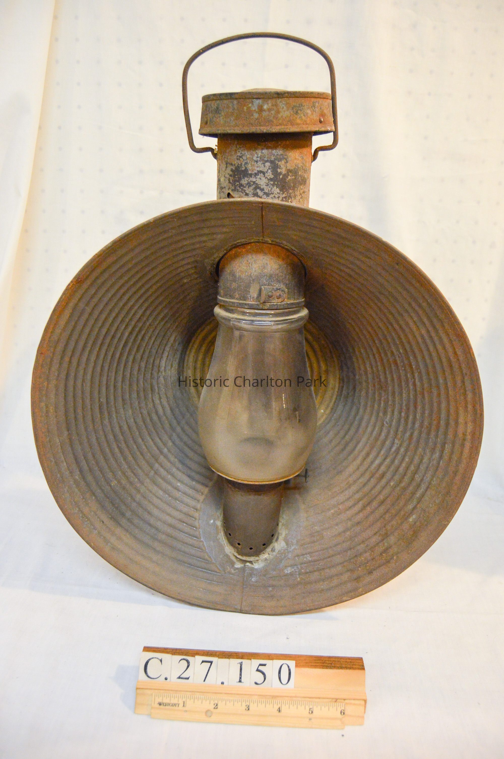Very large kerosene lantern with a rectangular base and a slanted edge at the top. There is a small fuel cap on the right side of the base and a large, rectangular bracket in the center that extends upwards. The bracket supports the large, conical reflector on the front of the lantern and the cylindrical cap at the top. Inside the conical reflector, there is a burner on a cylindrical post which consists of a round knob, a ring with circular vents, and a dome-shaped emitter. A glass chimney with a pear-shaped body sits on top of the burner and is capped at the top. The top of the lantern has a looped metal handle.Dimensions