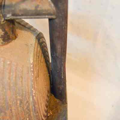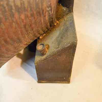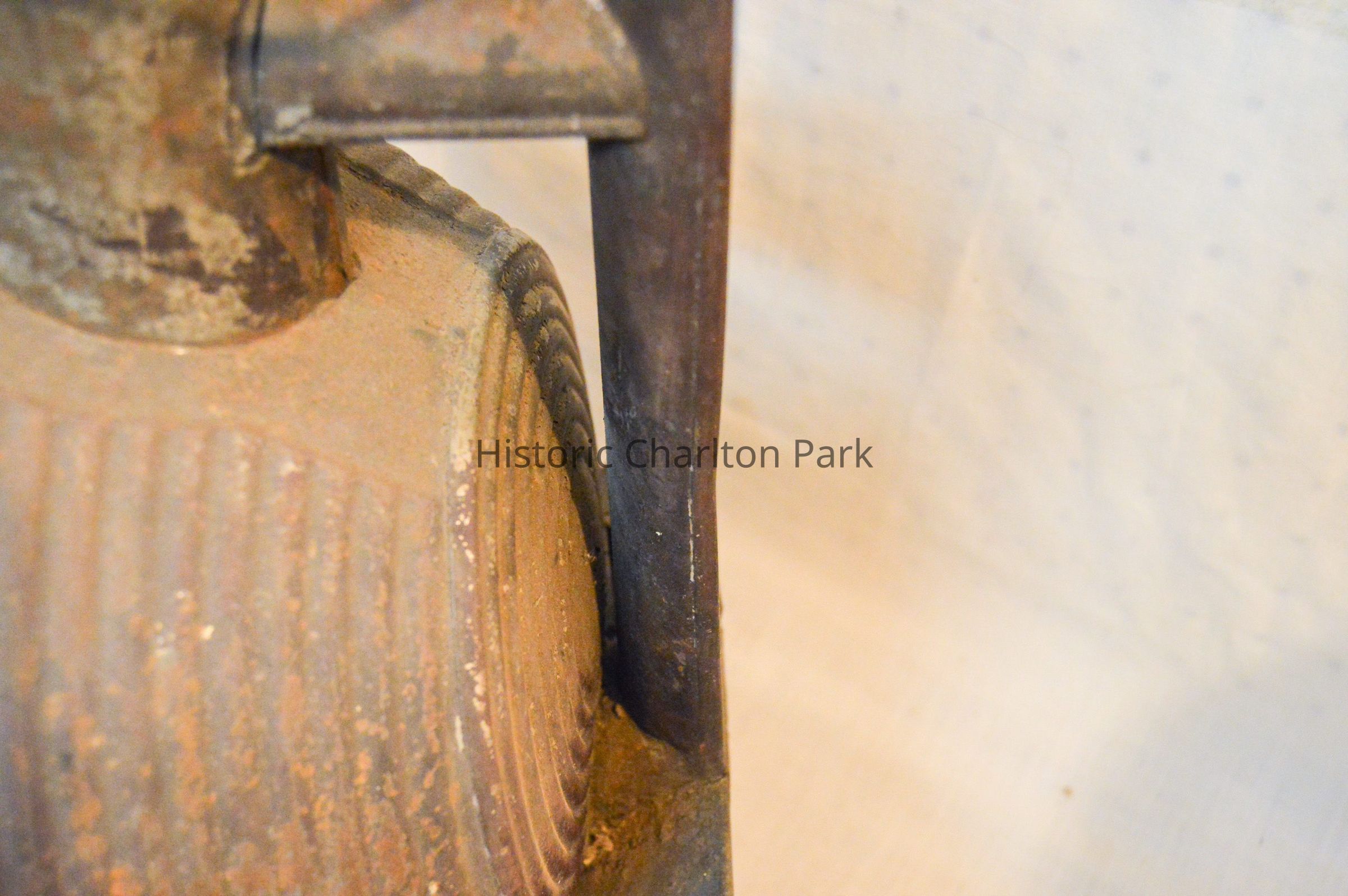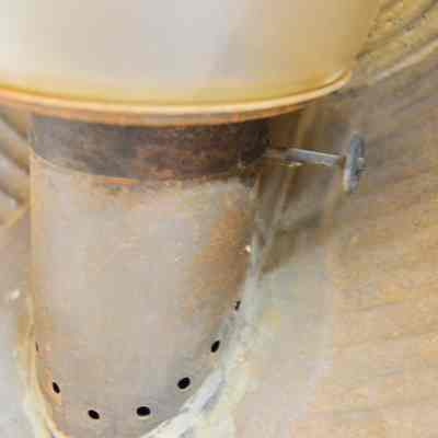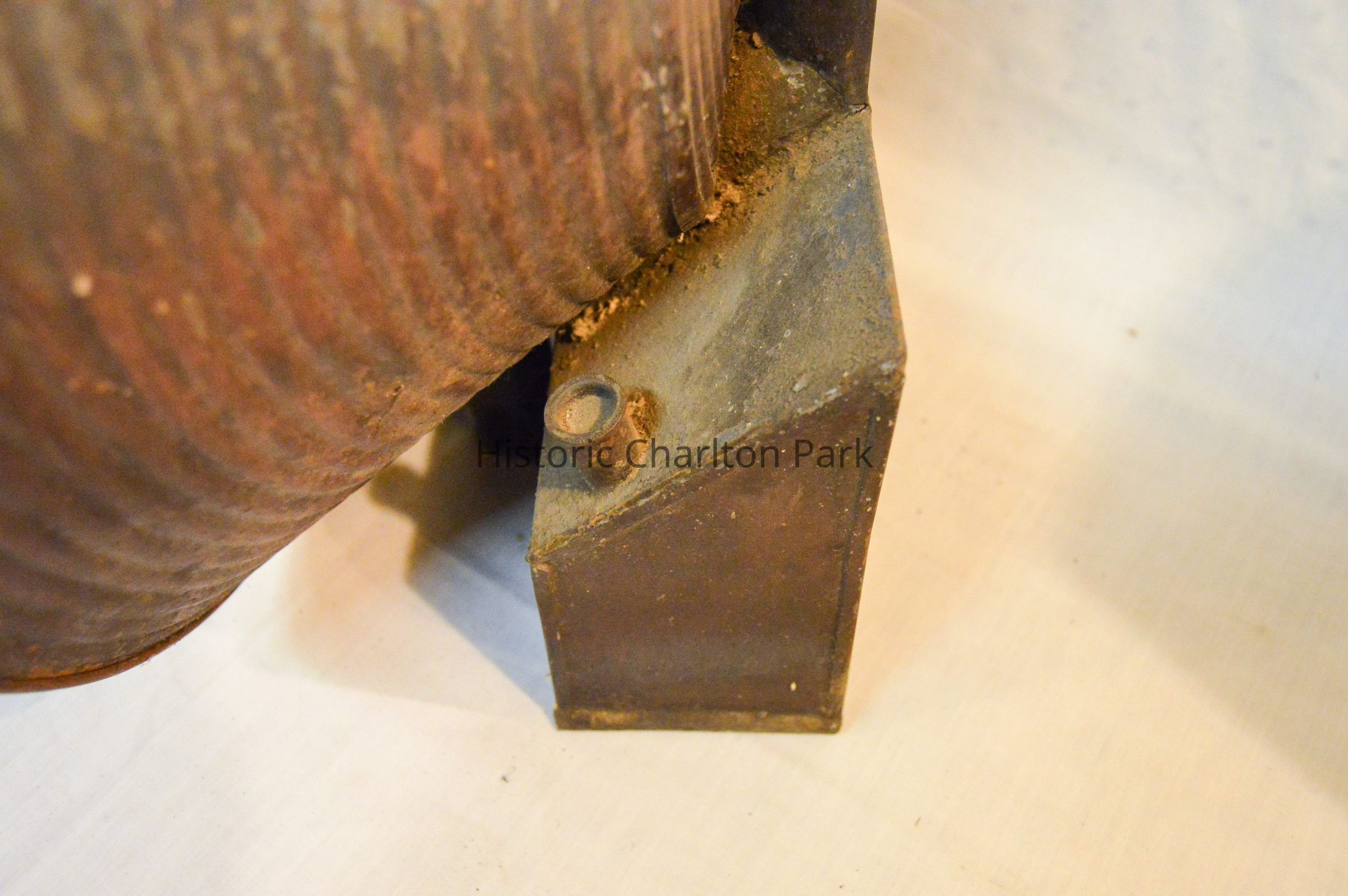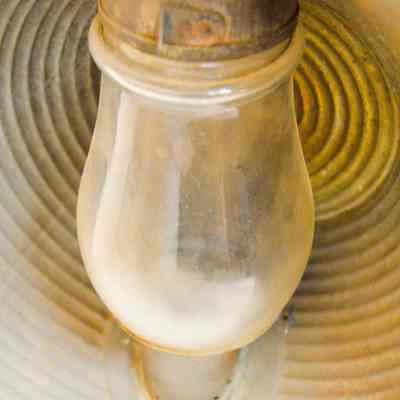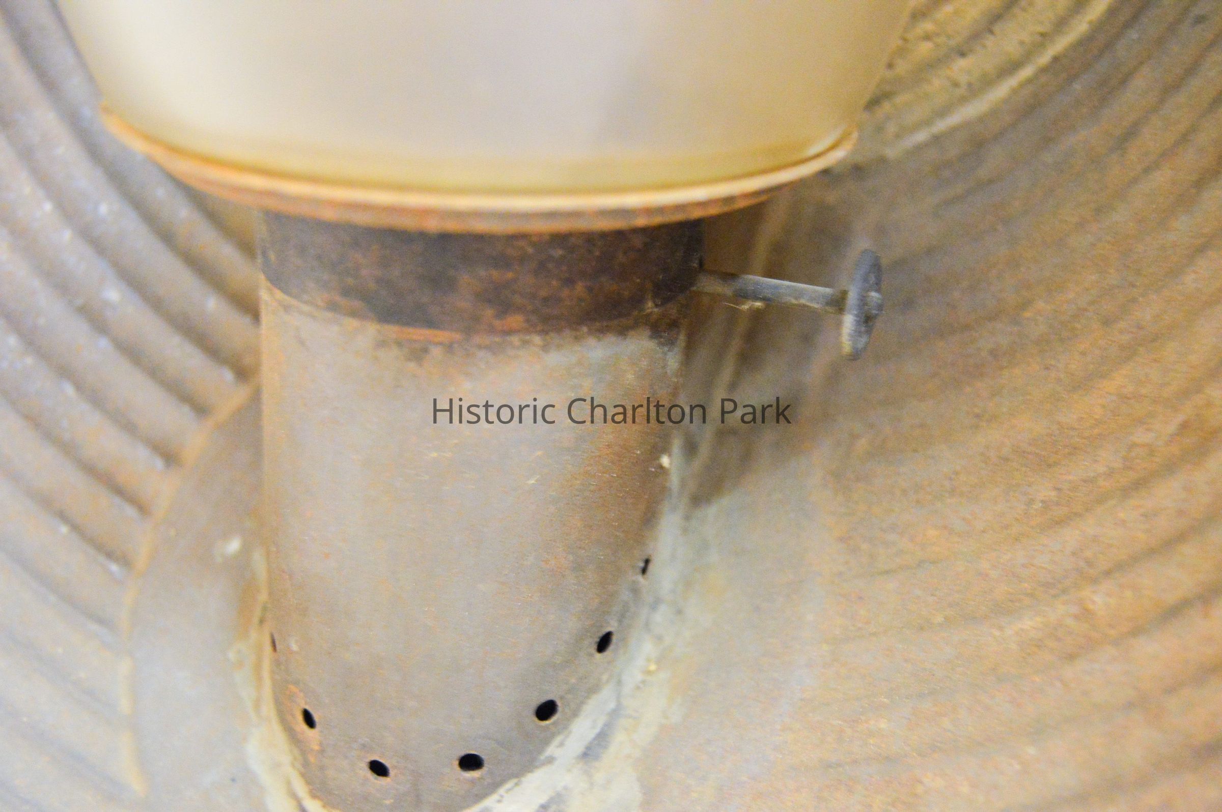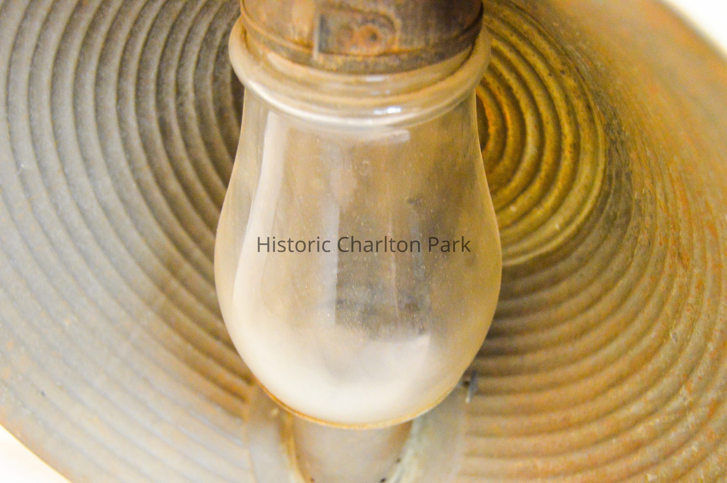 Very large kerosene lantern with a rectangular base and a slanted edge at the top. There is a small fuel cap on the right side of the base and a large, rectangular bracket in the center that extends upwards. The bracket supports the large, conical reflector on the front of the lantern and the cylindrical cap at the top. Inside the conical reflector, there is a burner on a cylindrical post which consists of a round knob, a ring with circular vents, and a dome-shaped emitter. A glass chimney with a pear-shaped body sits on top of the burner and is capped at the top. The top of the lantern has a looped metal handle.Dimensions
