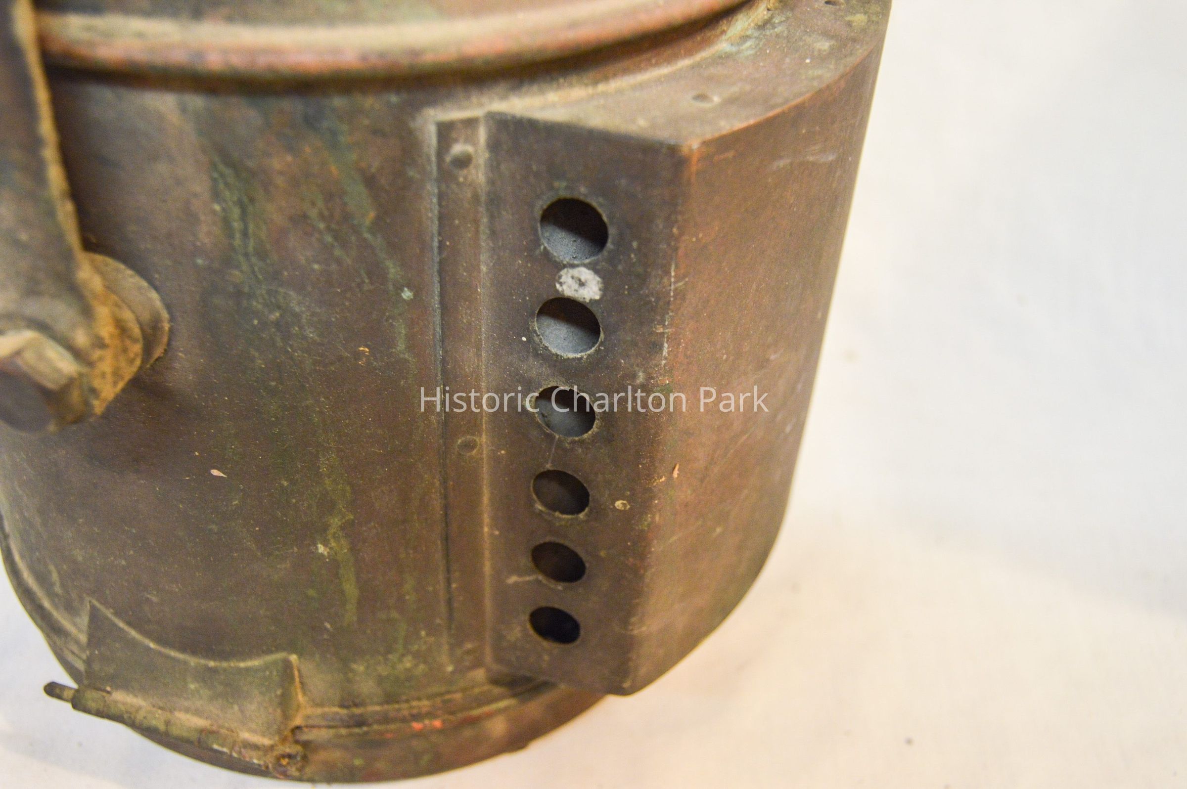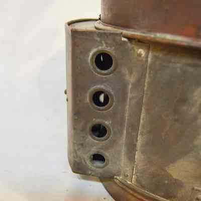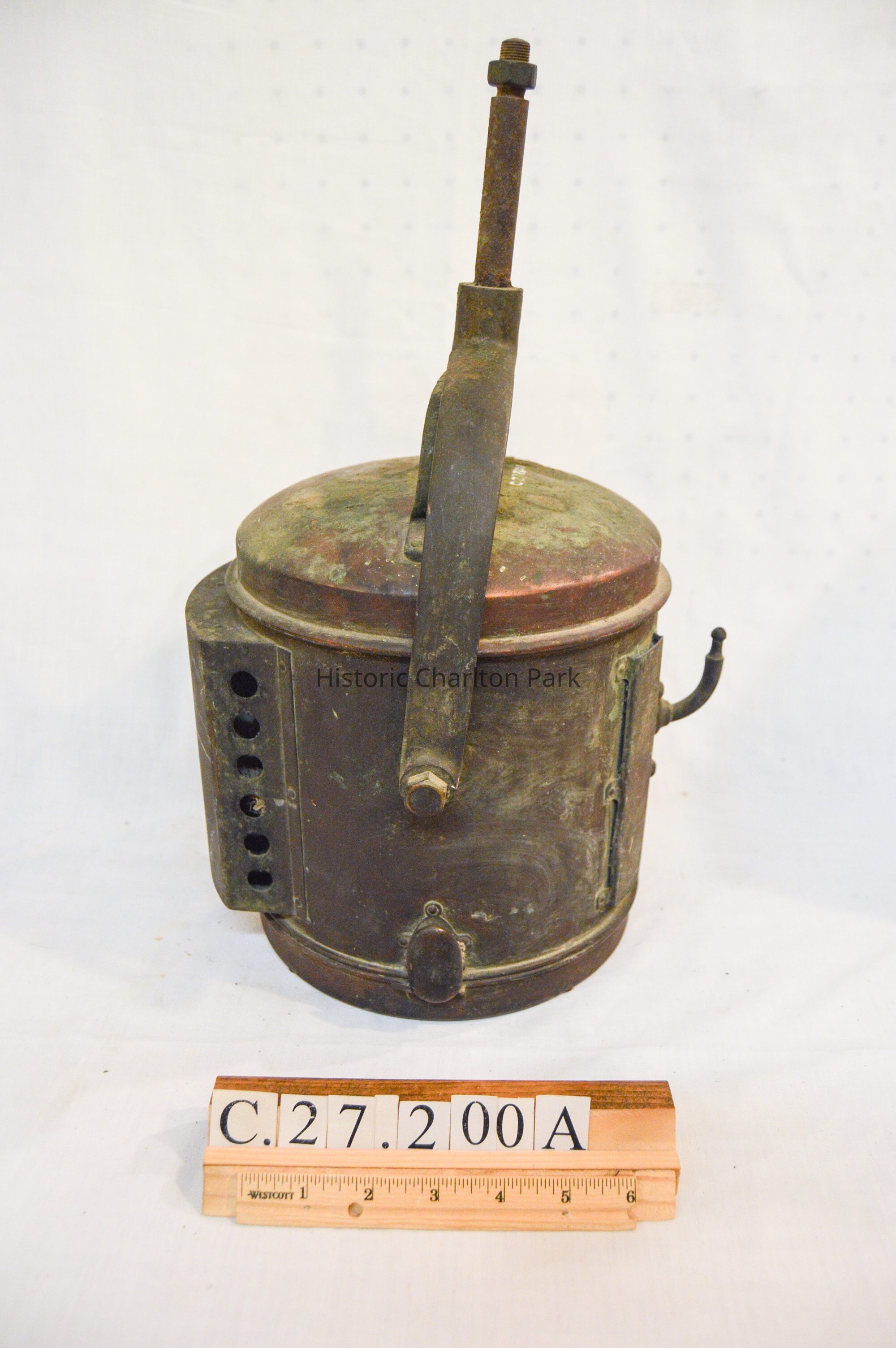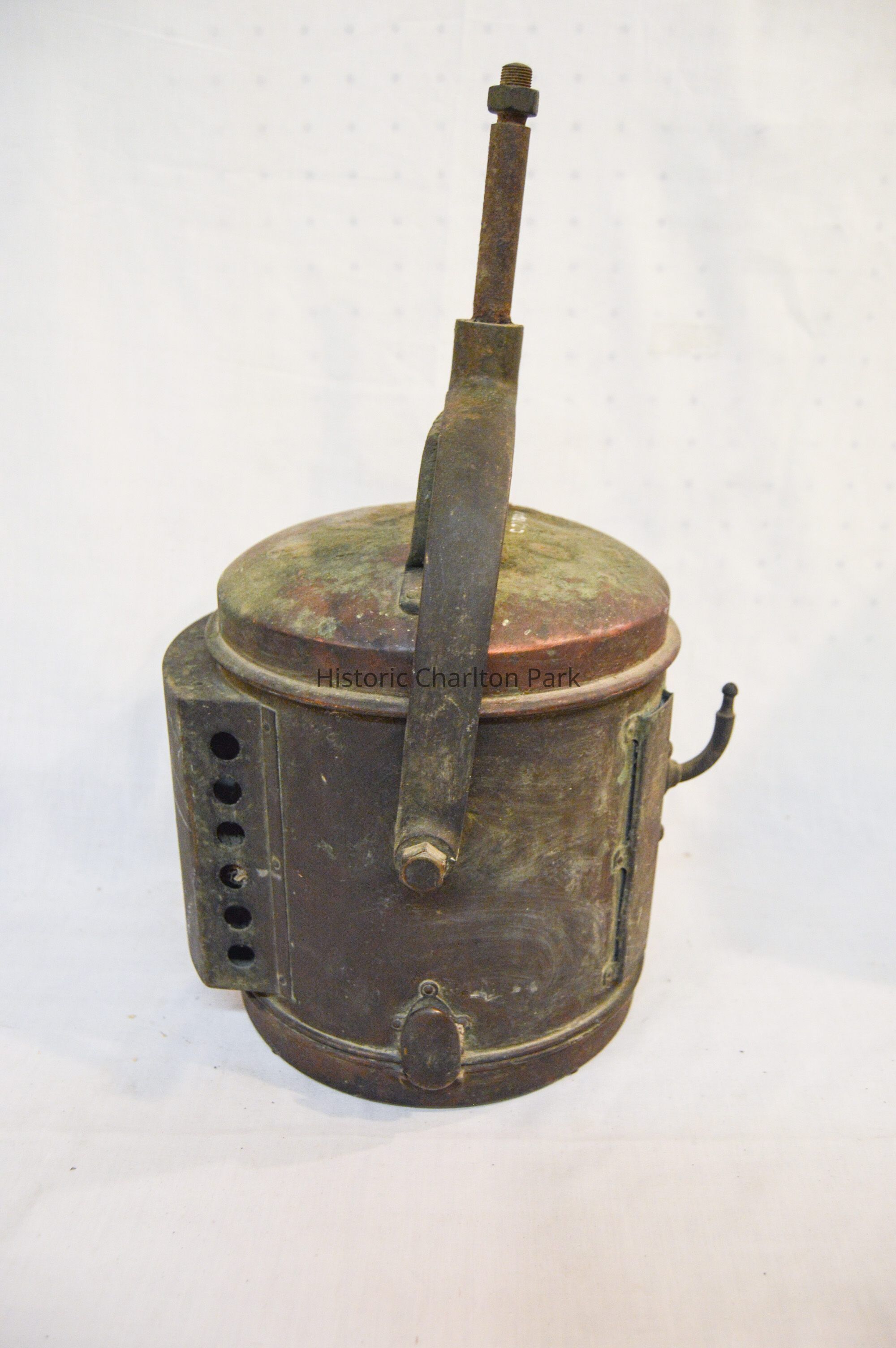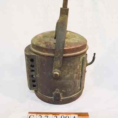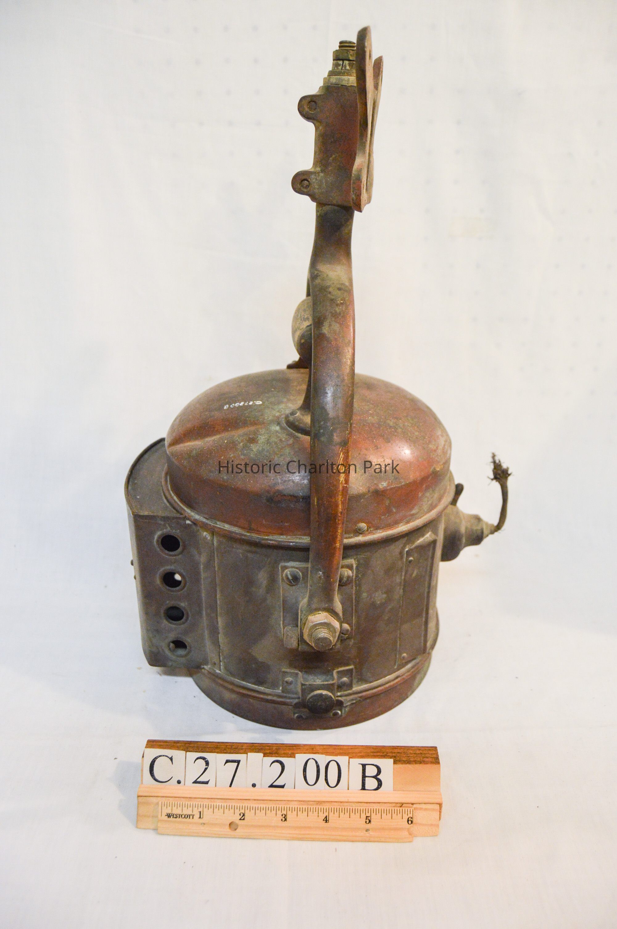A: The lantern has a cylindrical body, with a circular glass window on the front. The glass is held in place by a circular frame that swings open on a hinge and clasps shut on the opposite side. There is a rectangular vent box at the top of the lantern, and a small fuel nozzle at the bottom. A bracket is attached to either side of the spotlight and meets at the back, where there is a cylindrical bolt extending from it. Below the bracket is a rounded handle.