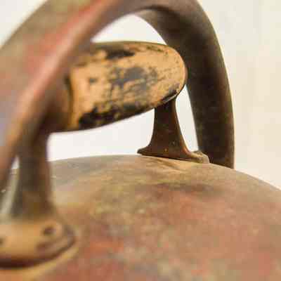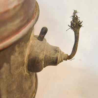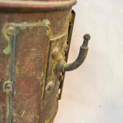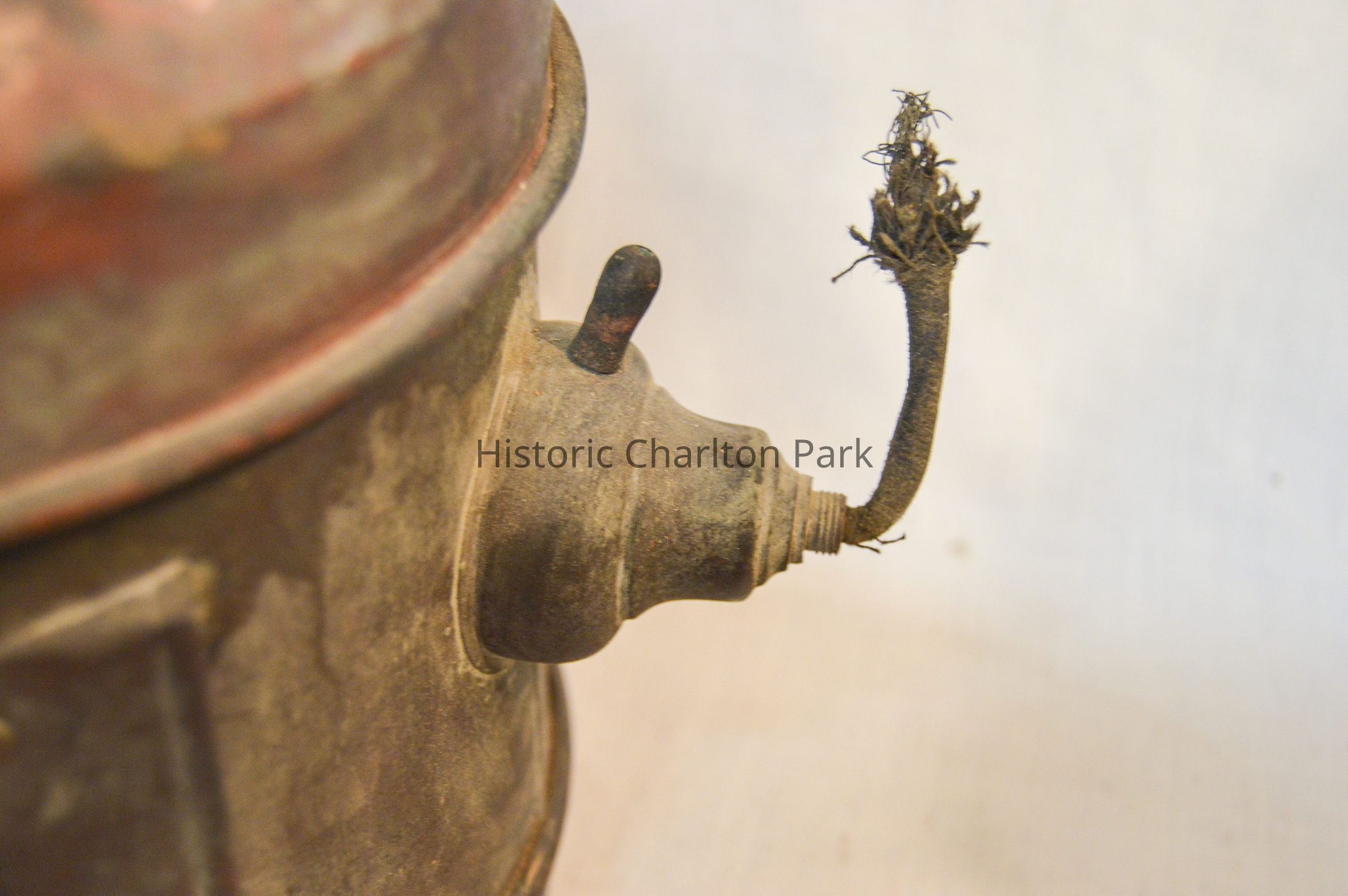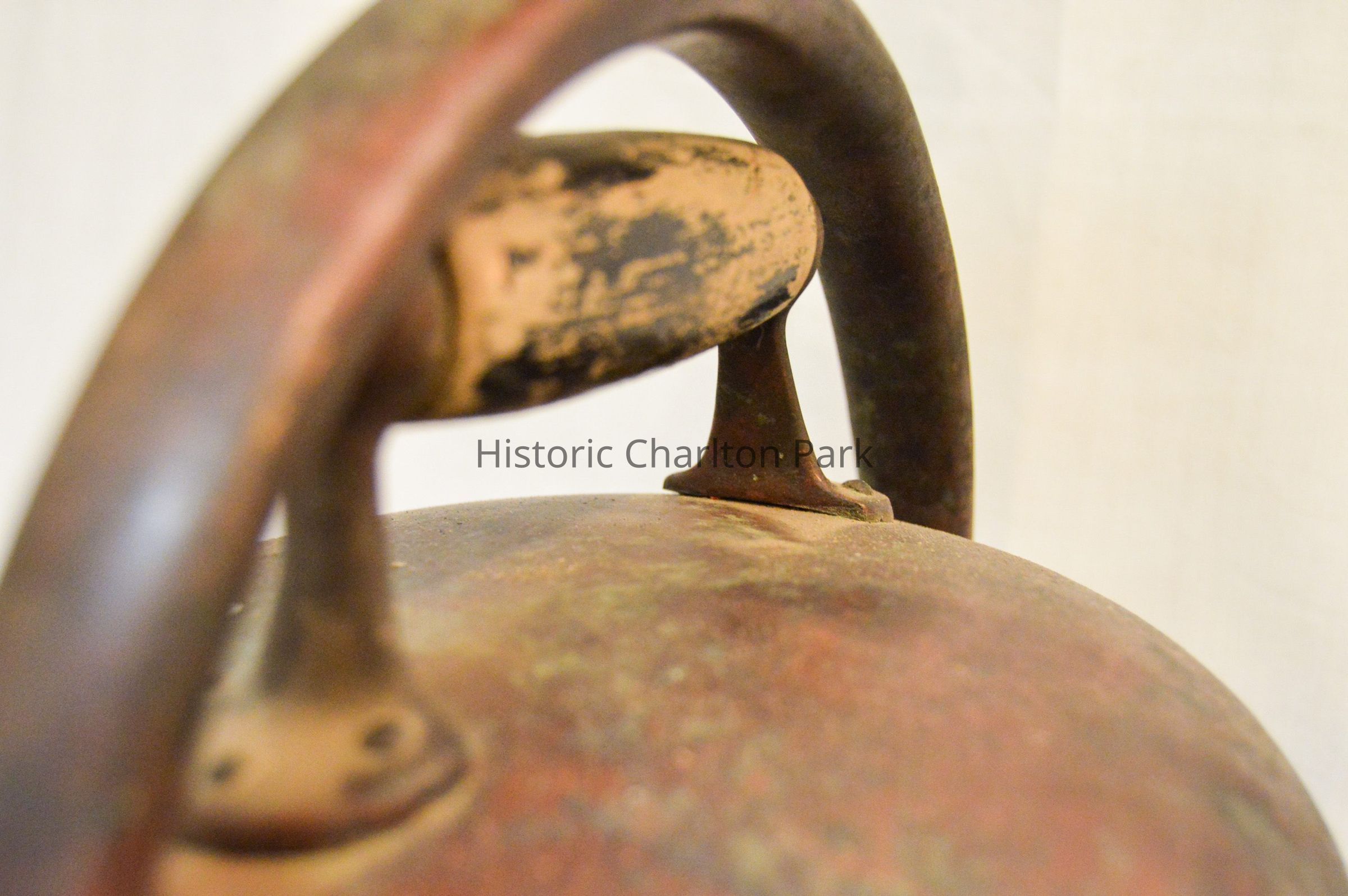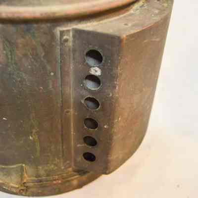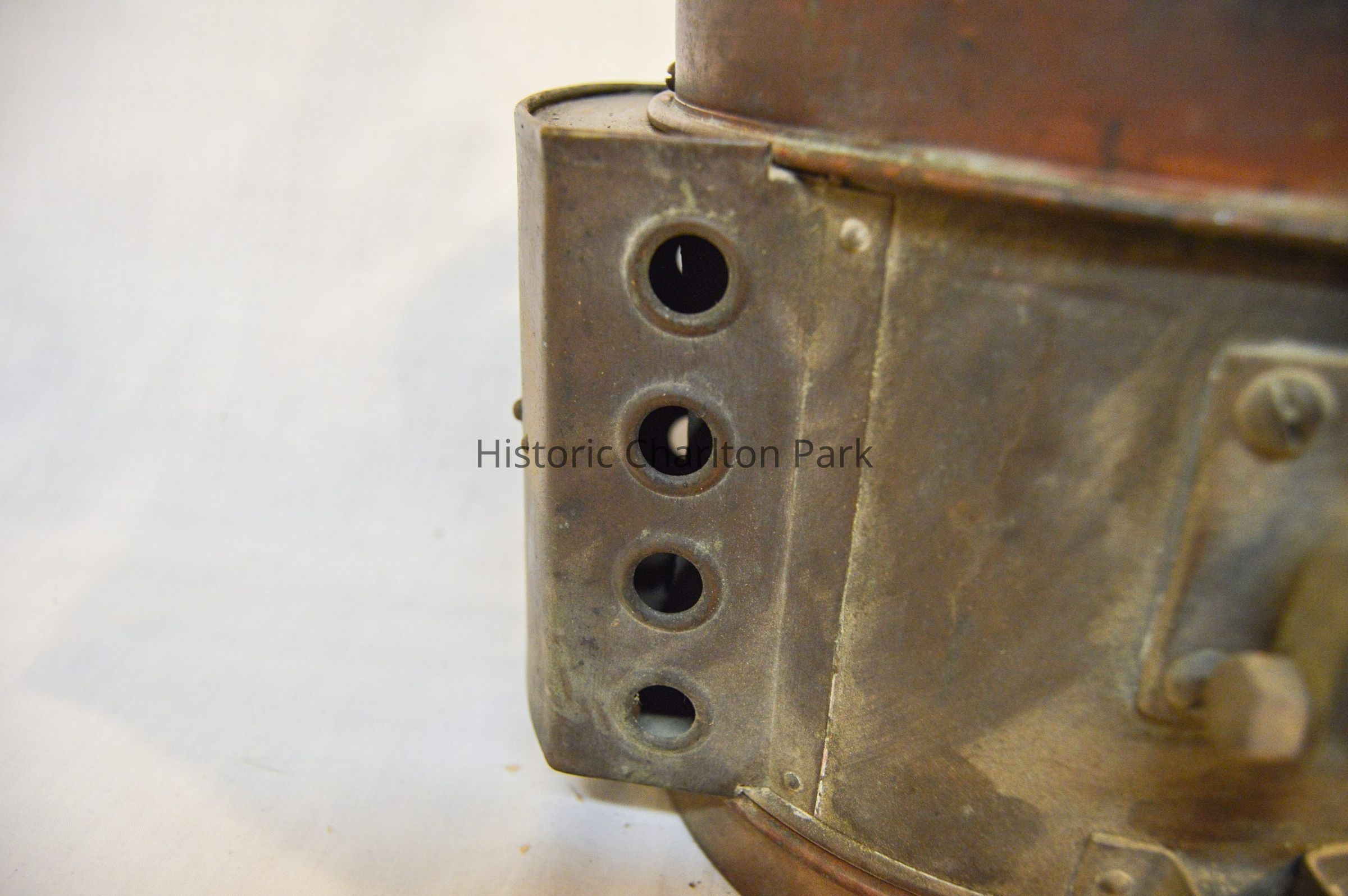 A: The lantern has a cylindrical body, with a circular glass window on the front. The glass is held in place by a circular frame that swings open on a hinge and clasps shut on the opposite side. There is a rectangular vent box at the top of the lantern, and a small fuel nozzle at the bottom. A bracket is attached to either side of the spotlight and meets at the back, where there is a cylindrical bolt extending from it. Below the bracket is a rounded handle.