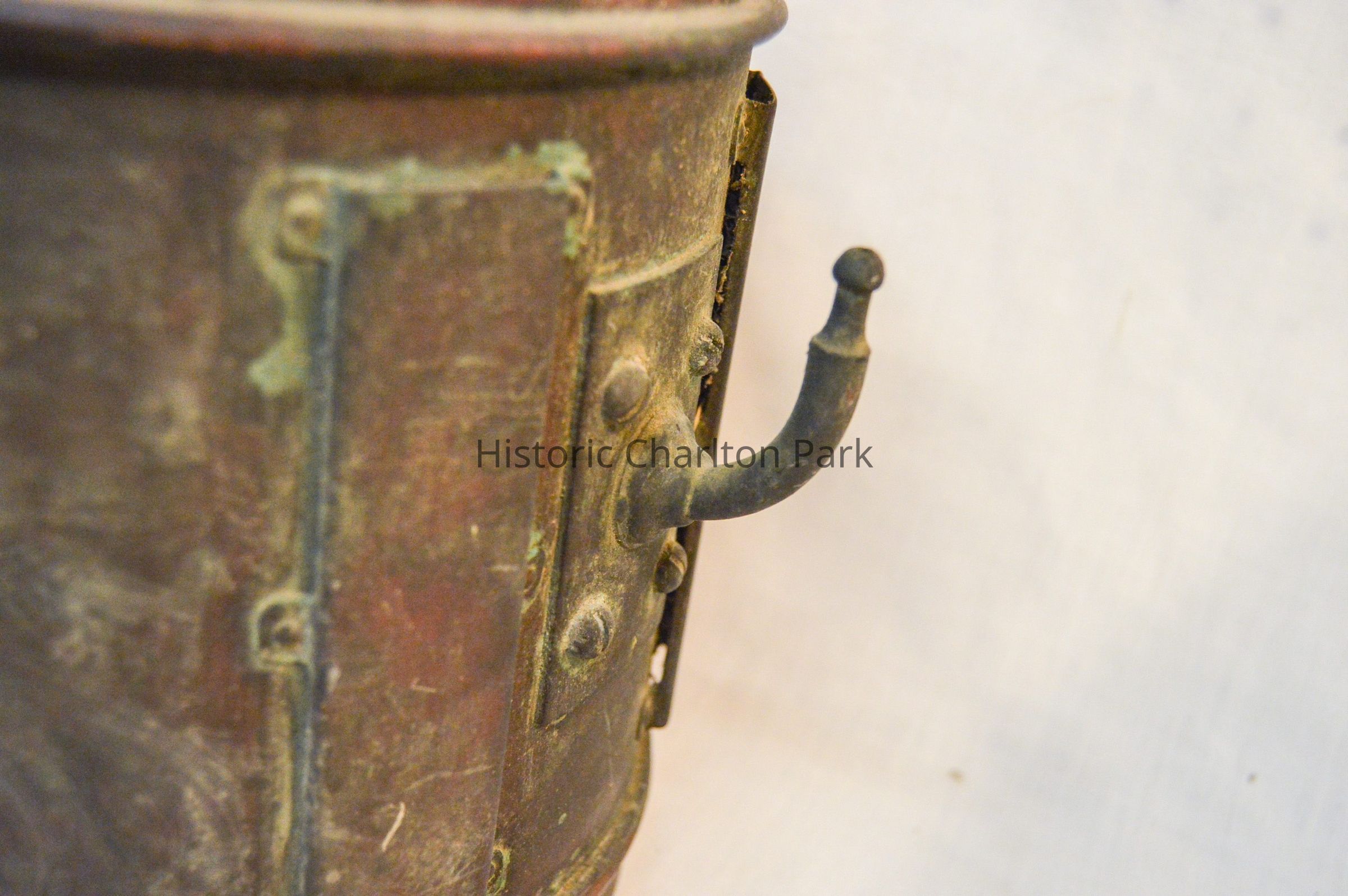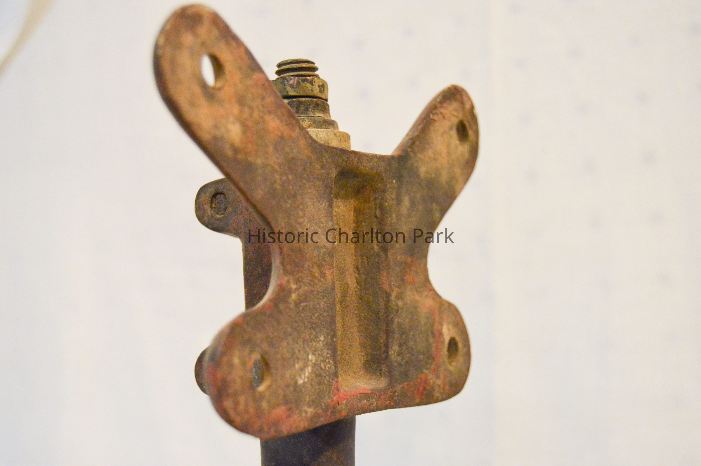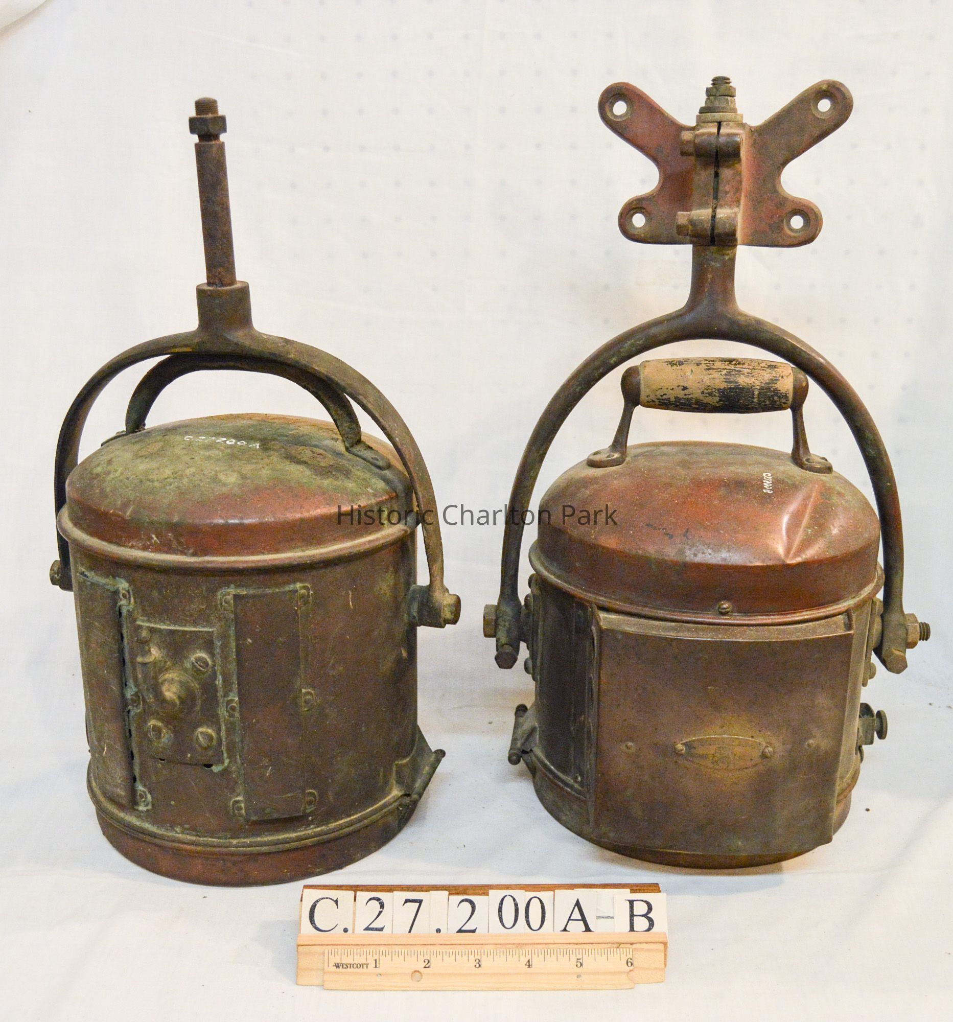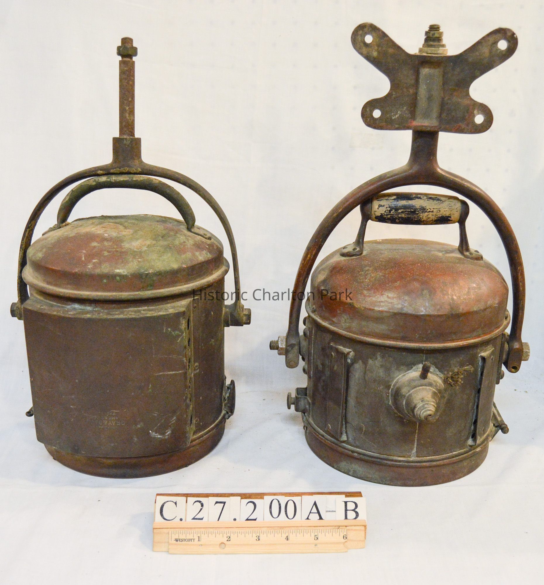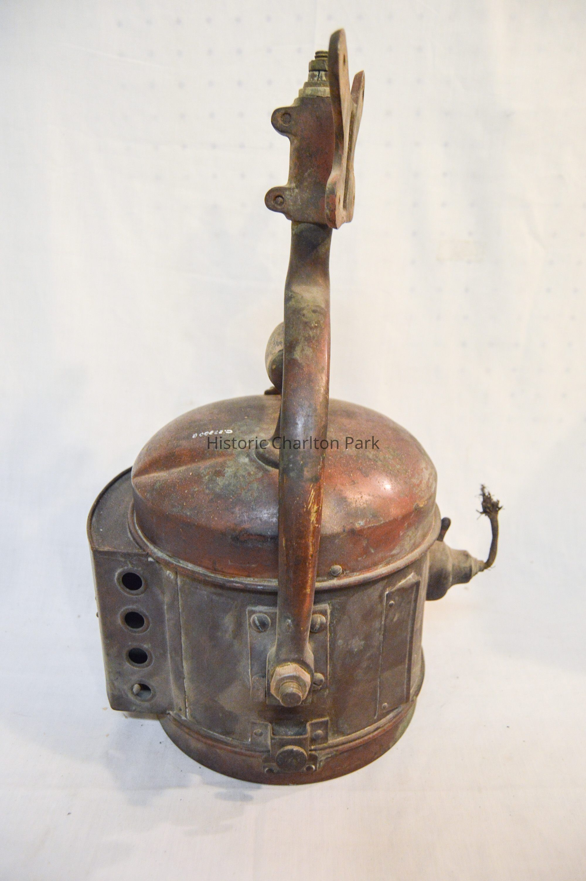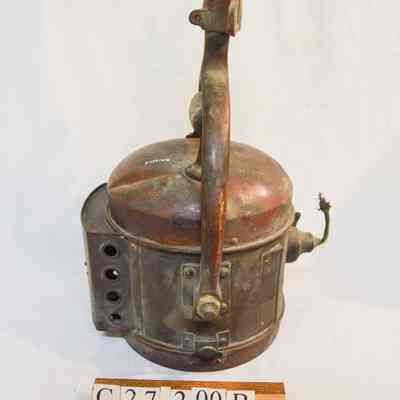 B: The lantern has a cylindrical body and a circular, glass window on the front. The window is held in place by a circular metal frame that opens via hinge and clasps on the opposite side. On the top of the lantern, there is a rectangular vent box, and on the bottom there is a severed electrical wire. A large bracket is attached to either side of the spotlight and extends up and over the back, where there is a butterfly-shaped plate with holes to mount the spotlight. There is also a handle with a wooden grip attached to the back.Inscription/Signature/Marks