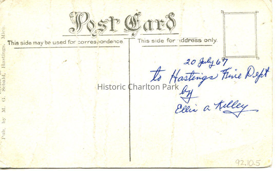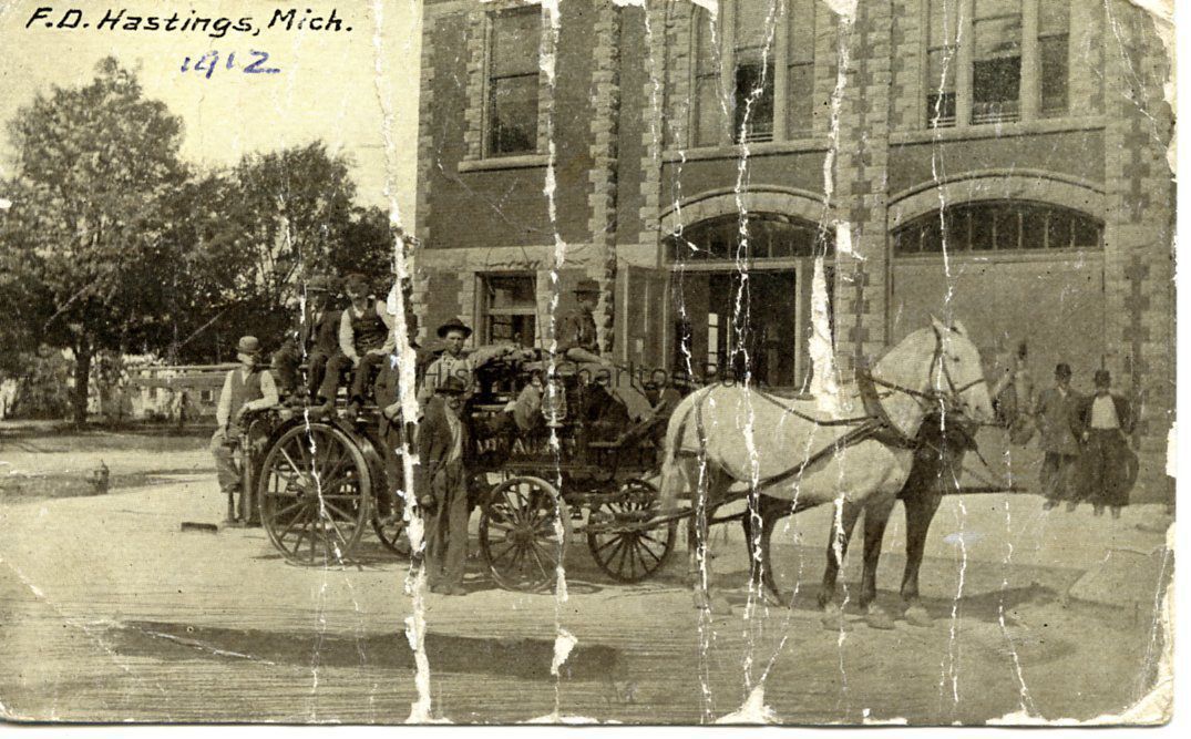 Hastings Fire Department, ca. 1912, housed in Hastings City Hall. Black and white photograph on postcard. Picture includes horse-drawn fire rig with men in front of firestation. "F.D. Hastings, Mich., 1912" written in upper left corner. Divided back with "20 July 67 to Hastings Fire Dept. by Ellis A. Kelley" handwritten on back.