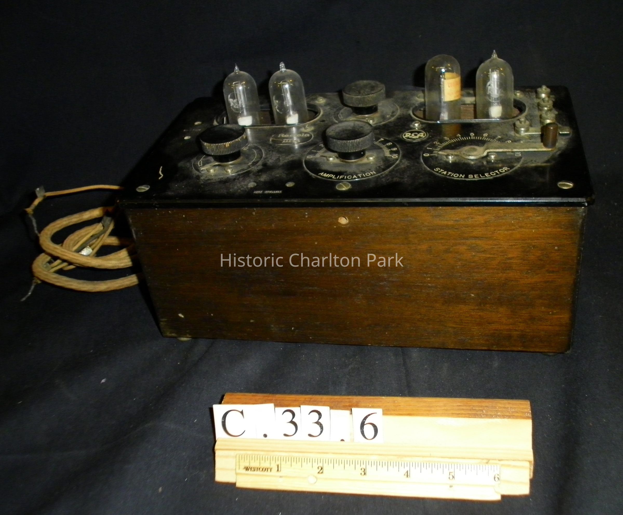 RCA Radiola III-A that was patented 1908-1921. Body of radio is made of wood, while its face is made of black metal with plastic knobs. There are four RCA lightbulbs still attached to its surface along with an orange colored cord. The serial number engraved on the bottom of the radio is 265254.Dimensions