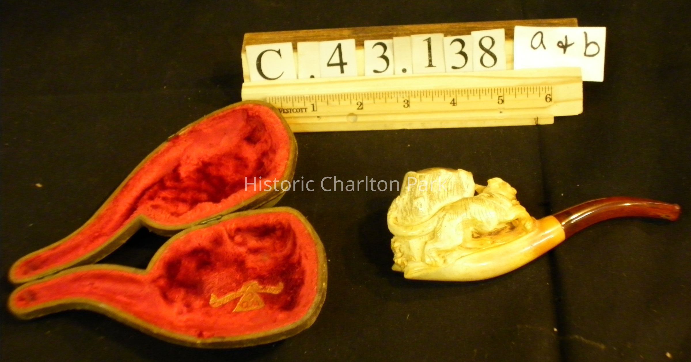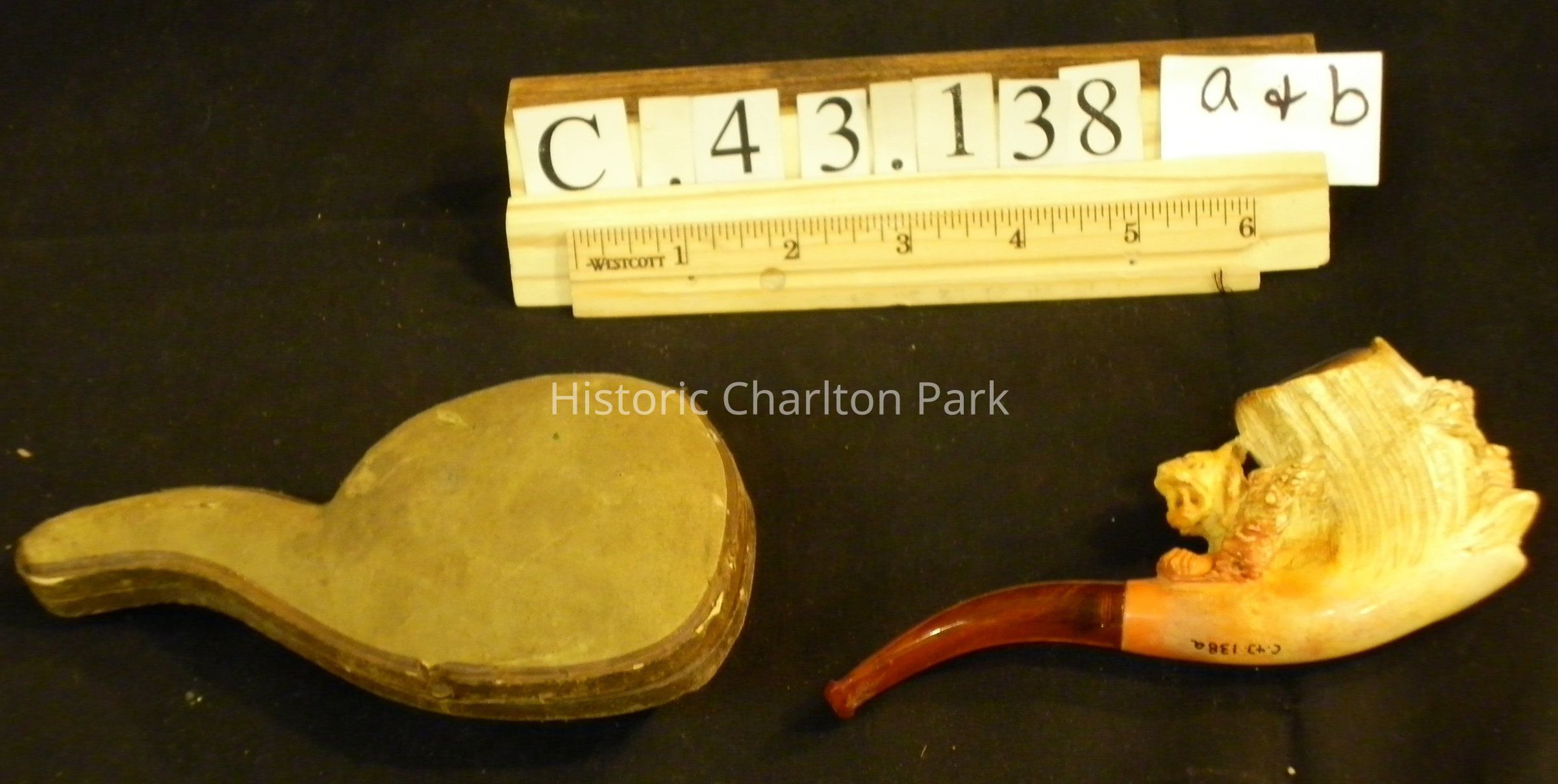 A. WDC Meerschaum pipe, with an amber color stem. Bowl is modeled to depict a lion snarling with their body wrapped around a tree stump.