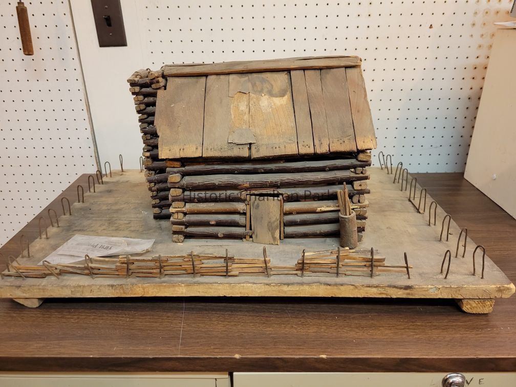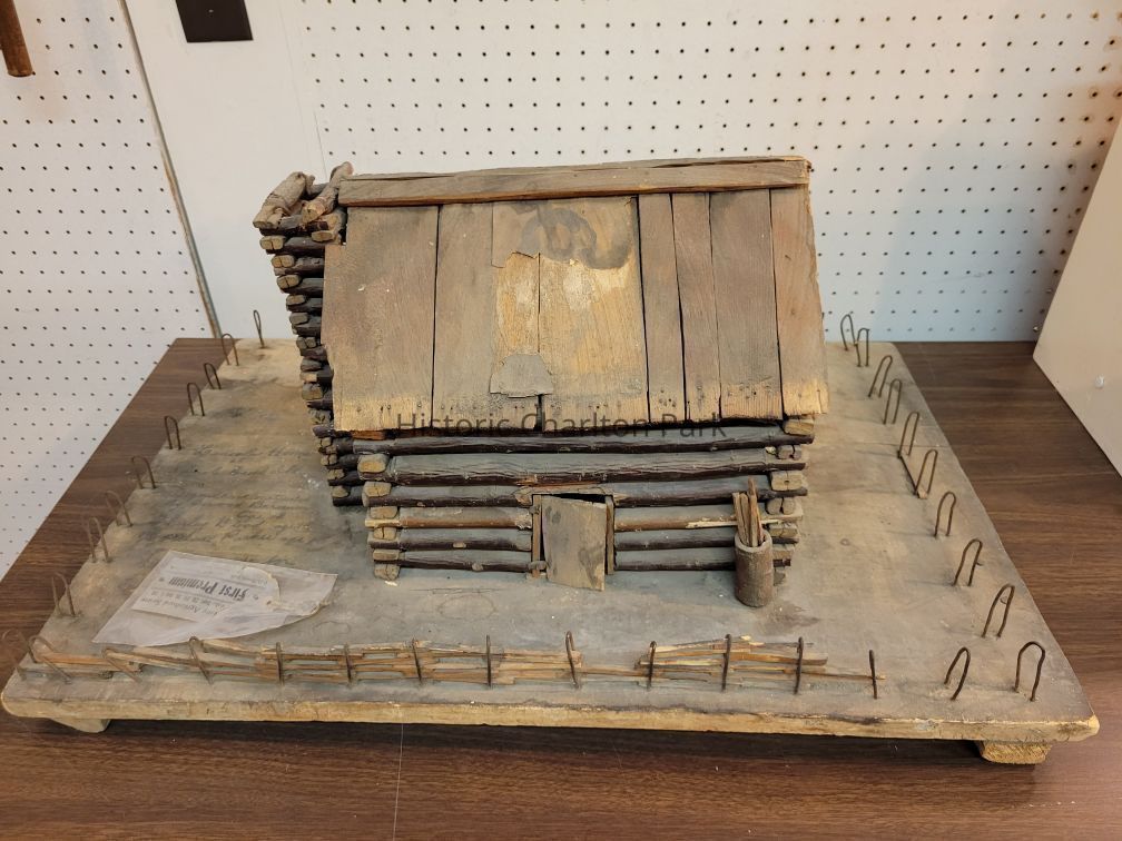 A) Model of Lincoln's home in Knob Creek, IL. It was designed and constructed by Barnum School students Elwood Barnum, Sherley Blood, and Gordon Parker. The project was submitted to the 1909 Barry County Fair, where it won First Premium
