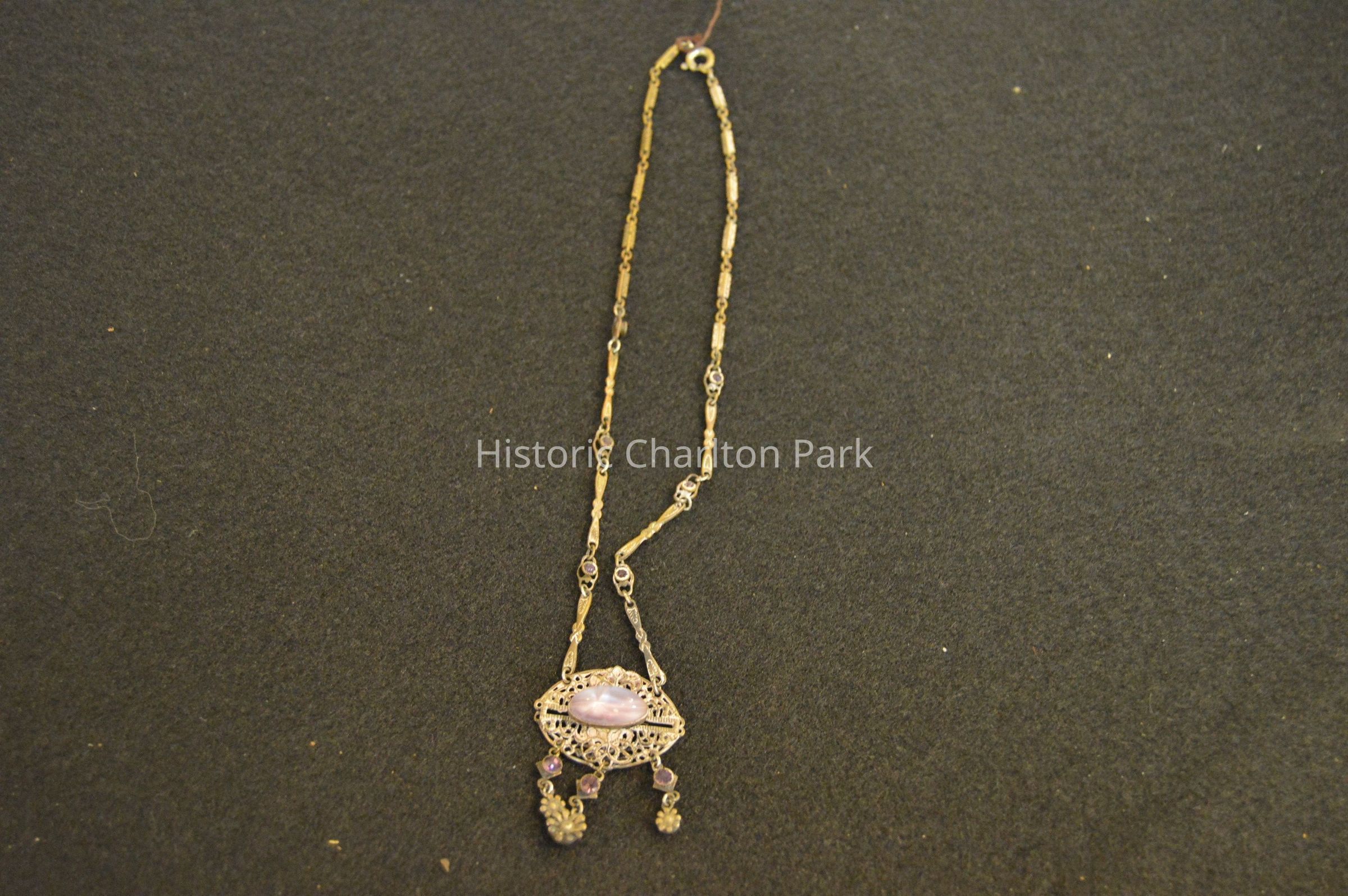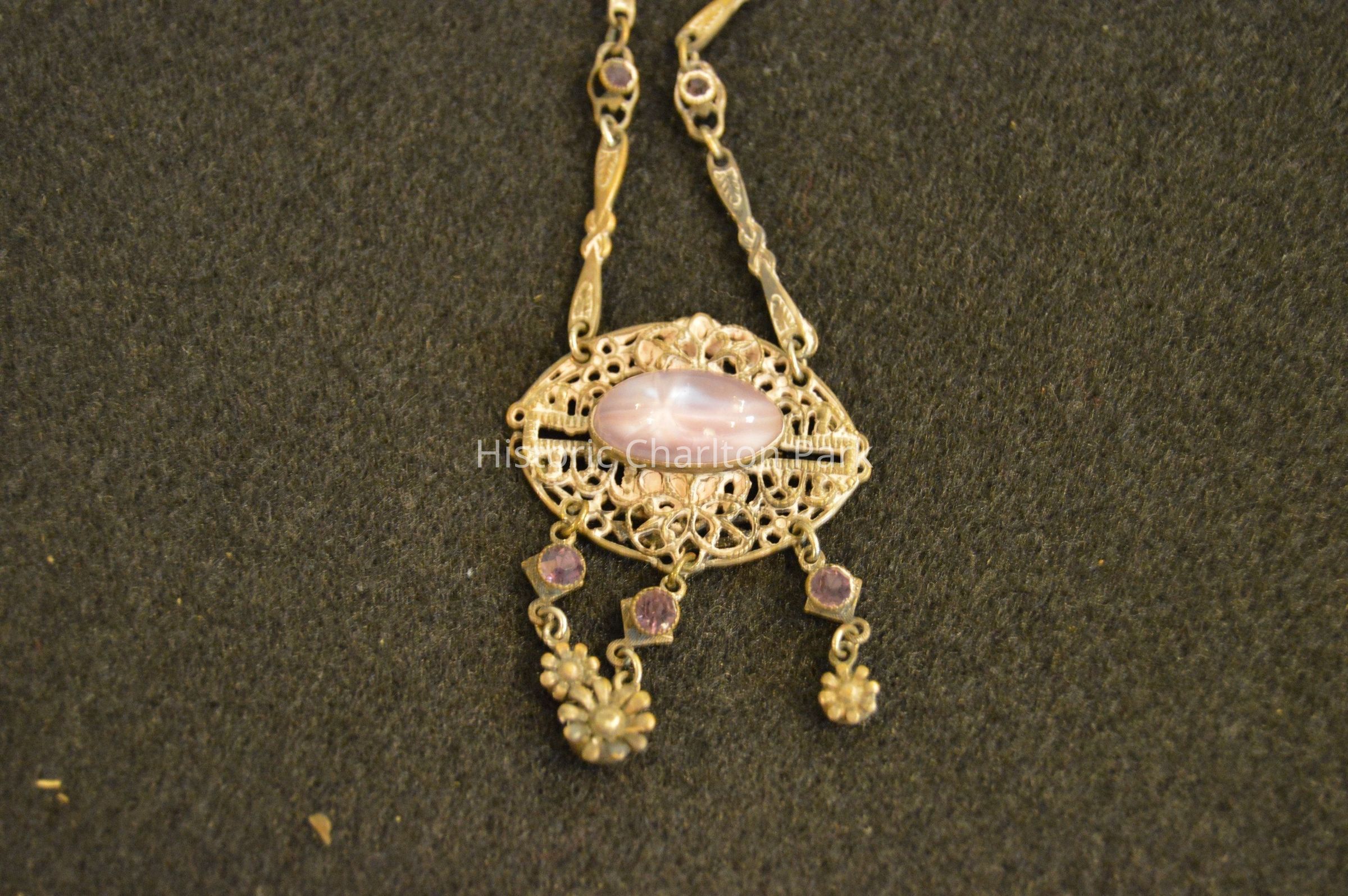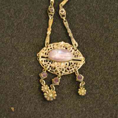 Gold ornate chain with purple accent stones, and an oval shaped pendant with a lavender cabochon cut stone at center, and small hanging flowers and purple stones at the bottom of the pendant.