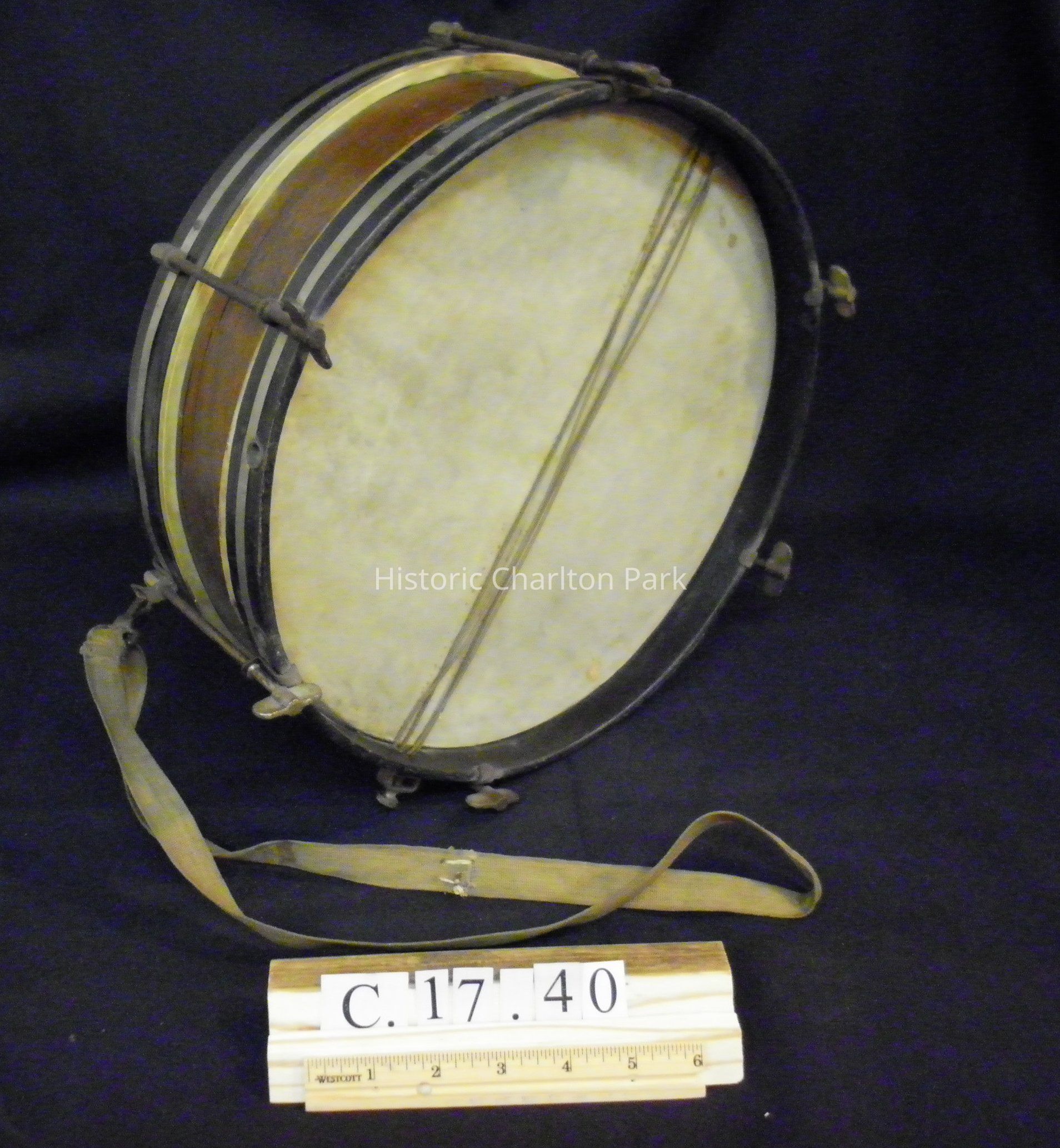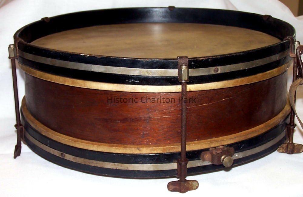 A snare drum with maple shell and hoops. There are six nickel plated rods, four metal snares and two calfskin heads. The snare drum has a canvas sling.