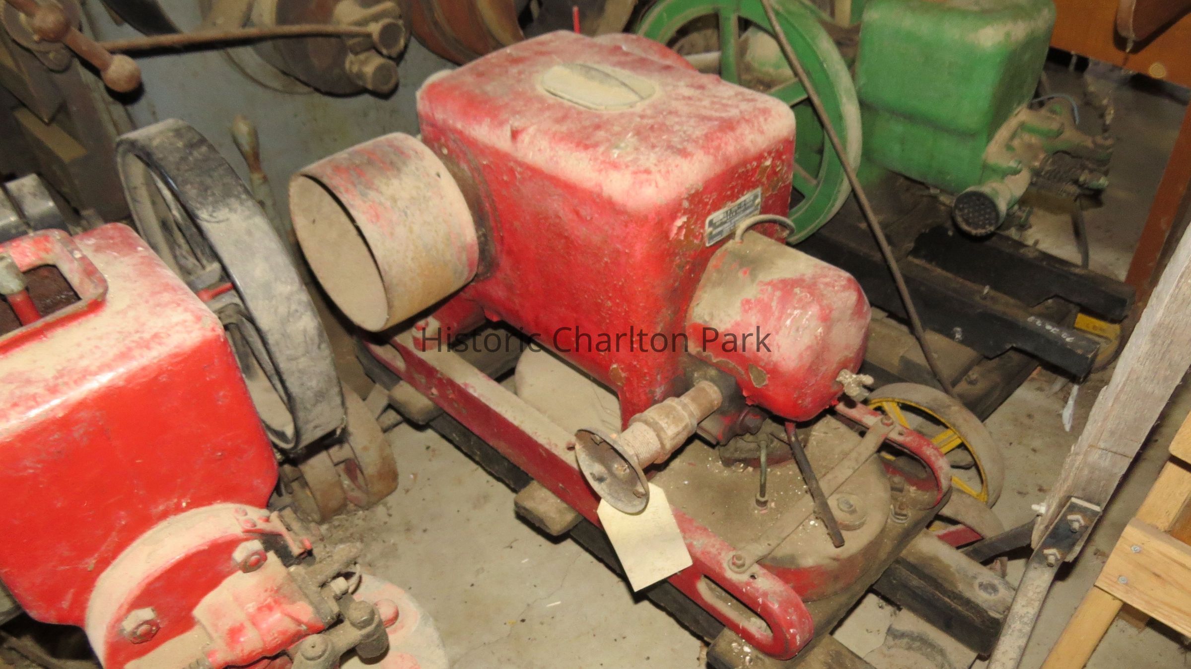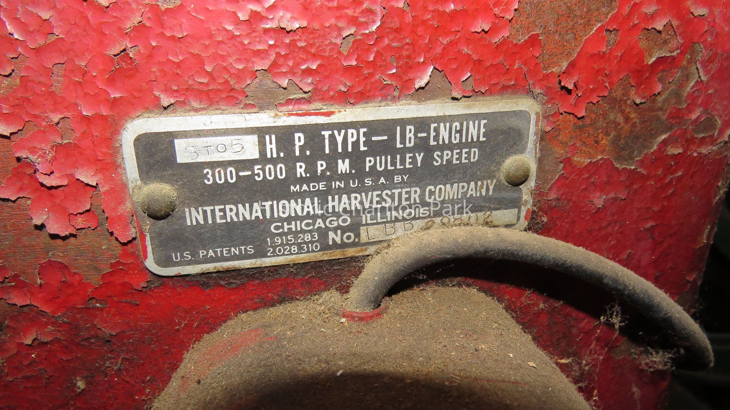 On the tag: "3 to 5 H.P. Type - LB - Engine, 300-500 R.P.M. Pulley Speed, Made in the U.S.A. by International Harvester Company, Chicago Illinois, U.S. Patents 1.915.283, 2.028.310, No. LBB29802.Acquisition
