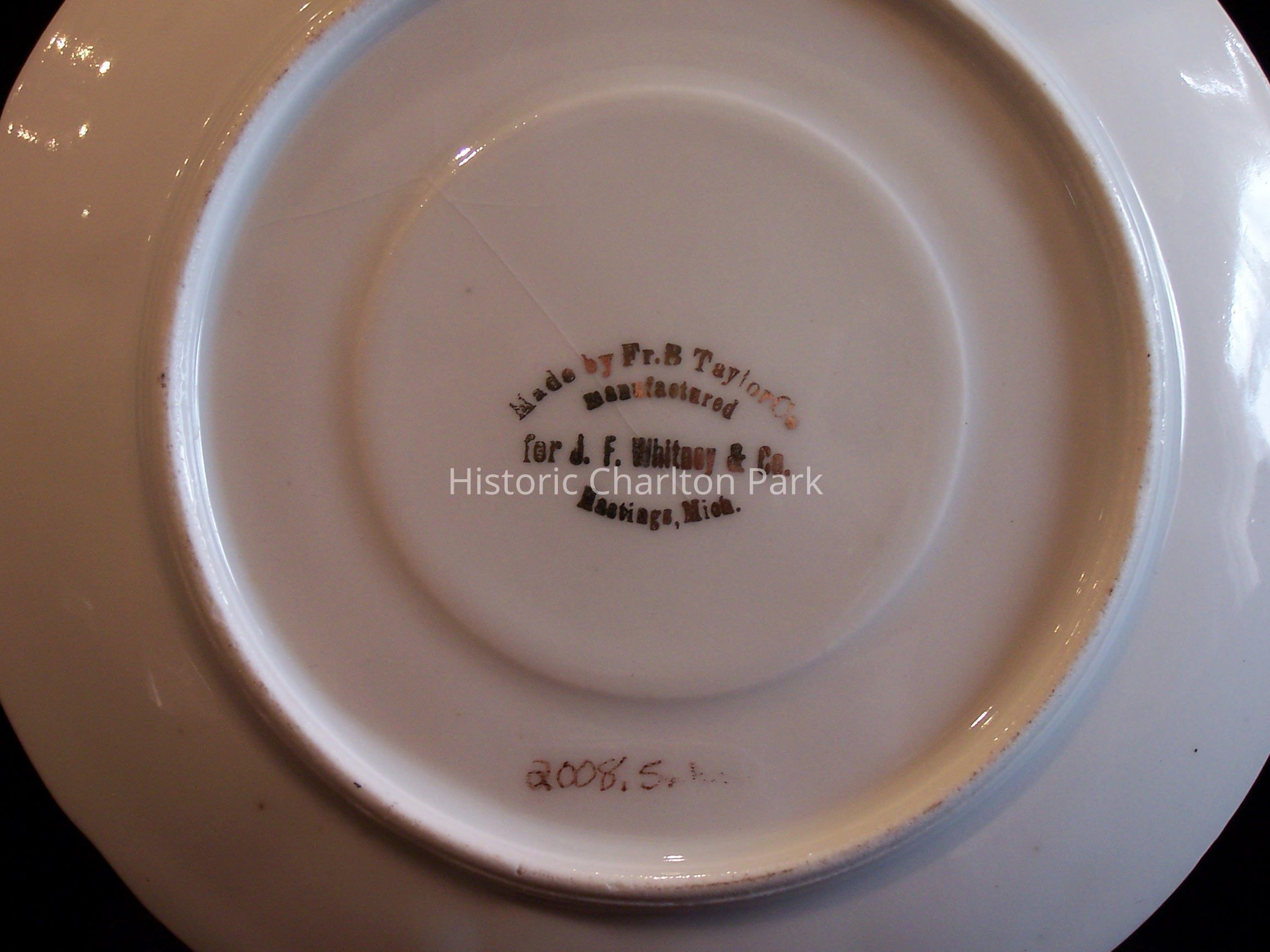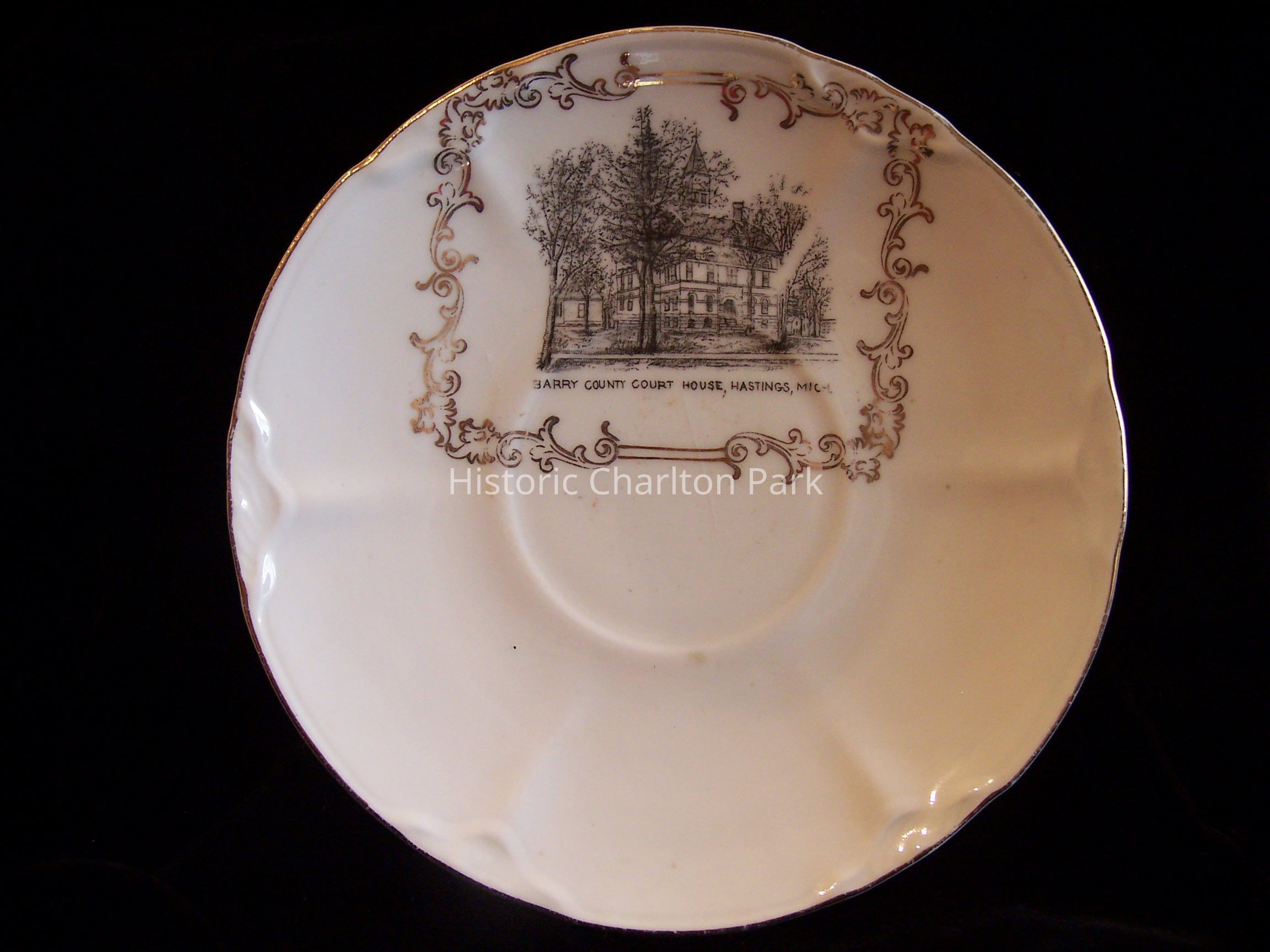 White porcelain saucer, gilded lip and frame surrounding black transfer image of "Barry County Courthouse, Hastings, MIch.". Maker's mark on back: "Made by Fr. B. Taylor Co. manufactured for J.F. Whitney & Co., Hastings, Mich."