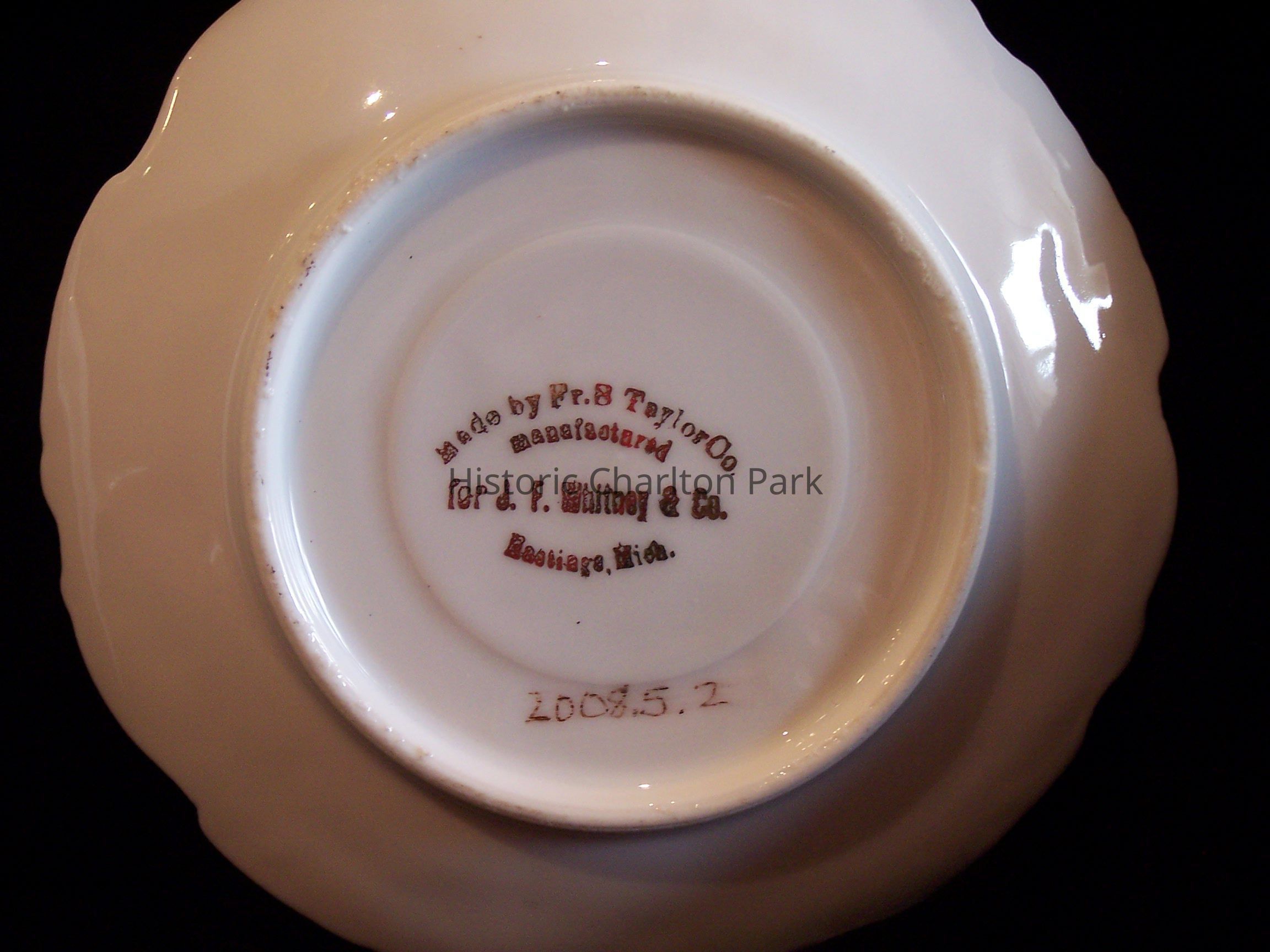 White porcelain saucer, gilded and patterned lip with black transfer image of "City Hall, Hastings, MIch.". Maker's mark on back: "Made by Fr. B. Taylor Co. manufactured for J.F. Whitney & Co., Hastings, Mich."