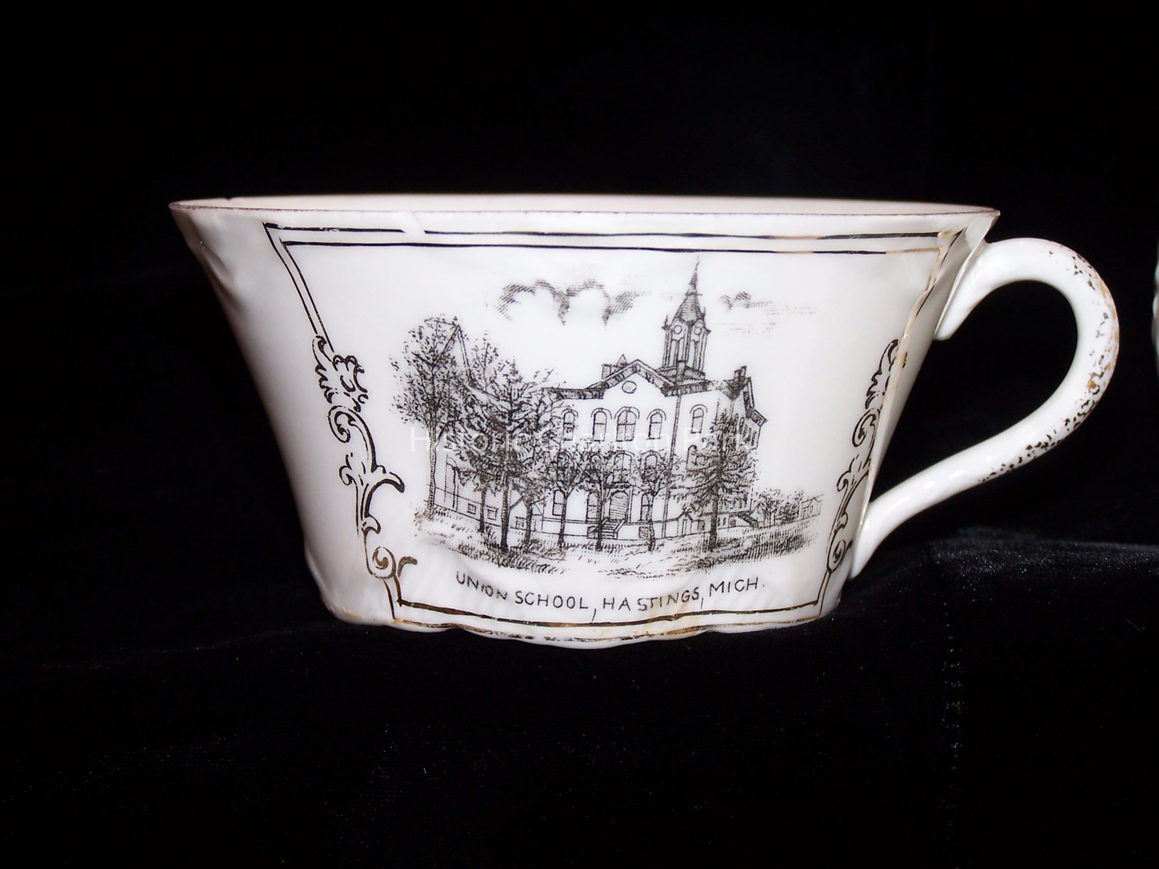 White porcelain cup, gilded lip that flares outward with black transfer image of "Union School, Hastings, MIch." No maker's mark on the bottom.
