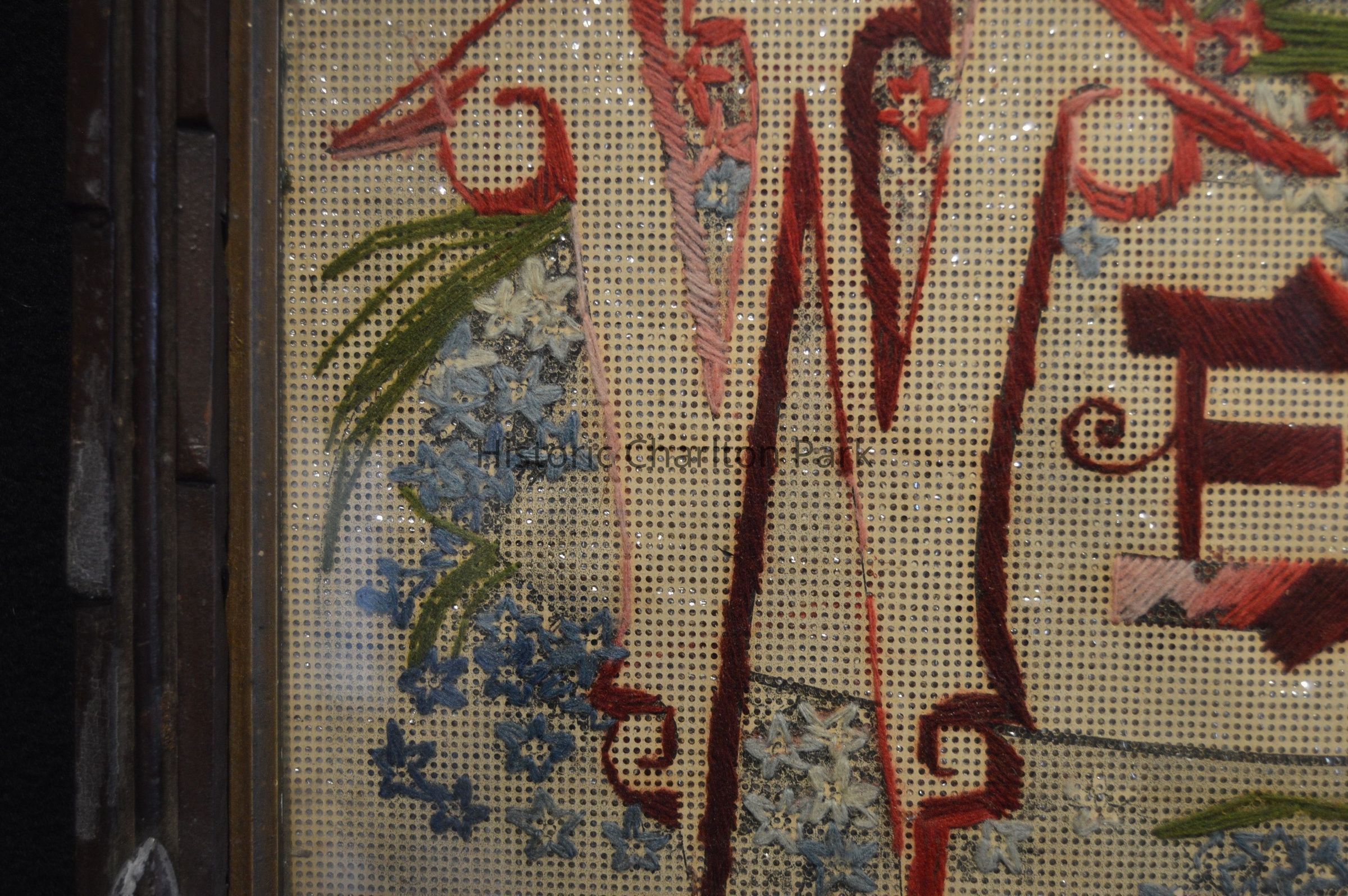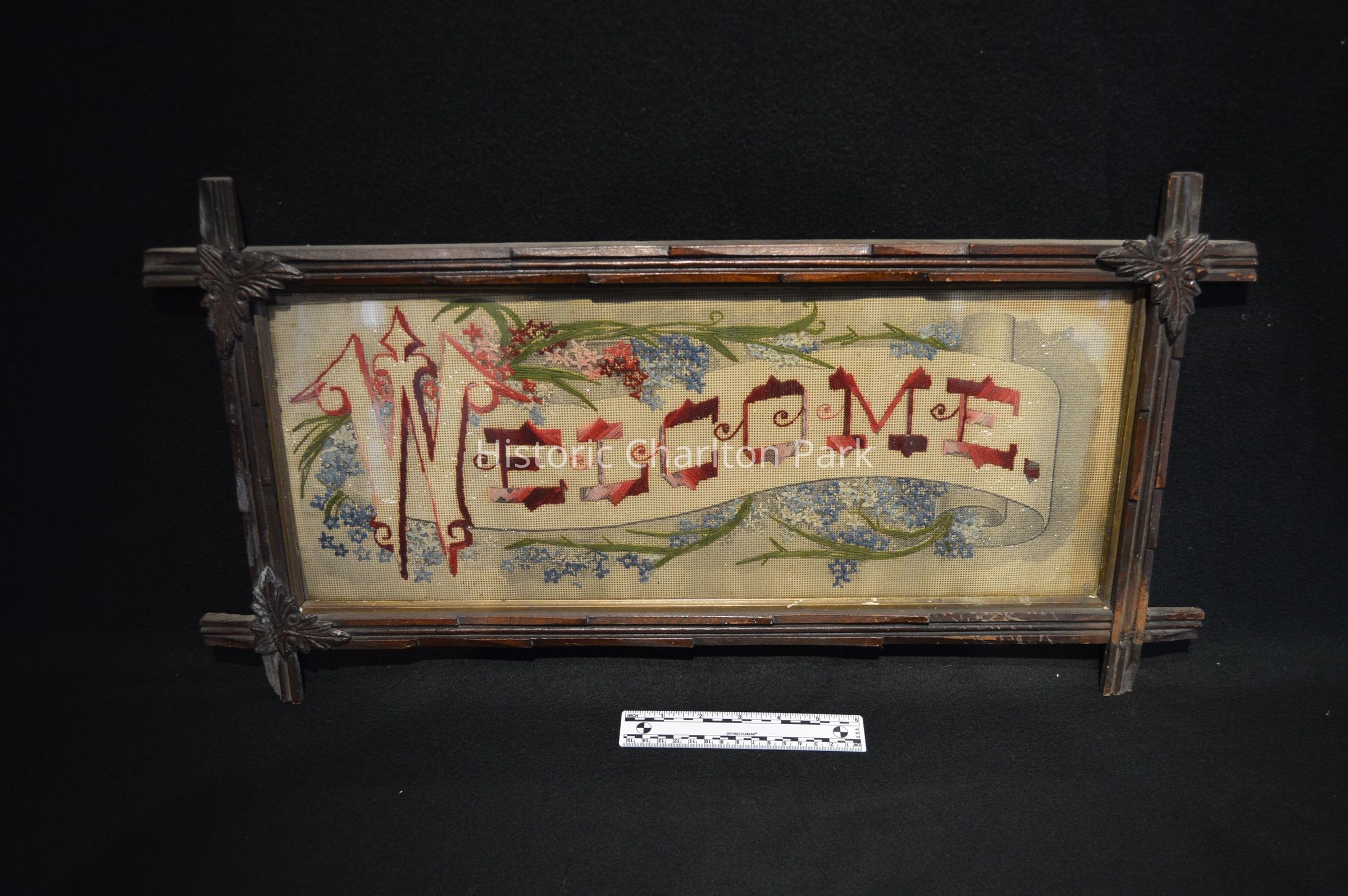 Victorian era motto sampler with the word "Welcome" embroidered in shades of red. There is a banner scroll behind it, and pink and blue flowers with green stems and leaves. There is something sparkly behind(?).