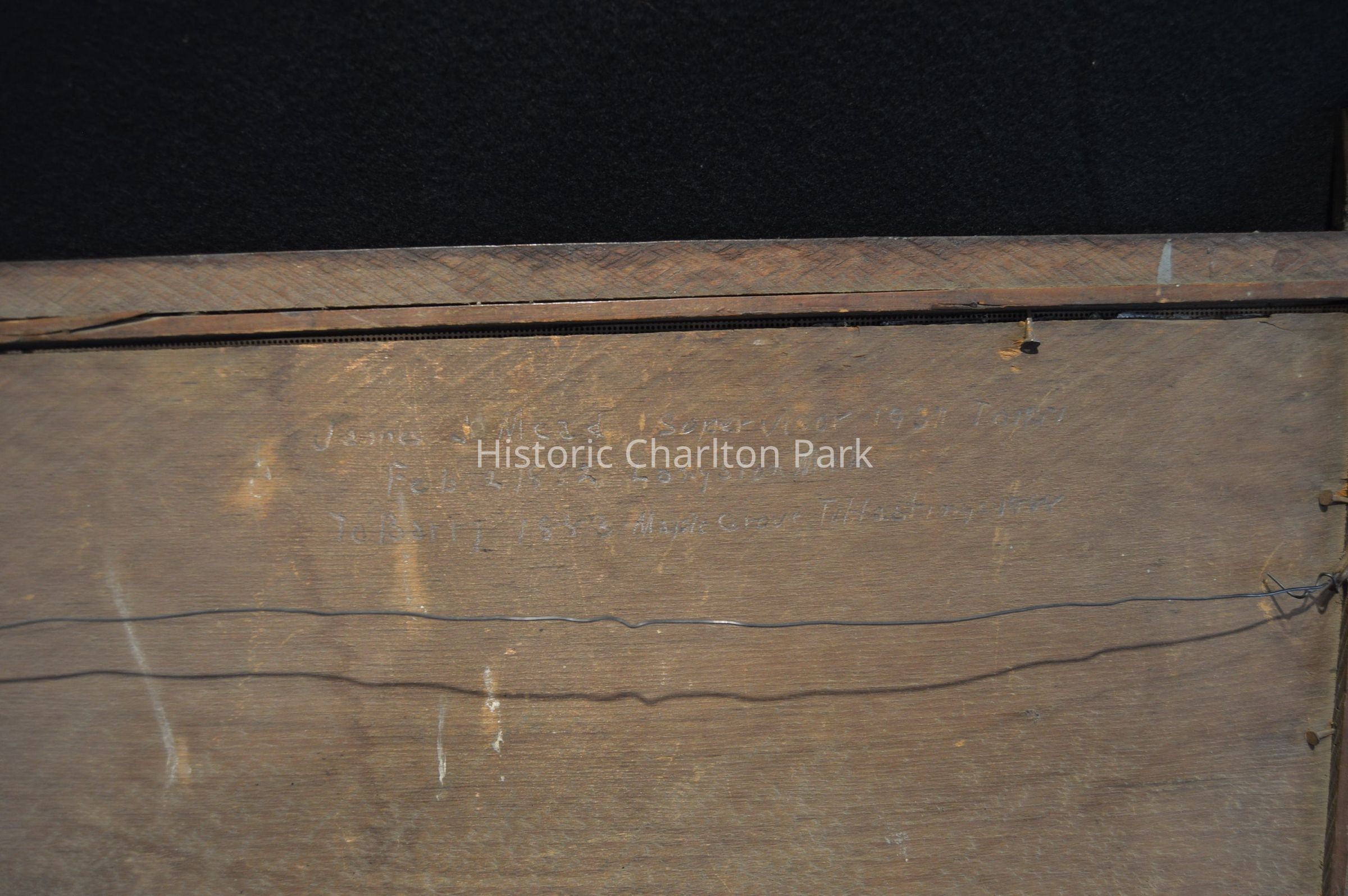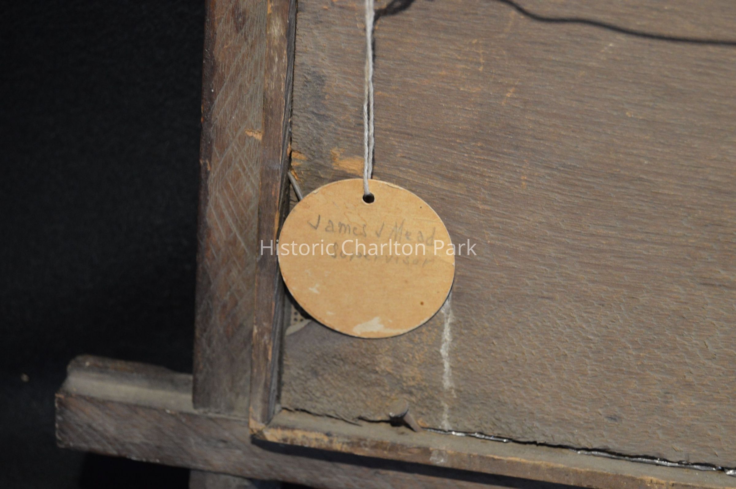 There is a tag attached that says "James J Mead, Supervisor," and there is text written on the wood on the back in pencil. "James J Mead Supervisor 1937 to 1951