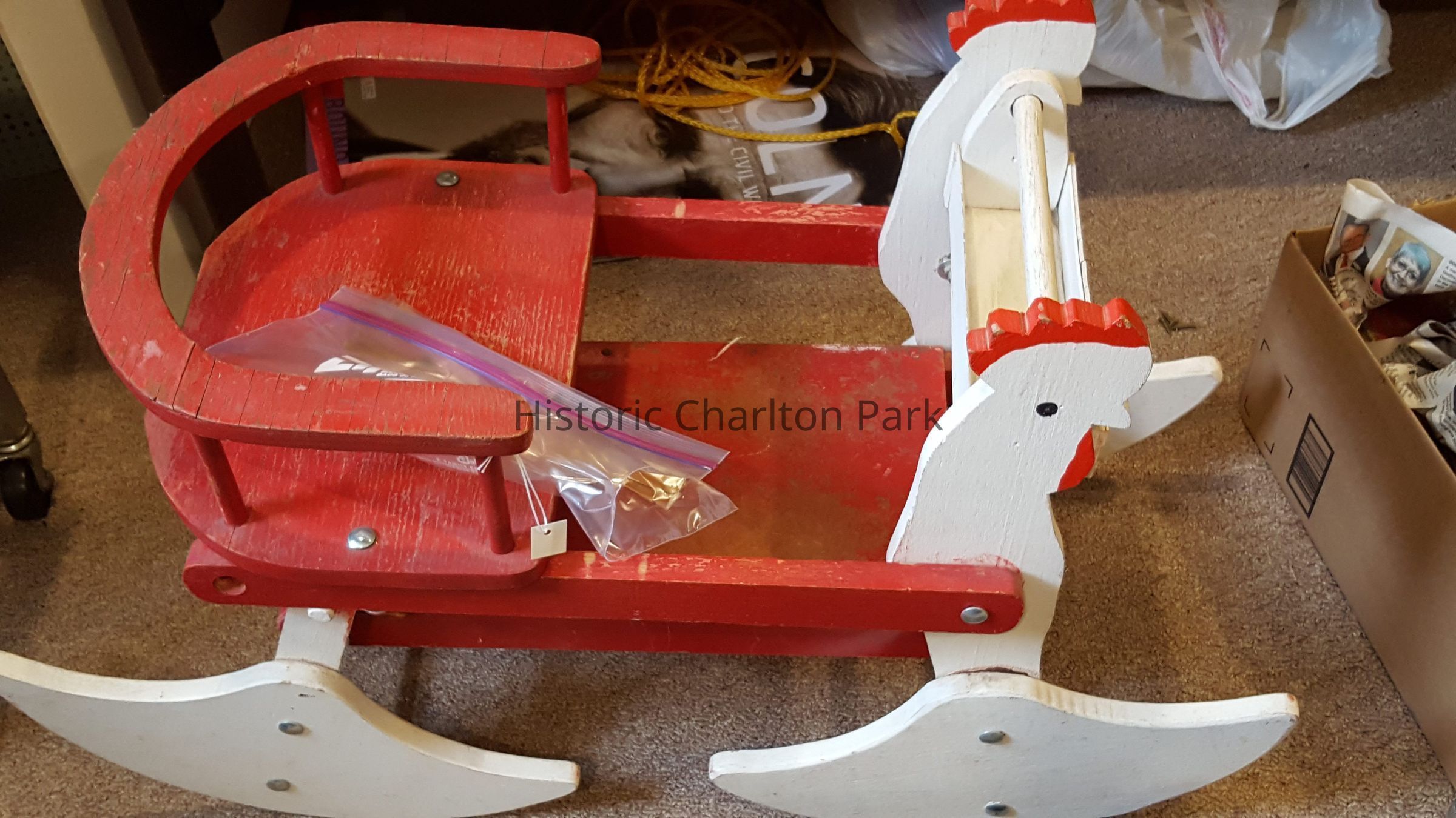 Wooden handmade riding chicken toy painted red and white.