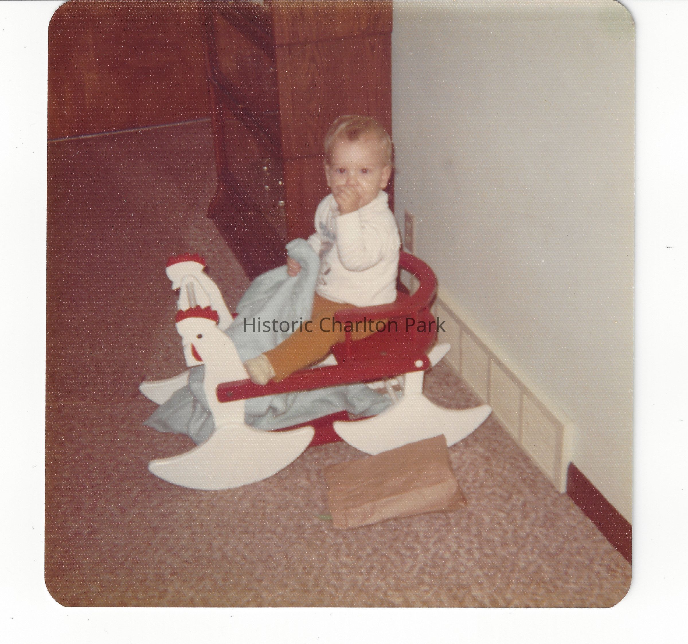 "About 1945, awaiting the birth of a second child, our father, George Wilson Spencer, decided to make a riding toy for his growing brood. While not a toy maker, he was handy with his hands, and created a rocking chicken in which his children could sit and rock. Dad painted the chicken red and white. A third child soon followed, and with three children, 2 years old and younger, the chicken was a diversion while our mother Viola (Day) Spencer made dinner, cleaned the house, etc. Judy remembers riding and rocking in the chicken when she could not have been more than 4 or 5. After Janet (Spencer) Foley and Donald Spencer outgrew the riding chicken, the toy was relegated to the loft in the barn on the property at the corner of Marshall and Dibble in Hastings. When Judy's first child, Lisa Sharp, was a toddler, the chicken was dug out of the loft. She repainted the fading colors, true to the red and white Dad had used. In January 1974, Judy snapped the only picture [attached to this record] we can find of the chicken with 14-month-old Robb rocking with his favorite blanket!