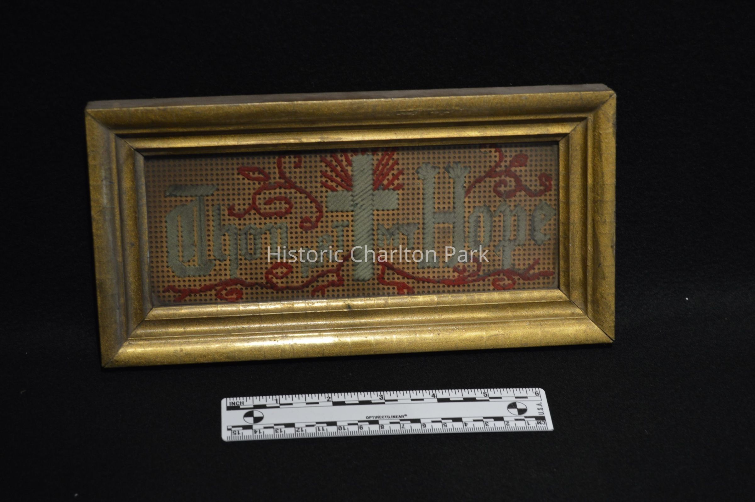 Victorian era motto sampler. The text "Thou art my Hope" is embroidered in blue, along with a cross in the center. There are some decorative vines and sunbursts in red thread. The sampler is much smaller than is usually seen of a sampler of this type. The frame is gold.