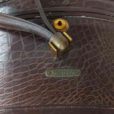 Round dark brown suitcase with faux alligator skin finish. The suitcase has metal clasps, a locking mechanism, a wristlet strap, and a metal plate from the manufacturer reading "SHWADER BROS. INC. / Samsonite / DENVER, COLORADO." The inside includes ecru fabric lining.Made/Created
