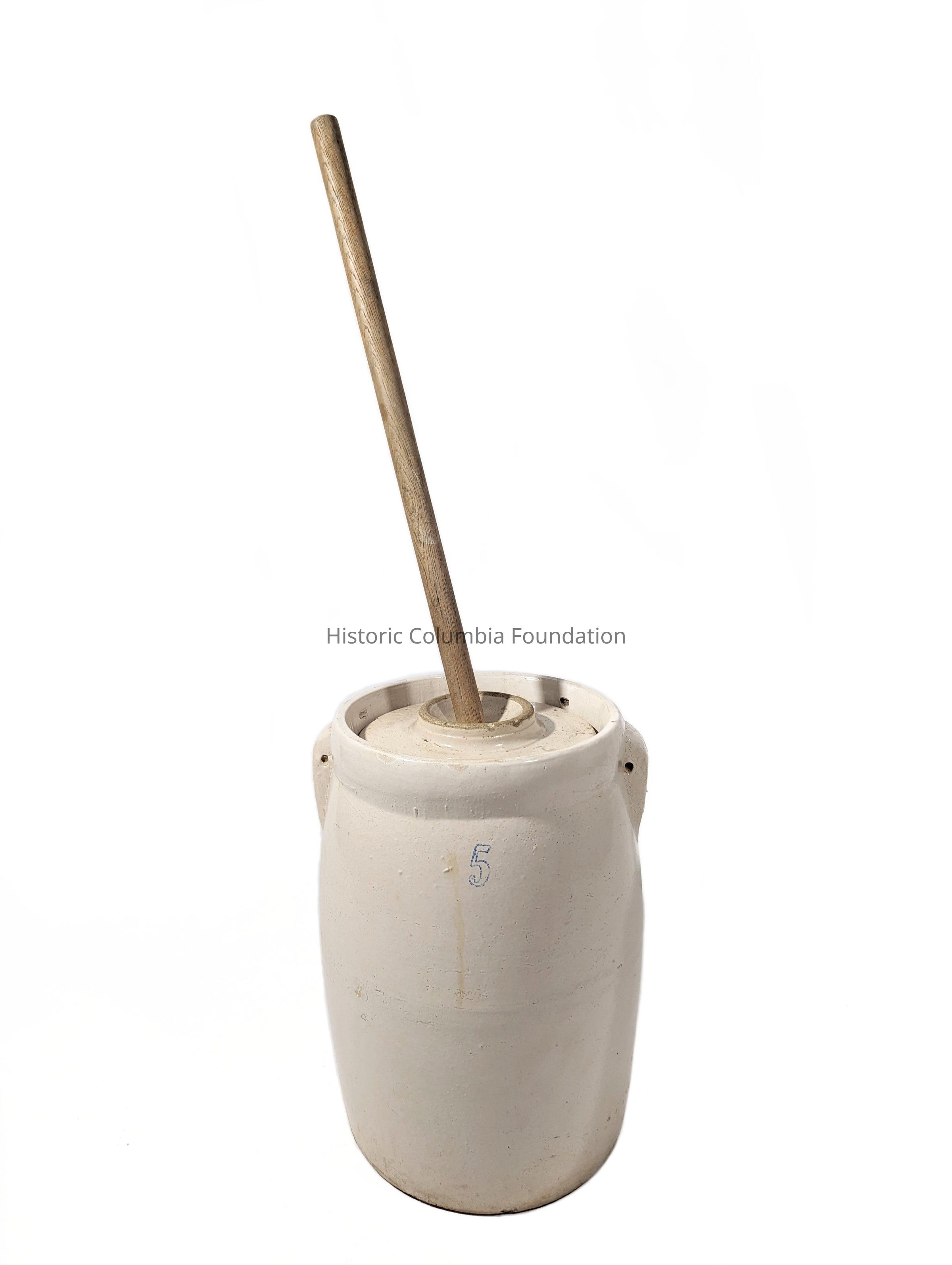 Ceramic butter churn with a cream color glaze. It contains a lid and a wooden dasher. A number five is printed in blue ink on the front, indicating the size.