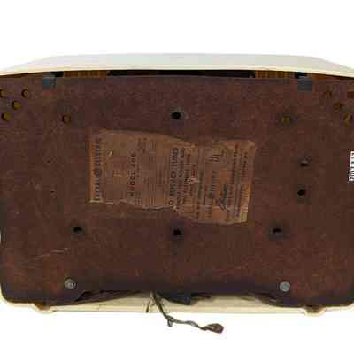 Rectangular ivory-colored table radio. The top half of the plastic radio front features an oval hole and vertical lines. The lower half includes two knobs as well as radio frequency numbers 55, 70, 90, 130, and 160 above the line and 60, 80, 100, and 140 below the line. Underneath this, the name "GENERAL ELECTRIC" and the company logo appear in gold letters. The back of the radio includes a GE sticker and an opening for the power cord.