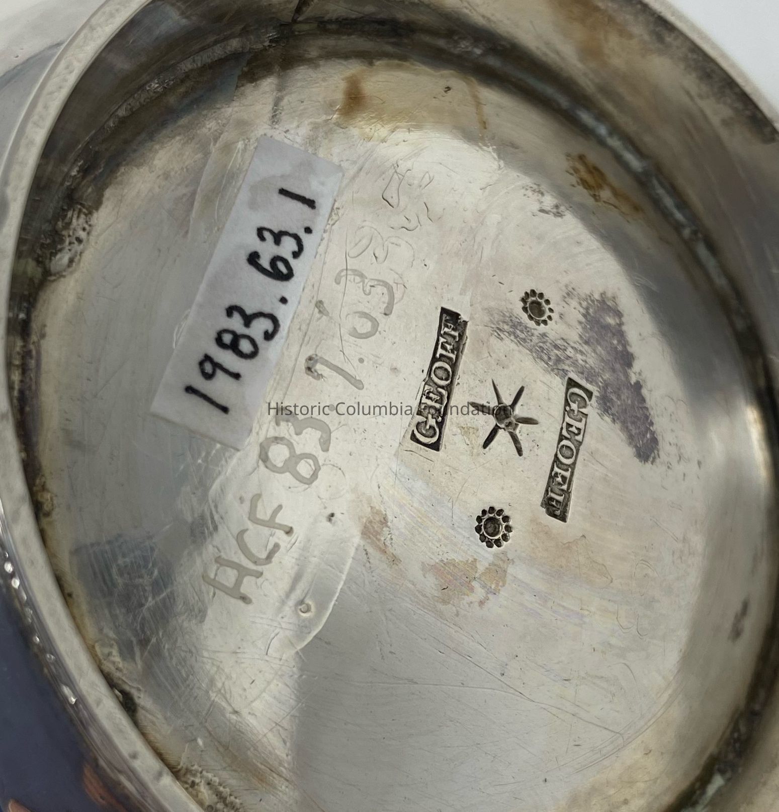 Given that her initials match the inscription on the side of the drinking vessel, Caroline Martha Hampton (1807–1883) likely owned this cann before it was passed down through the Hampton family. The mug was made by Garret Eoff (1779–1845) of New York. Although the exact operating dates of his business are not known, most of his work is dated between around 1810 and 1820.