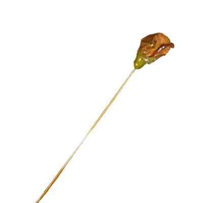 Hatpin with a red and gold rose at the top. The word "Delamothe" is written on the stem of the hatpin.Use