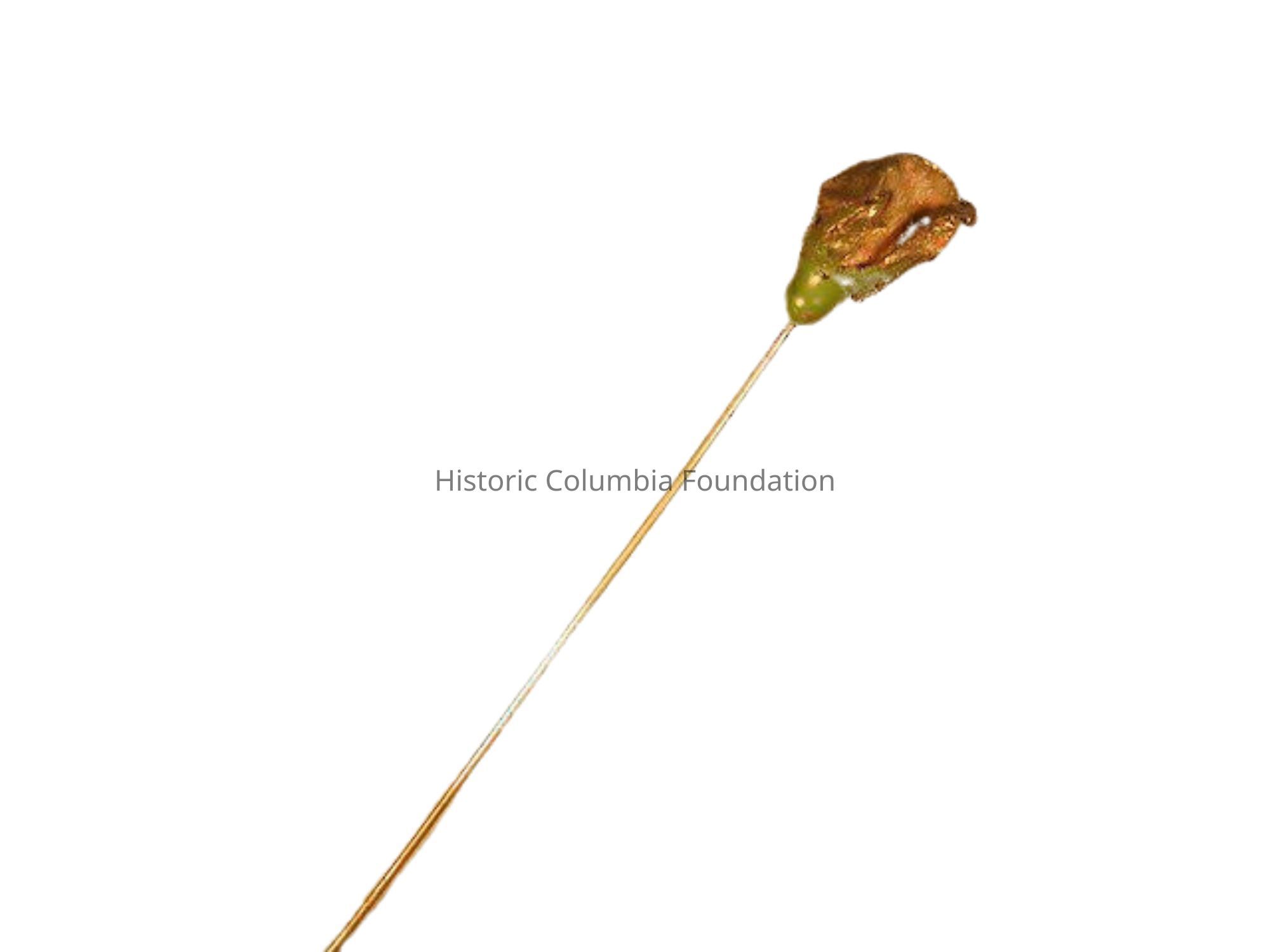 This hatpin was produced by Delamothe Natural Art Decorating Company Inc. using a live rose. Founded in 1908 by professor and prominent French-American electrometallurgical scientist Louis G. Delamothe (1861–1928), the Delamothe company took off in the heart of the so-called "rose district" in Spokane, Washington. During his business's brief time in operation, Delamothe advertised that he had capacity to make up to 1,500 "real rose hat pins" a day and that his selection of metallized rose hat pins came in six sizes and five different colors. While stores continued to stock Delamothe's wares for several years, he closed the business by 1910.Dimensions