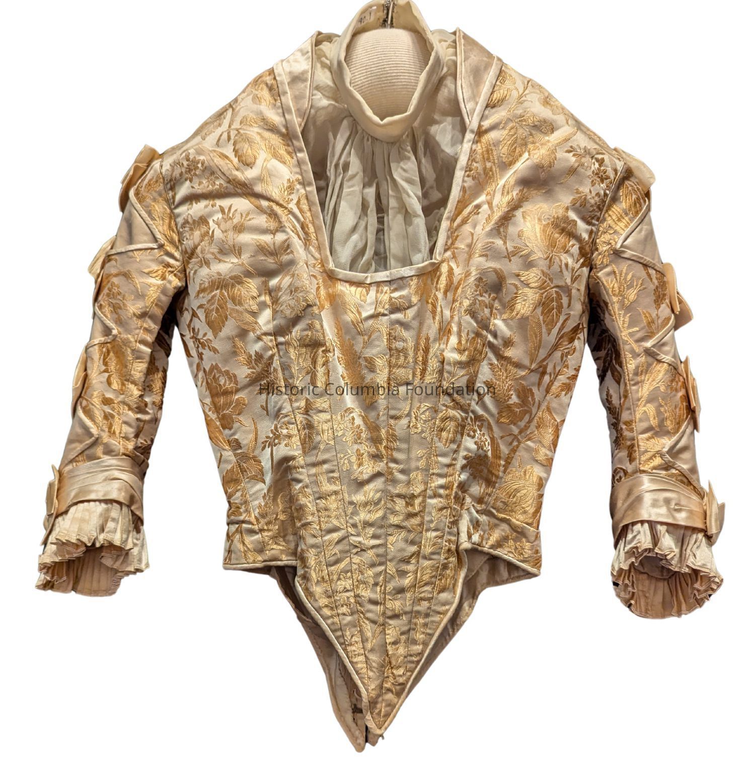 Two piece embroidered satin wedding dress with lace and bead decoration. The satin is embroidered in gold with a flower and leaf pattern. The bodice has built-in stays constructed with a center seam and two seams on either side. It features a square neckline which is decorated with a white satin collar. There are four bows along the outer edges of the elbow-length sleeves. The skirt has a ruffled white satin hem and an overskirt of beaded white tulle. The skirt gathers into a bustle at the back which is decorated with rosettes and three large ruffles.Context