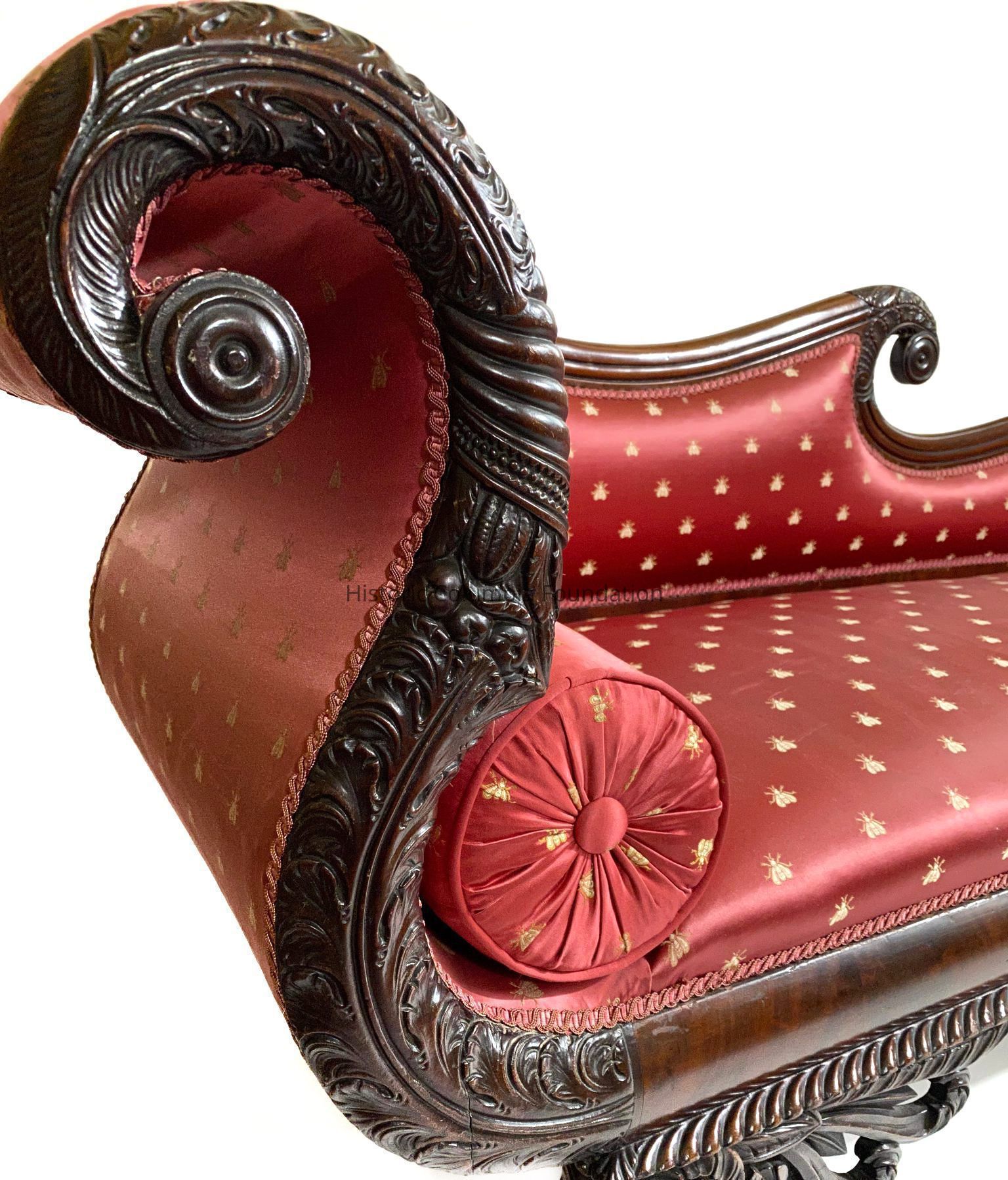 Matching pair of mahogany framed, Empire style "méridiennes" (loungers). The backs are of a double scroll design with rolled high ends. The face of the frames of the rolled high ends have carved cornucopias and foliage designs. The front legs are carved lions paws with scrolling fern fronds. They have been reupholstered in Scalamandré rose color silk with a bee pattern.Use